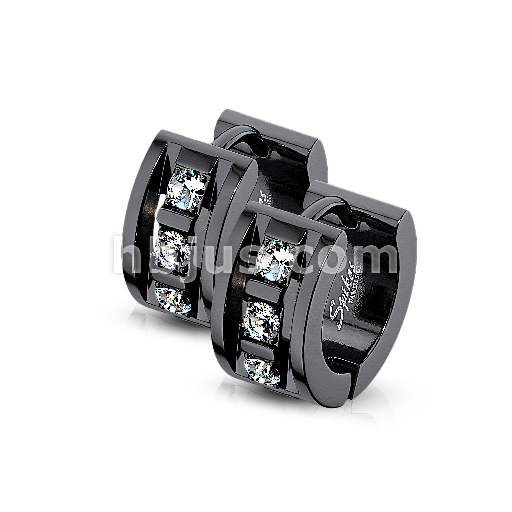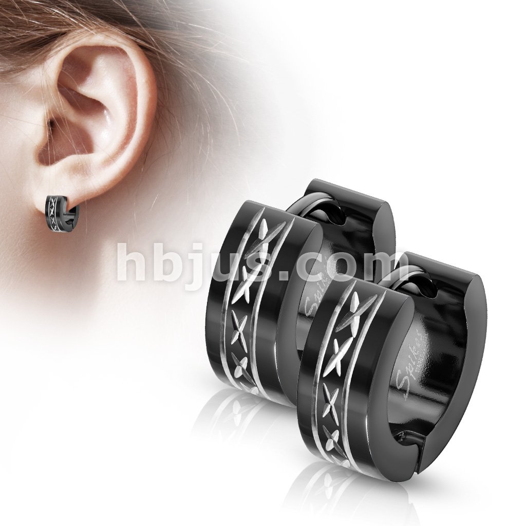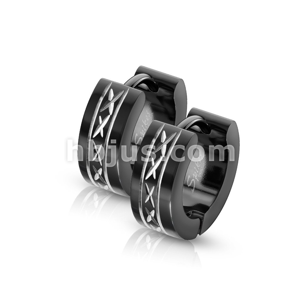 Pair of 316L Stainless Steel Black Hinged Hoop Wide Earrings with Dia-Cut and Grooved Center