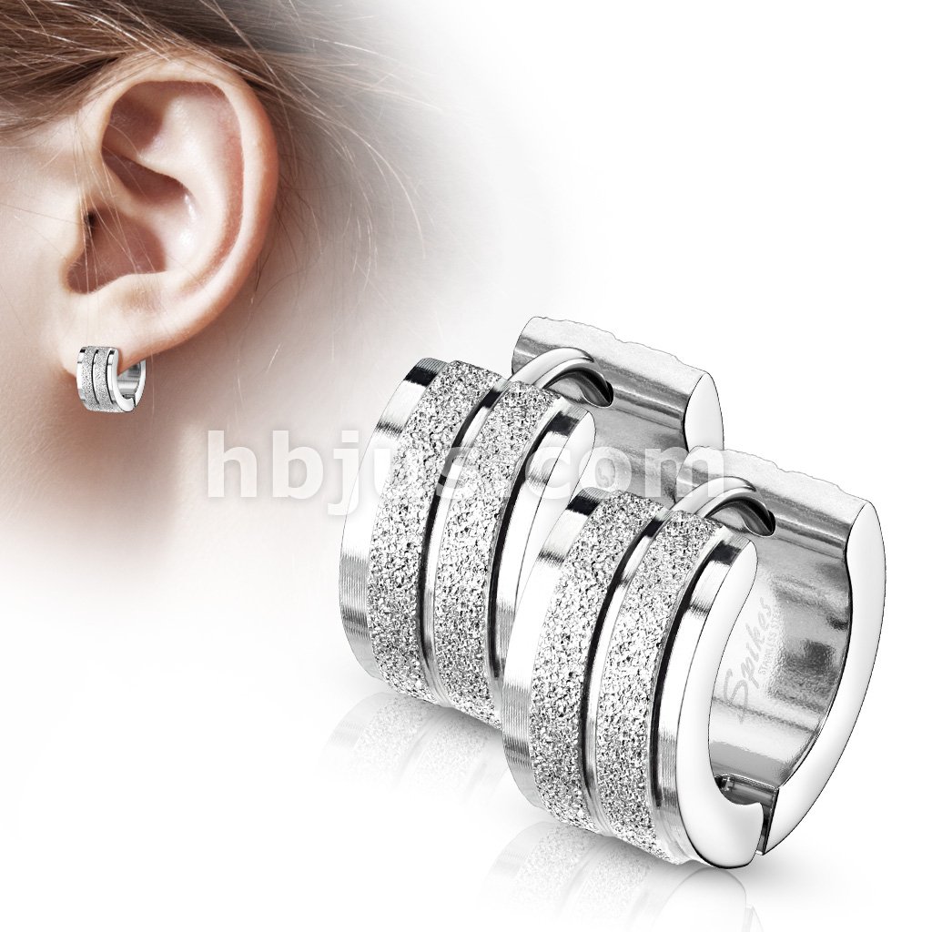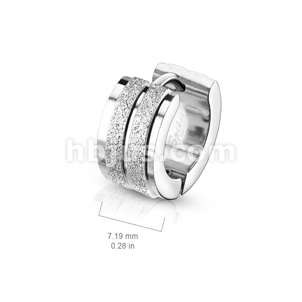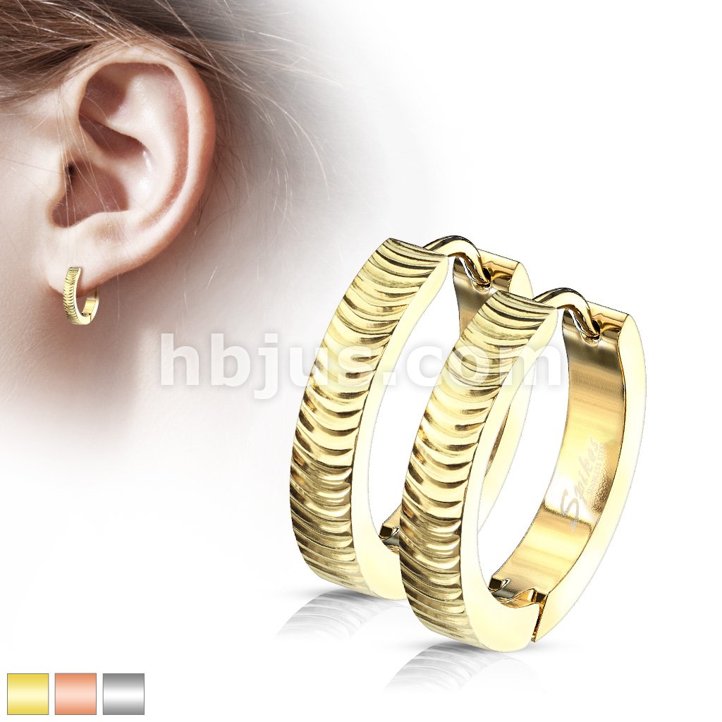 Pair of Sandblasted Center with Grooved Line and Stepped Edges Stainless Steel Hinge Action Hoop Earrings