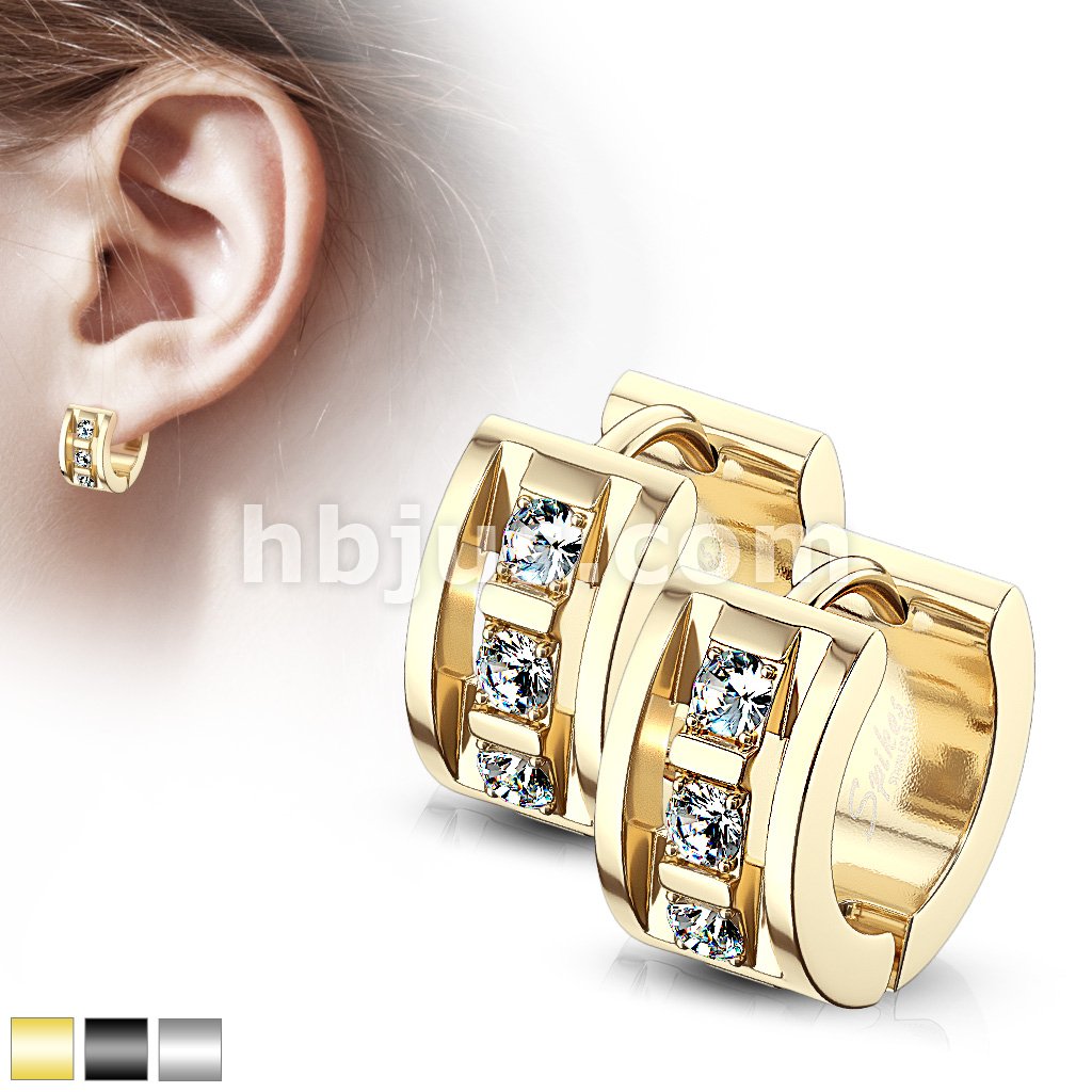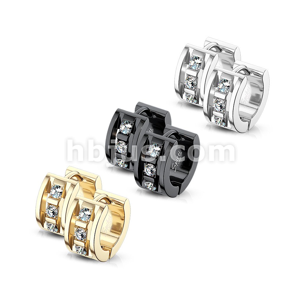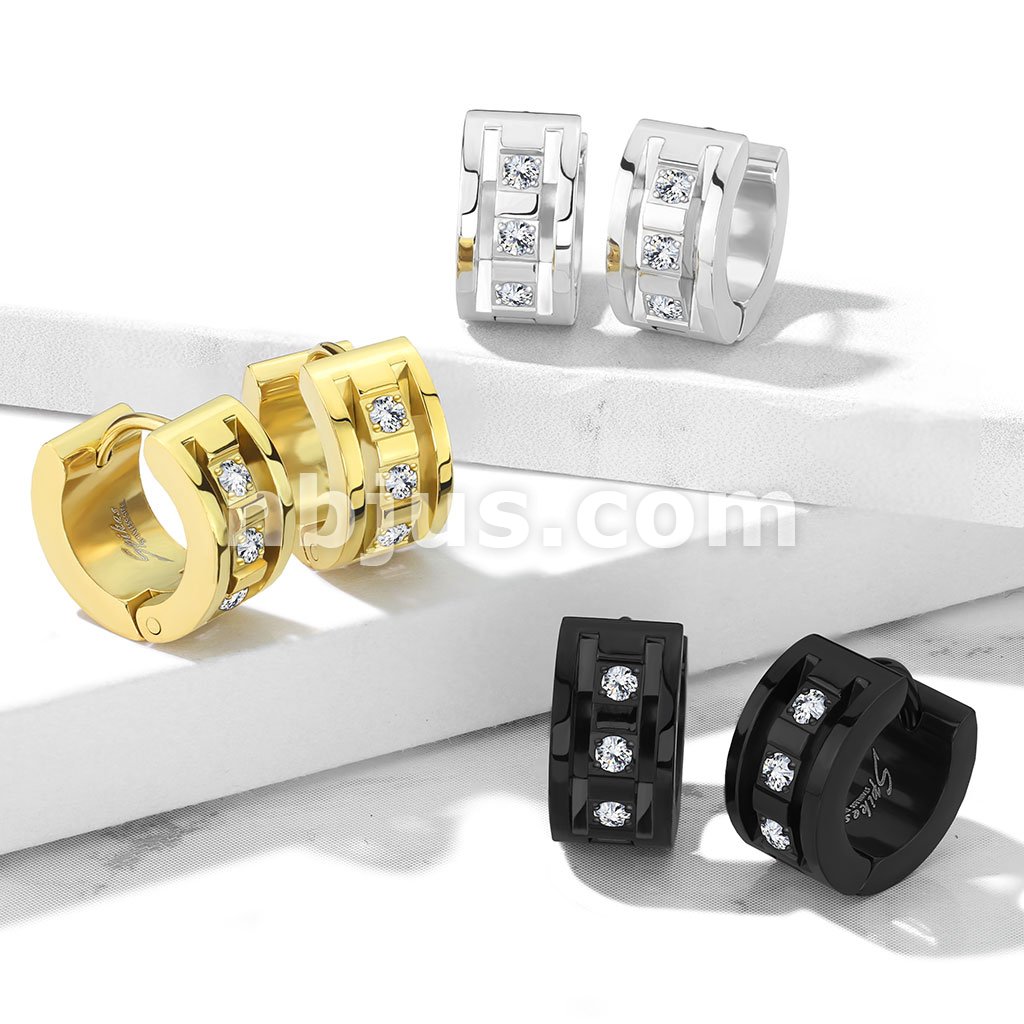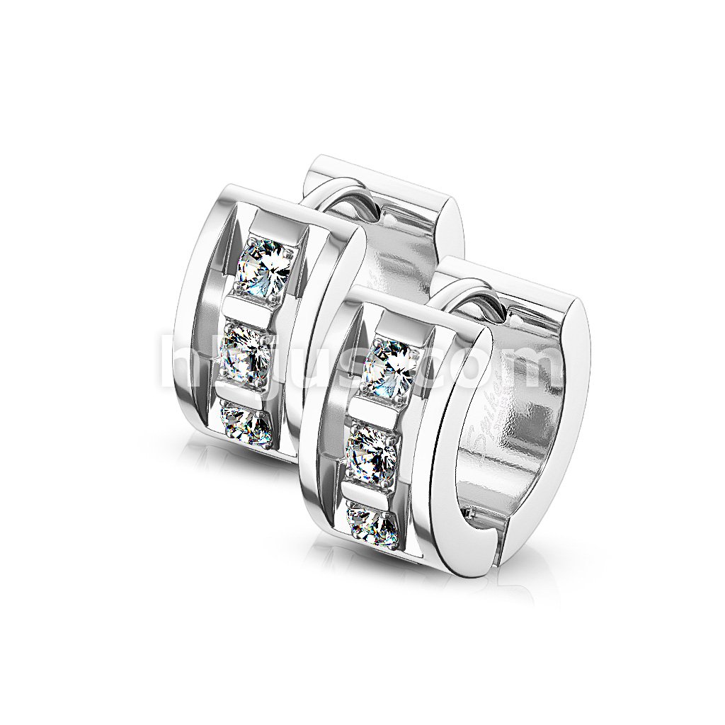 Pair of 3 CNC Set Clear CZ 316LStainless Steel Hinge Action Hoop Earrings