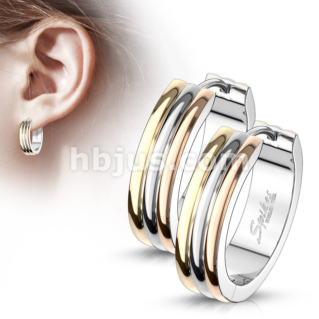 Pair of Triple Dome 3-Tone 316LStainless Steel Hinge Action Hoop Earrings