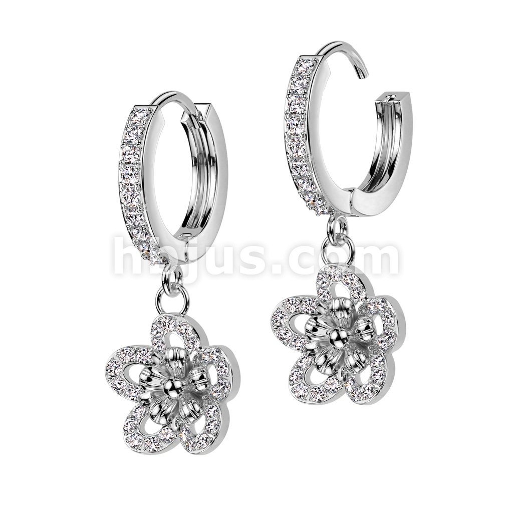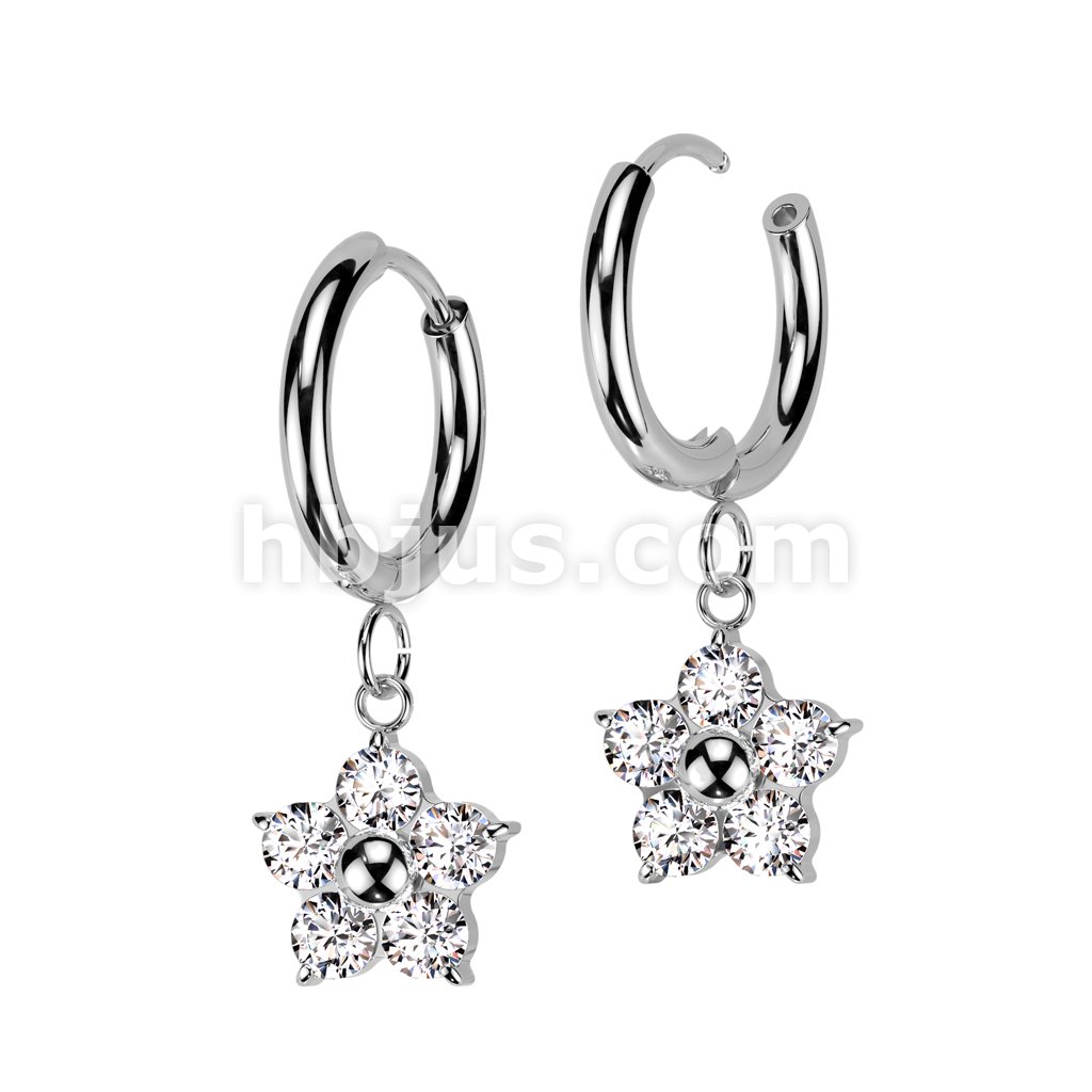 Pair of 316L Stainless Steel Hinged Hoop Earrings With CZ Flower Dangle