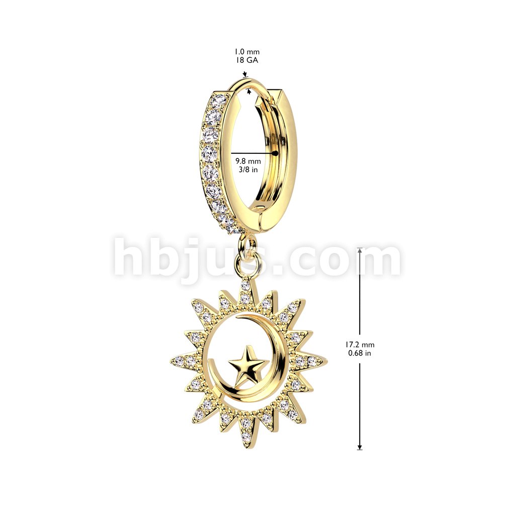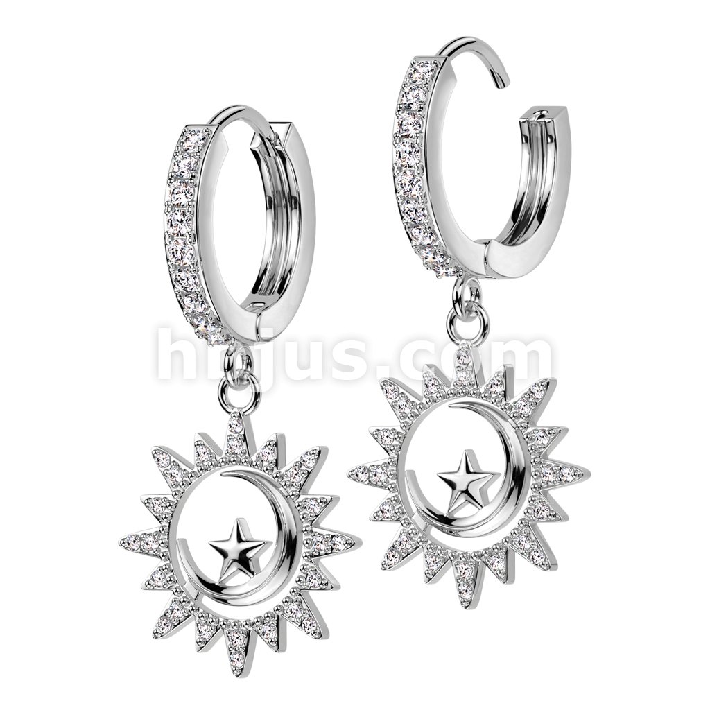 Pair of CZ Pave Front With CZ Pave Sun and Crescent Moon With Star Center Dangle Hoop Earrings