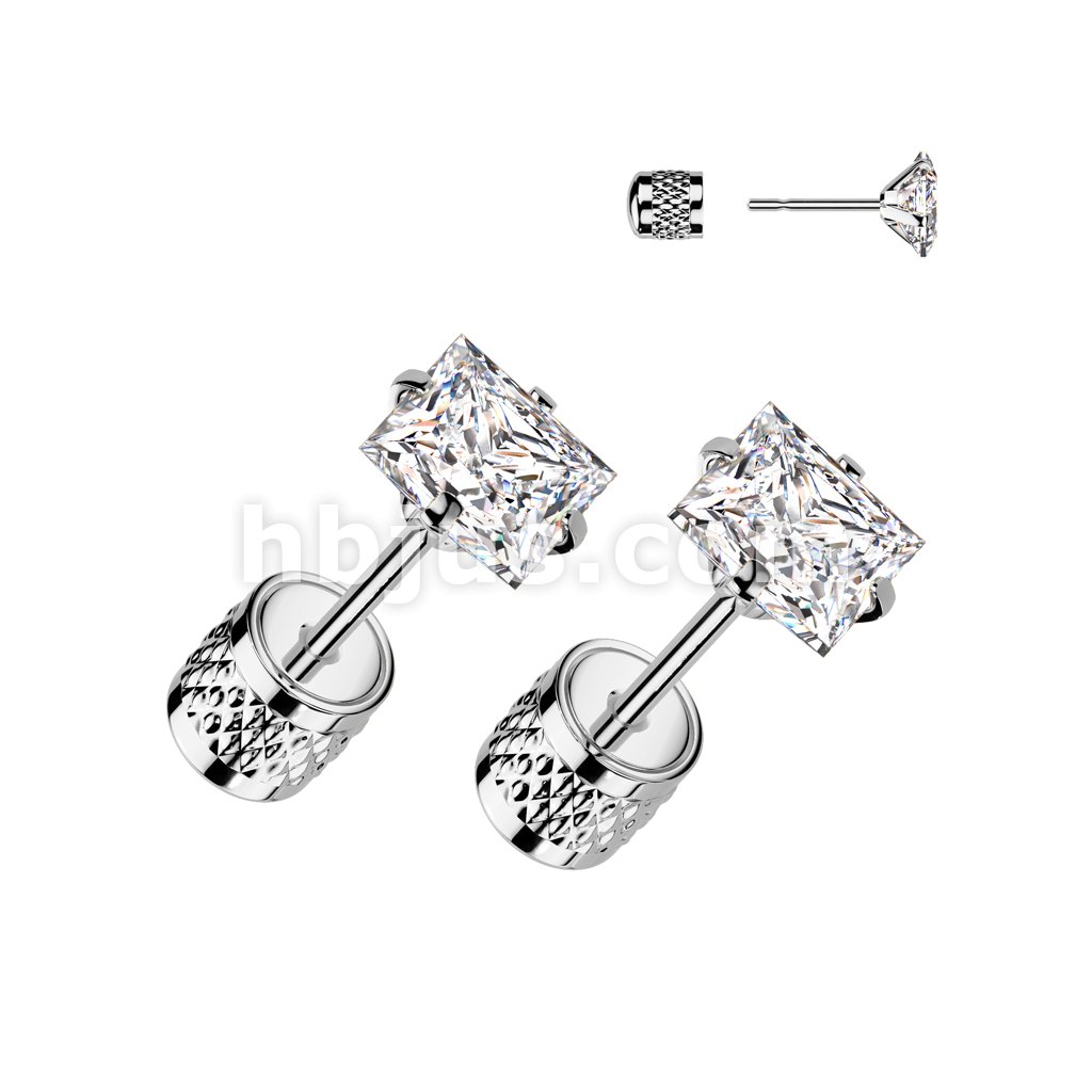 Pair of Square Prong Set Clear CZ Top 316L Surgical Steel Earrings With Cylinder Clip Backing