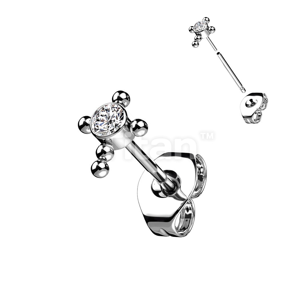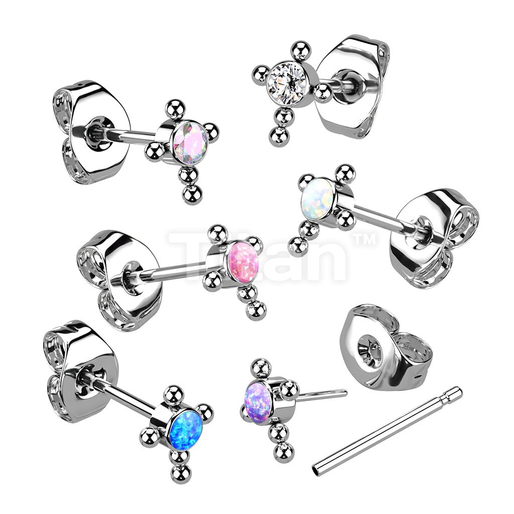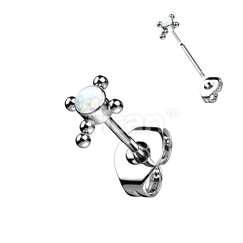 1pc Implant Grade Titanium Threadless Earring Stud With CZ or Opal Center Beaded Ball Cross Top