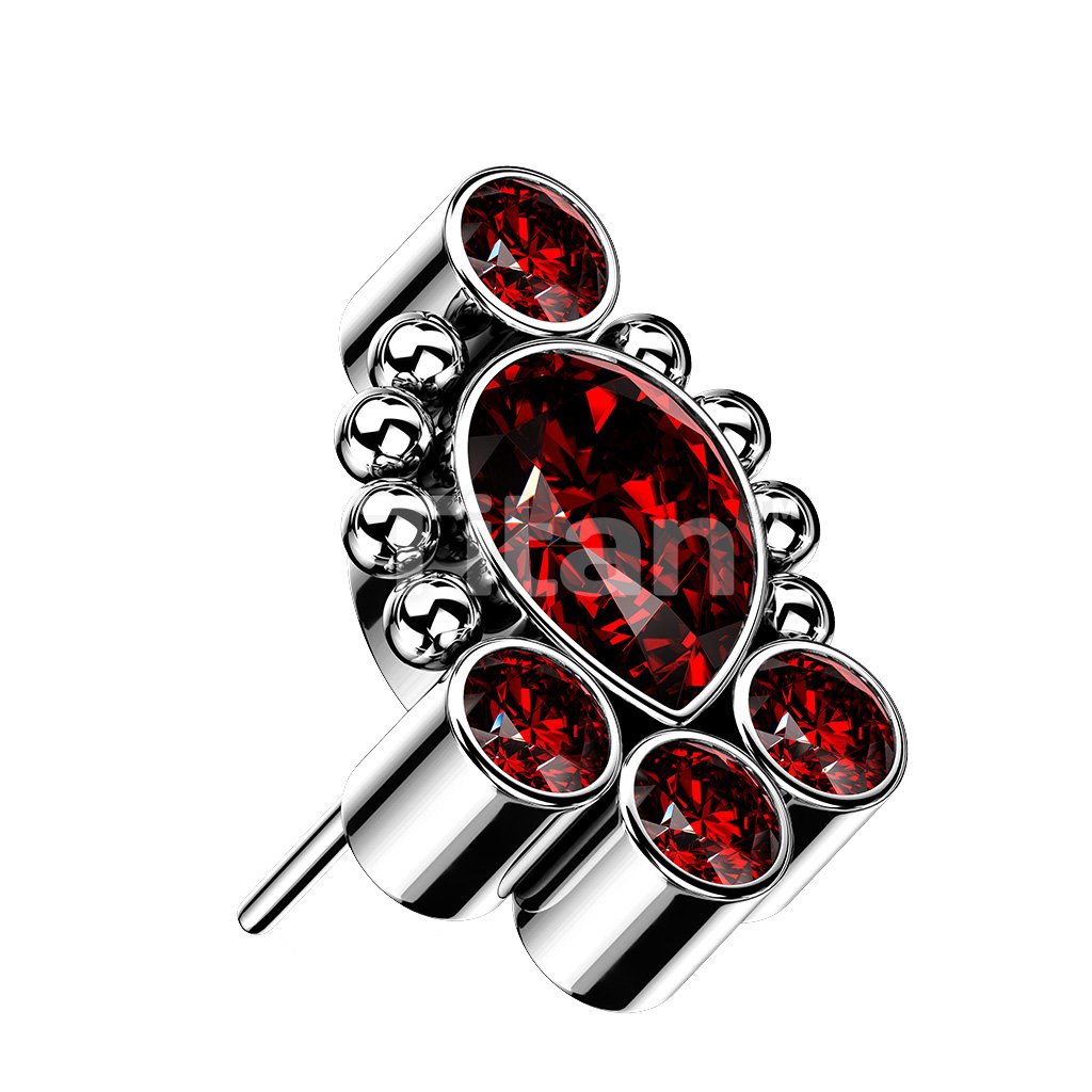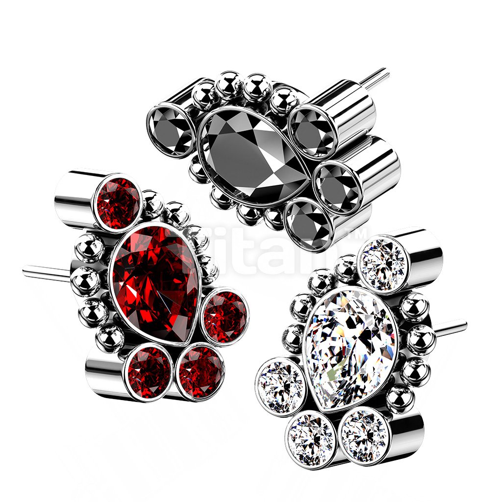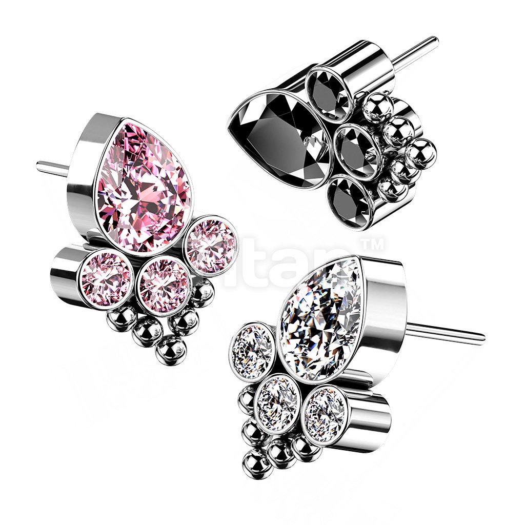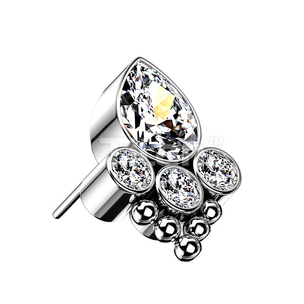 Implant Grade Titanium Threadless Push In Bezel Set CZ Cluster With Pear Shaped Center and Beaded Ball Edge Top
