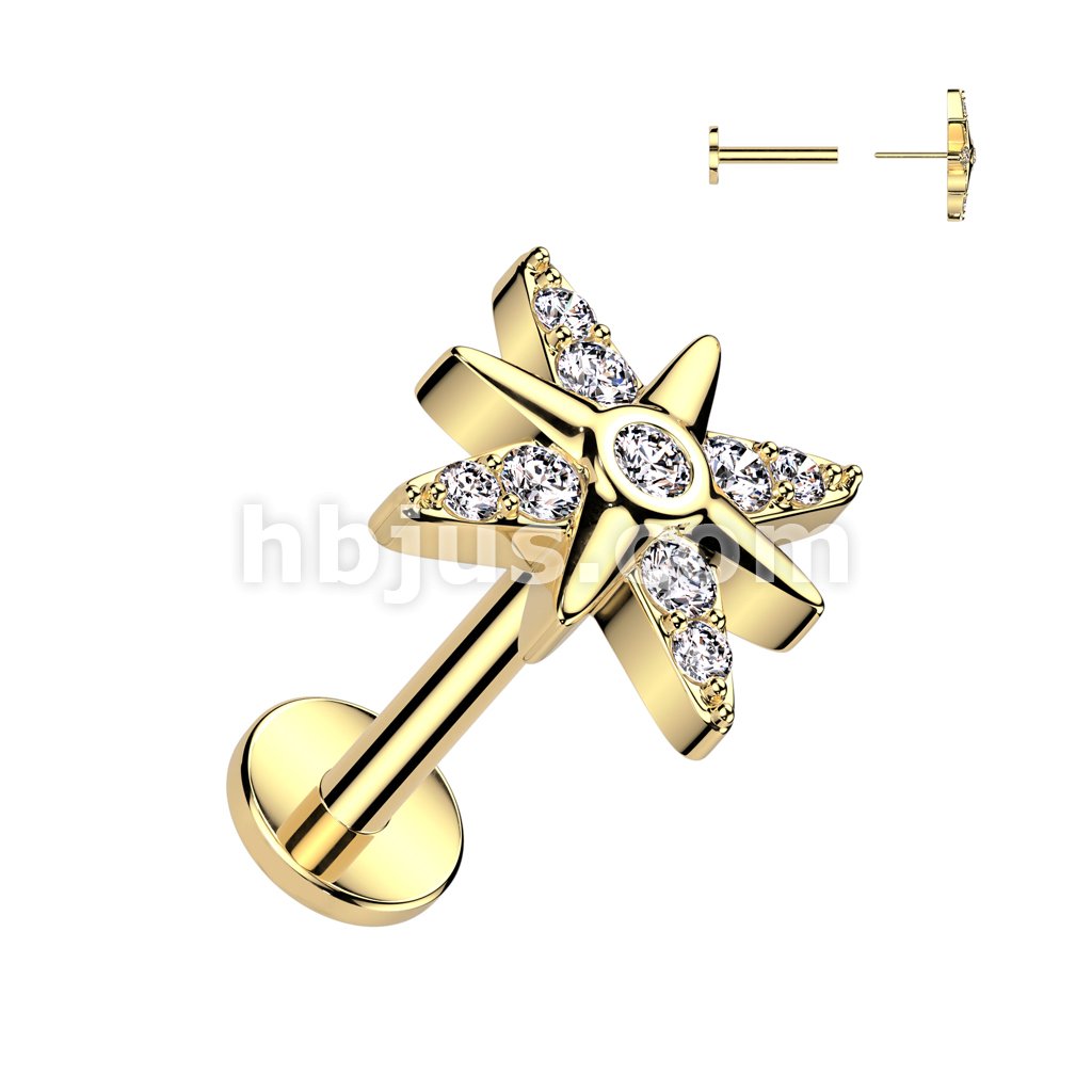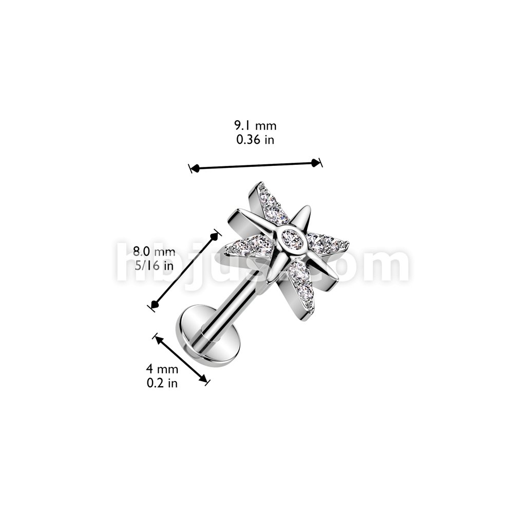 316L Surgical Steel Threadless Push In Labret, Flat Back Stud With CZ Starburst Top
