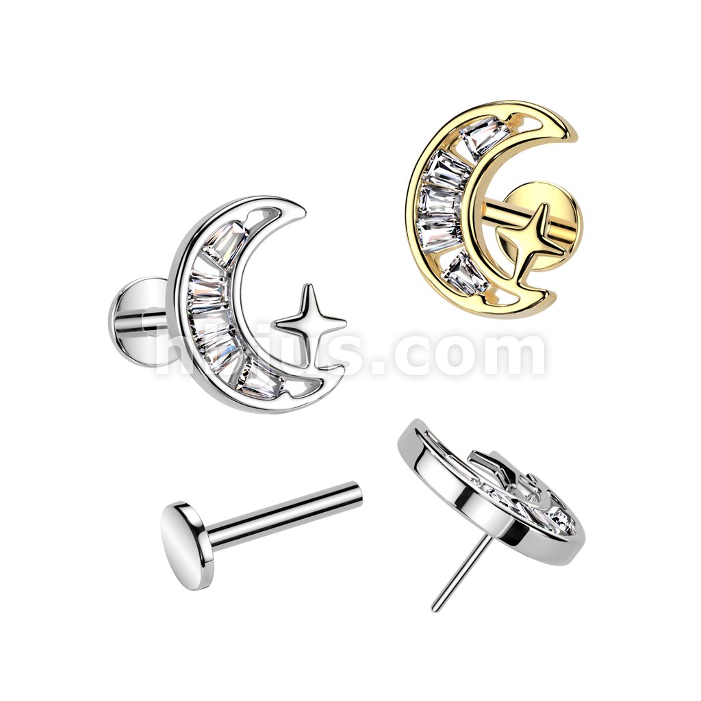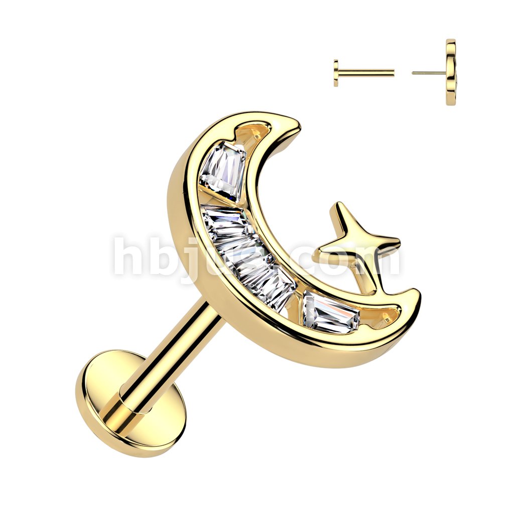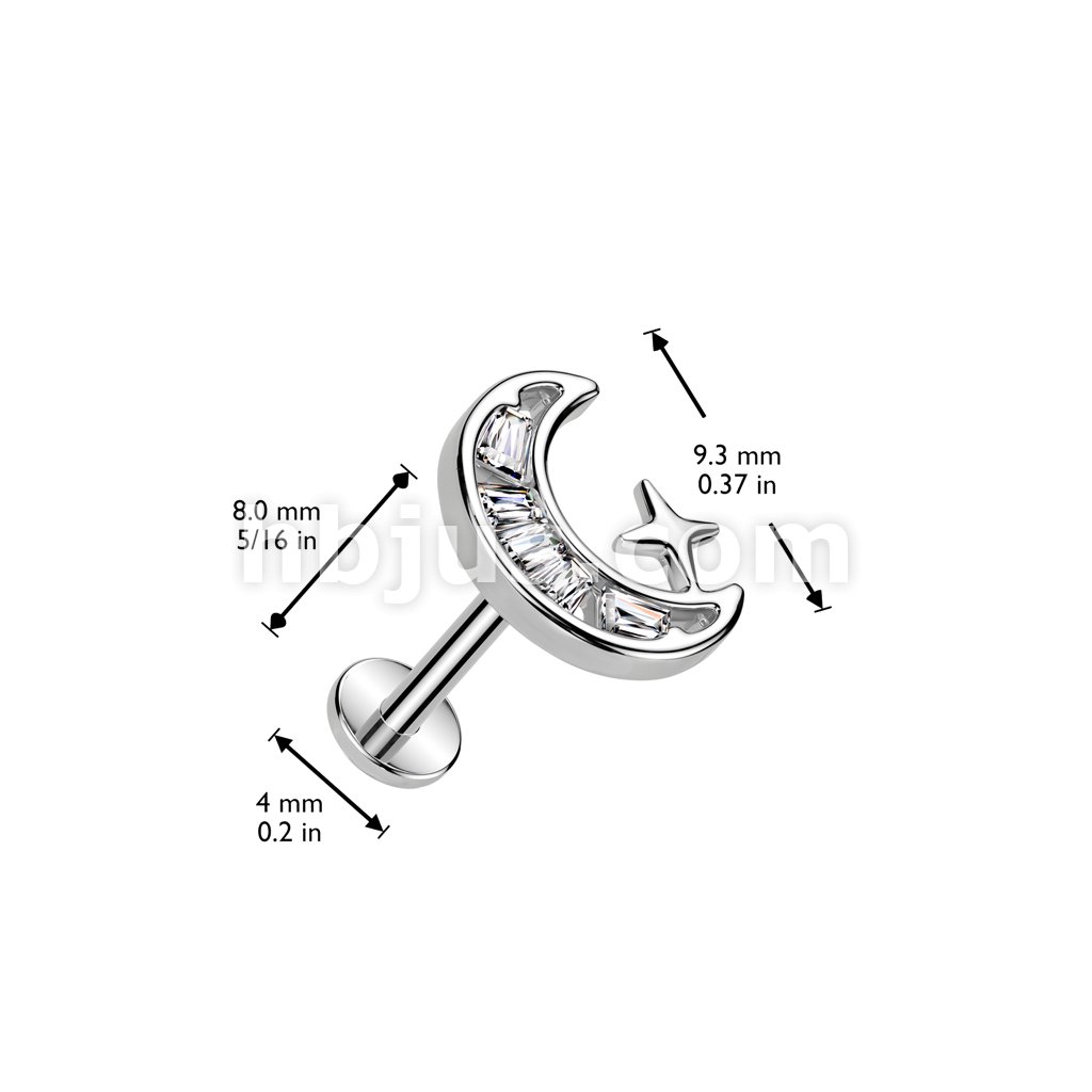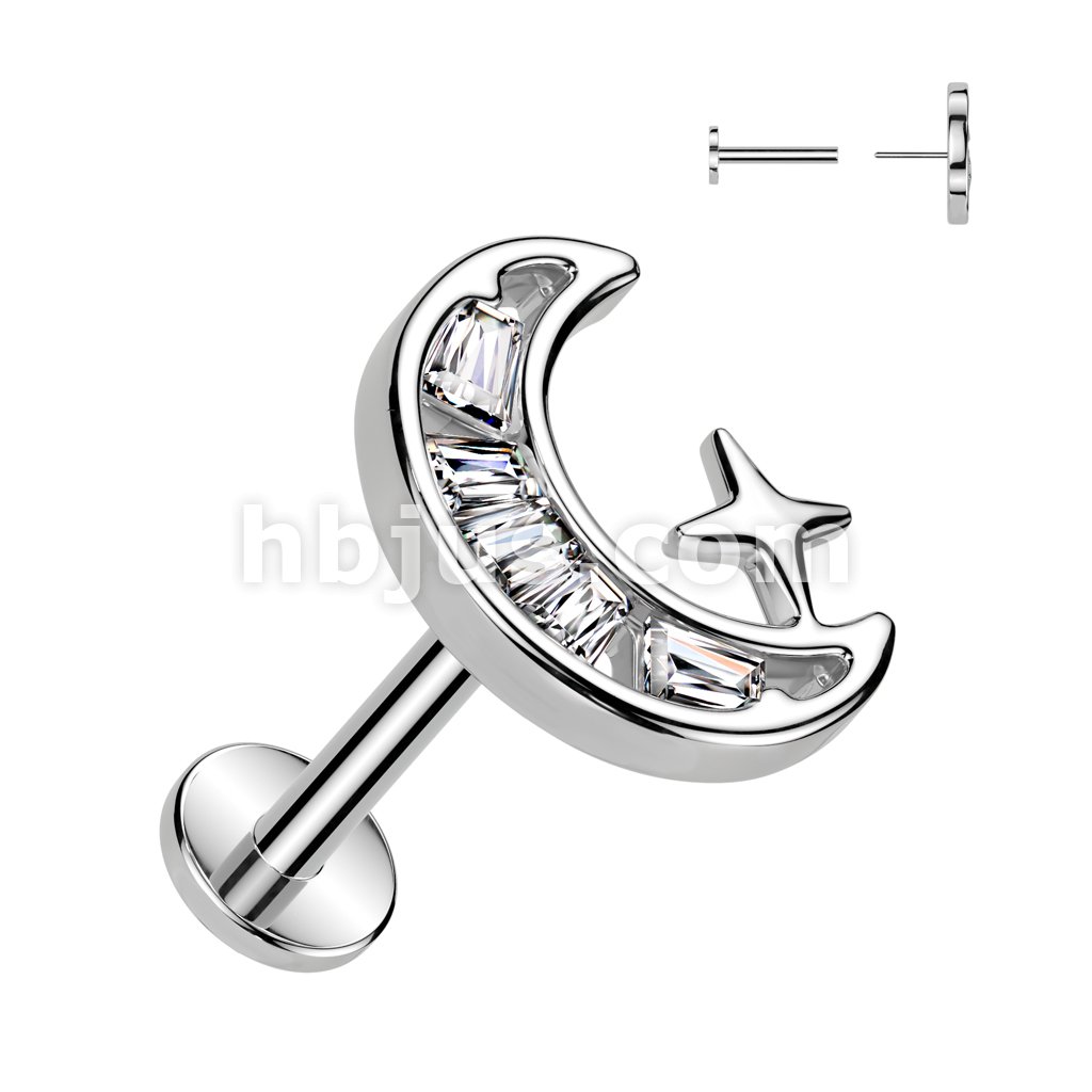 316L Surgical Steel Threadless Push In Labret, Flat Back Stud With CZ Crescent Moon Top