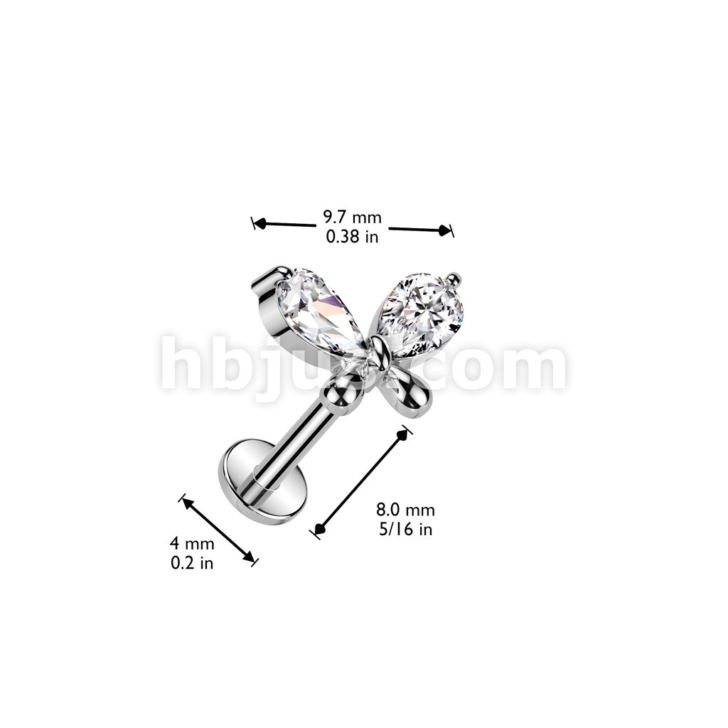 316L Surgical Steel Threadless Push In Labret, Flat Back Stud With CZ Butterfly Top