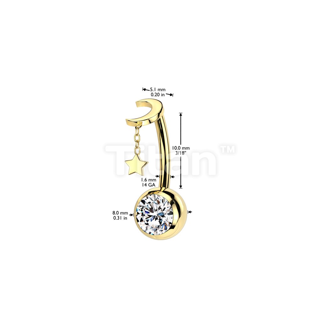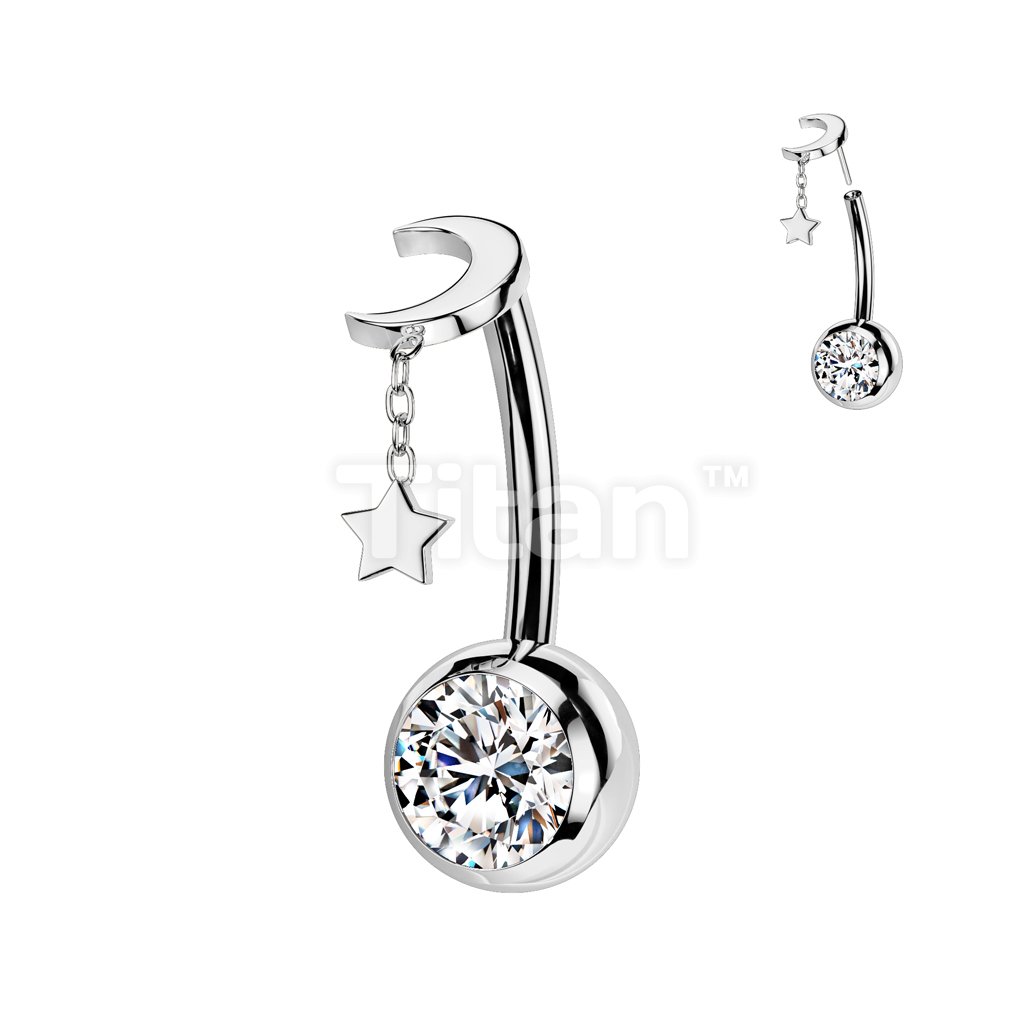 Implant Grade Titanium Threadless Push In CZ Bezel Set Belly Button Ring With Crescent Moon And Star Dangle Top