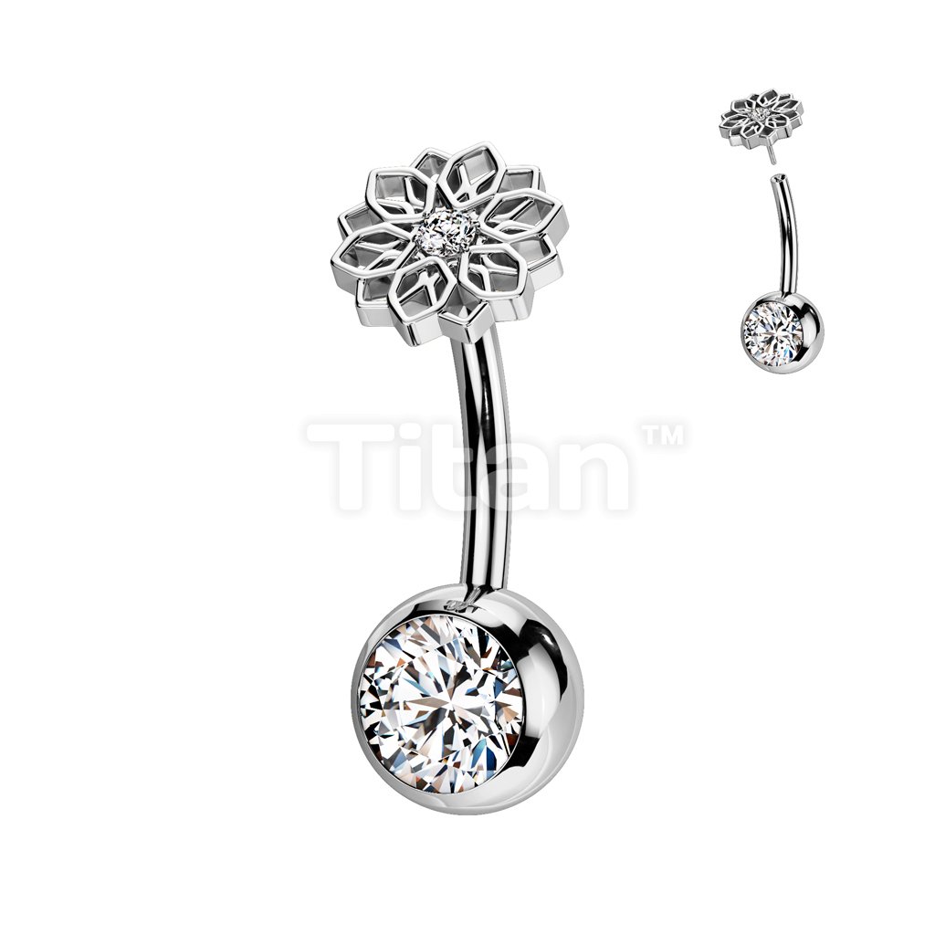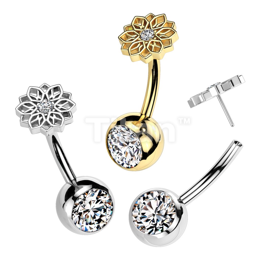 Implant Grade Titanium Threadless Push In CZ Bezel Set Belly Button Ring With CZ Center Lotus Flower Top