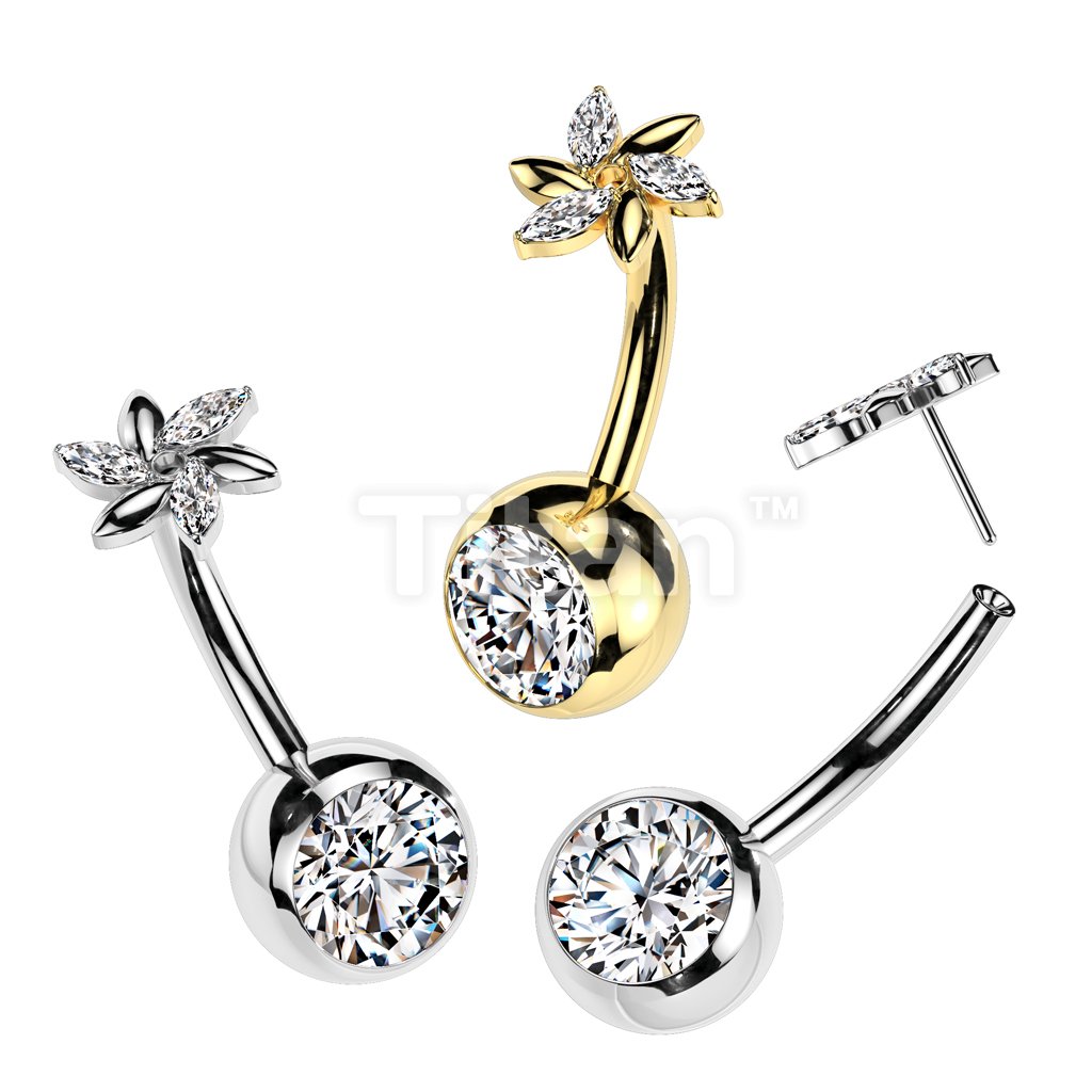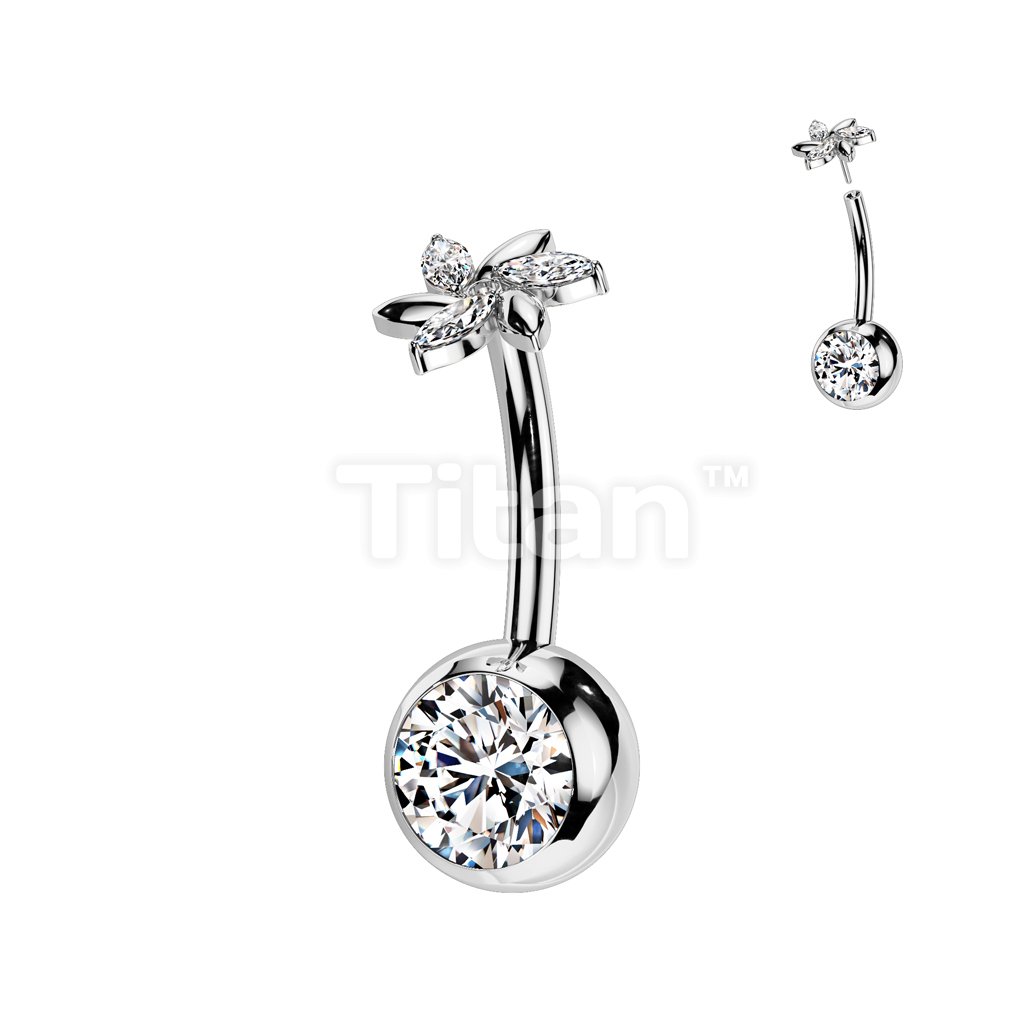 Implant Grade Titanium Threadless Push In CZ Bezel Set Belly Button Ring With Swirl Flower And Marquise CZ Top