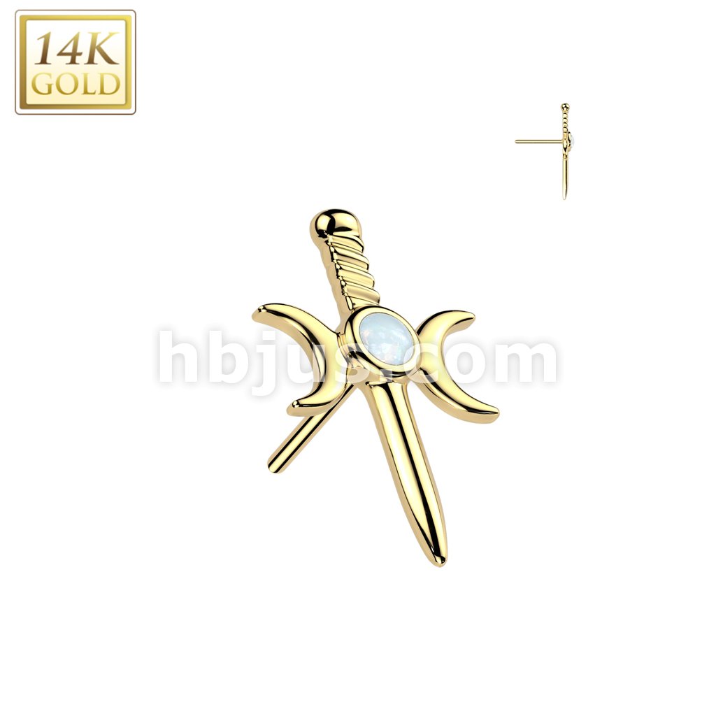 14K Gold Threadless Push In Crescent Moon Dagger With Opal Center Top