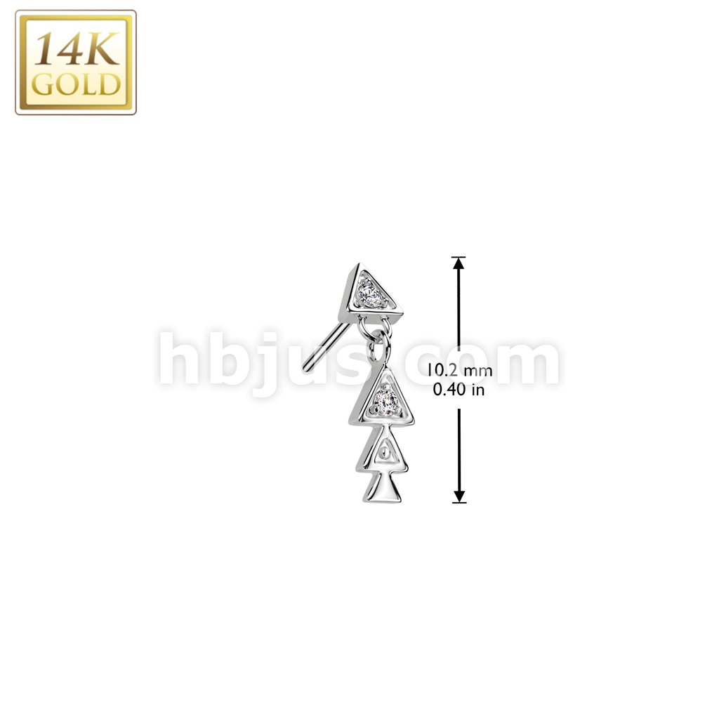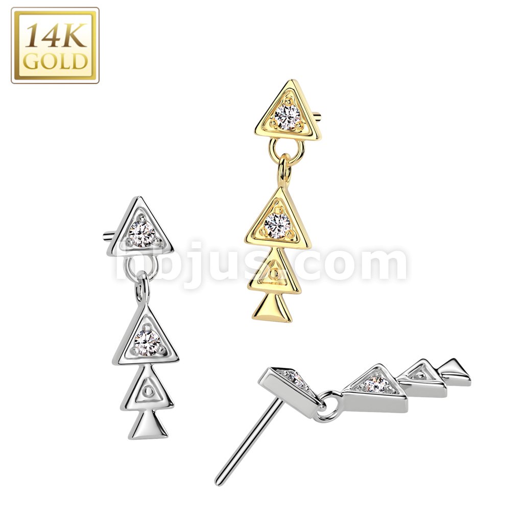 14K Gold Threadless Push In Bezel Set Triangle CZ Top With Triple Triangle Dangle