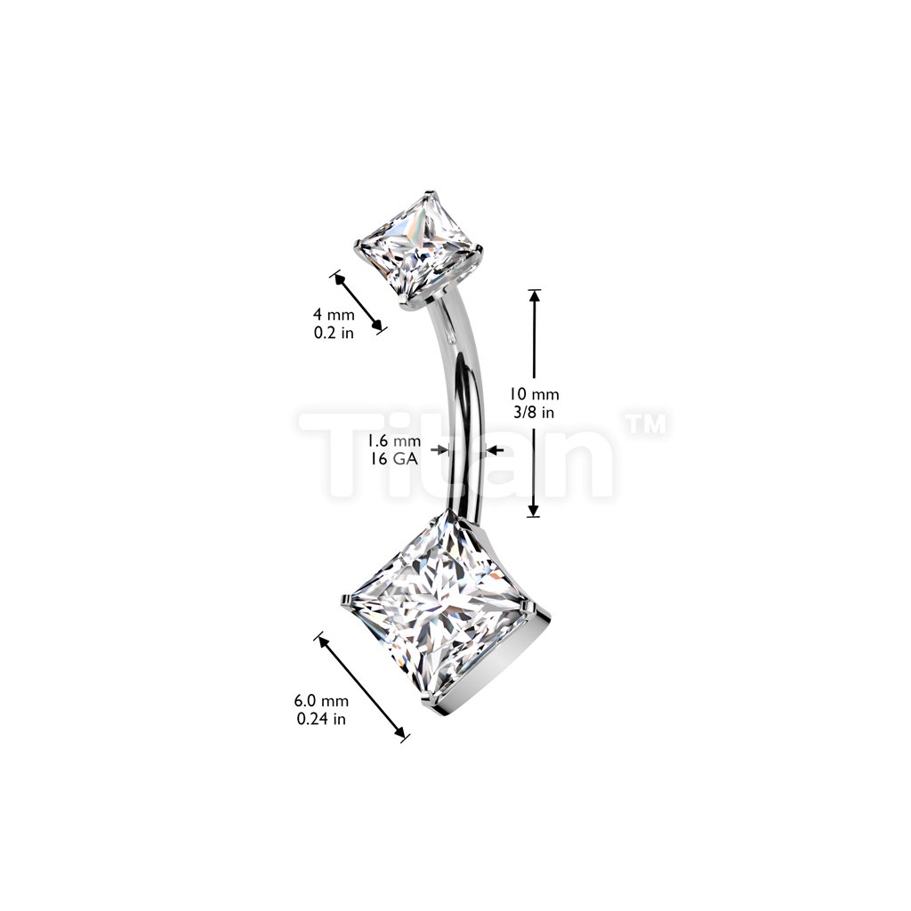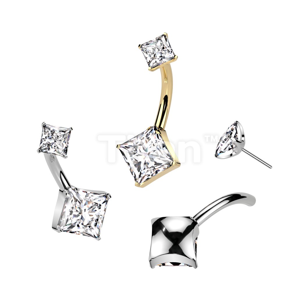 Implant Grade Titanium Threadless Push In Diamond Cut CZ Prong Set Bottom Belly Button Ring With Square CNC Cut Round Back Prong Set CZ Top