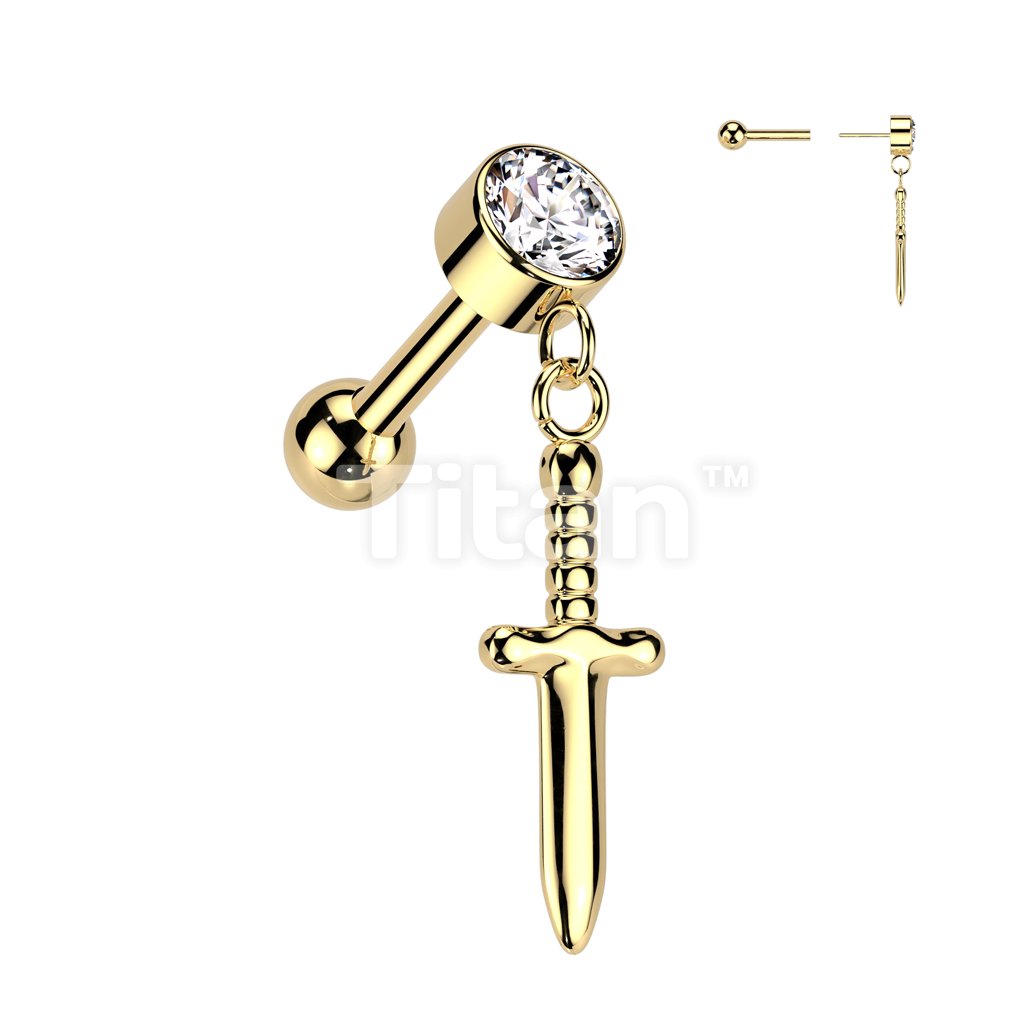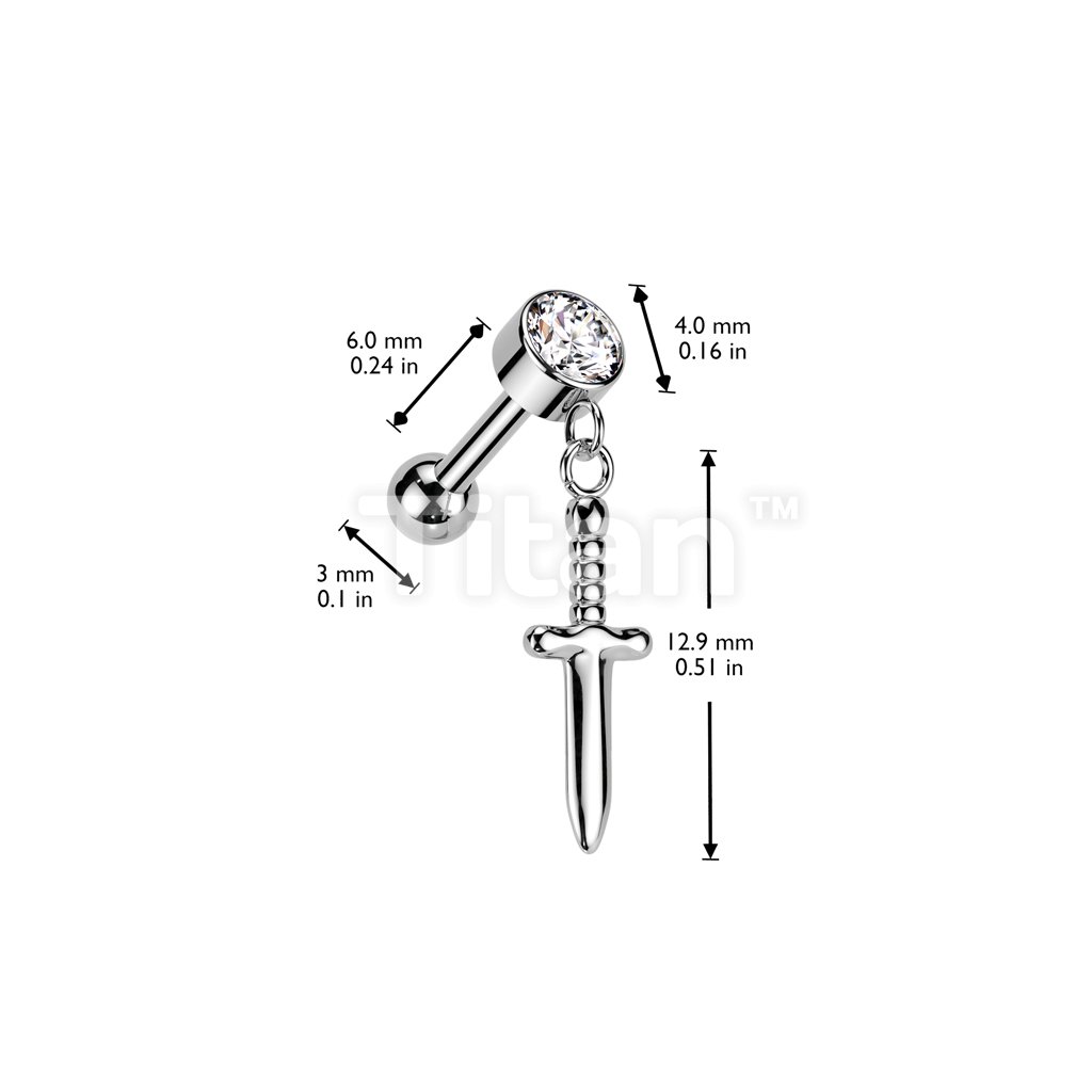 Implant Grade Titanium Threadless Push In Cartilage Barbell With Round Bezel Set CZ and Dagger Dangle Top