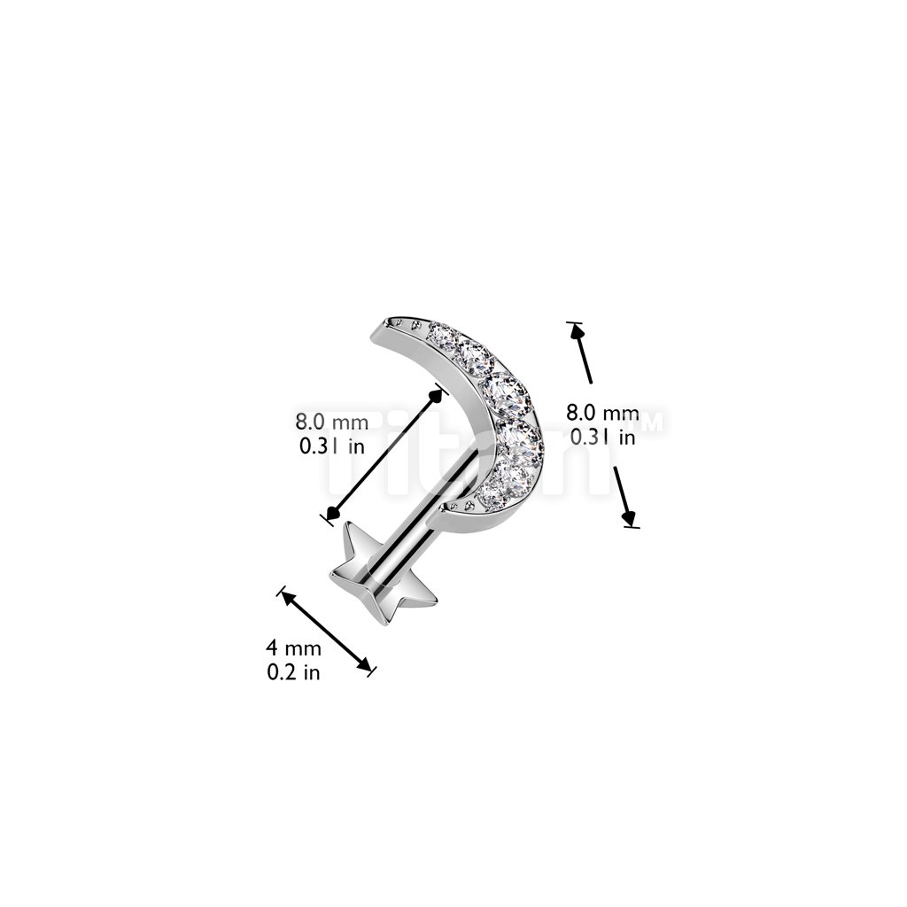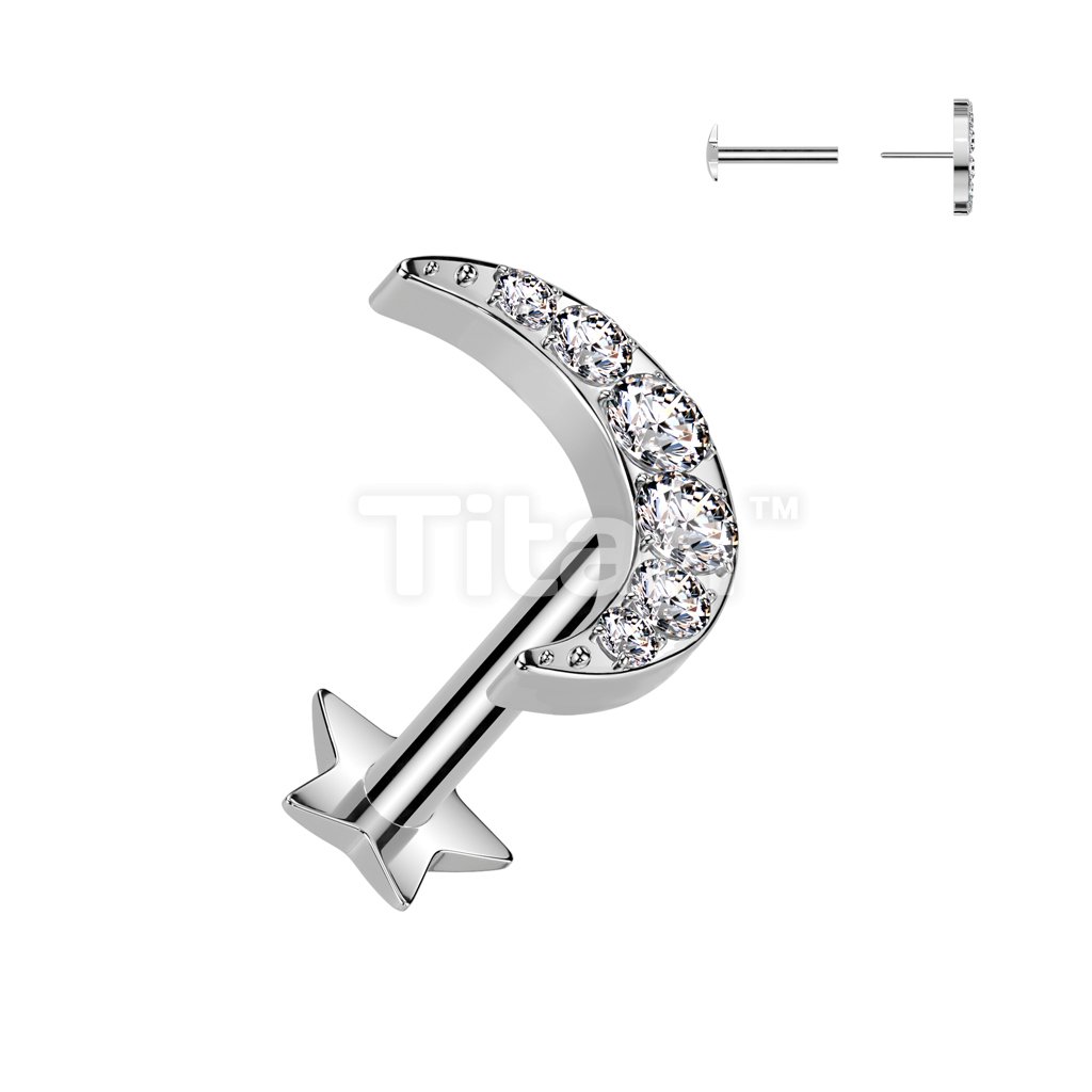 Implant Grade Titanium Threadless Push In Star Base Labret With 6 CNC Set CZ Crescent Moon Top