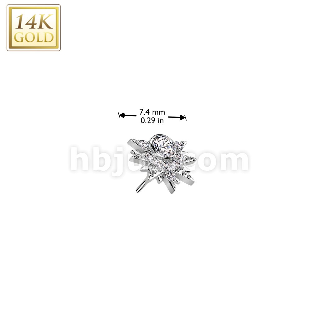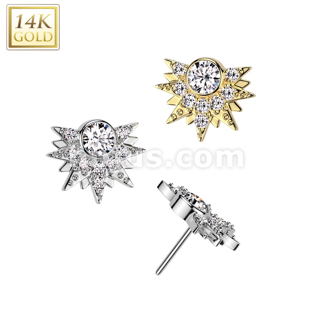14K Gold Threadless Push In Sunburst With Round CZ Center and CZ Pave Top