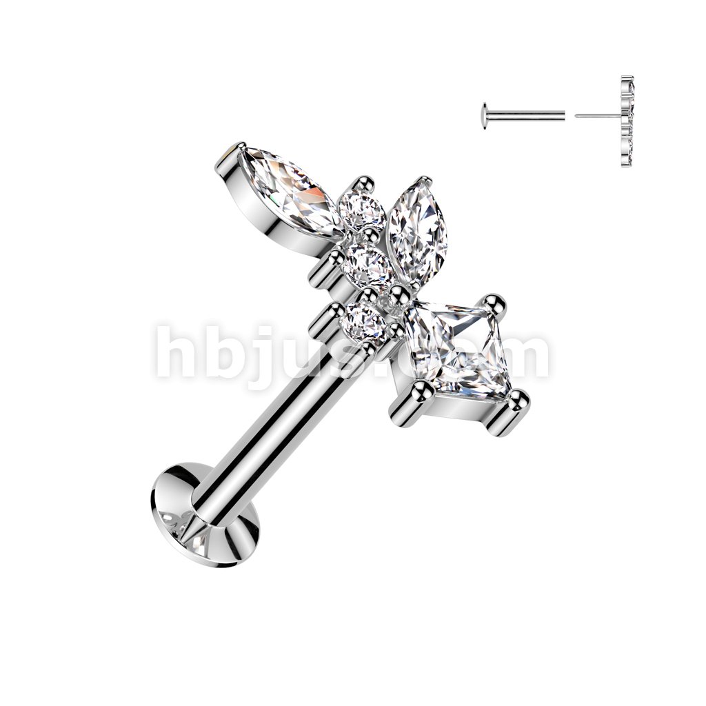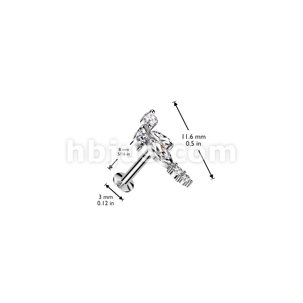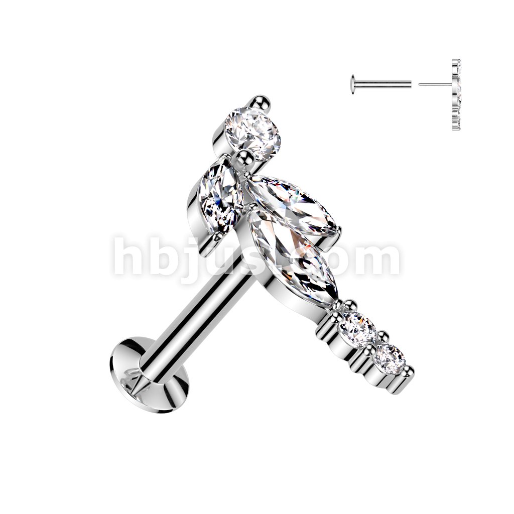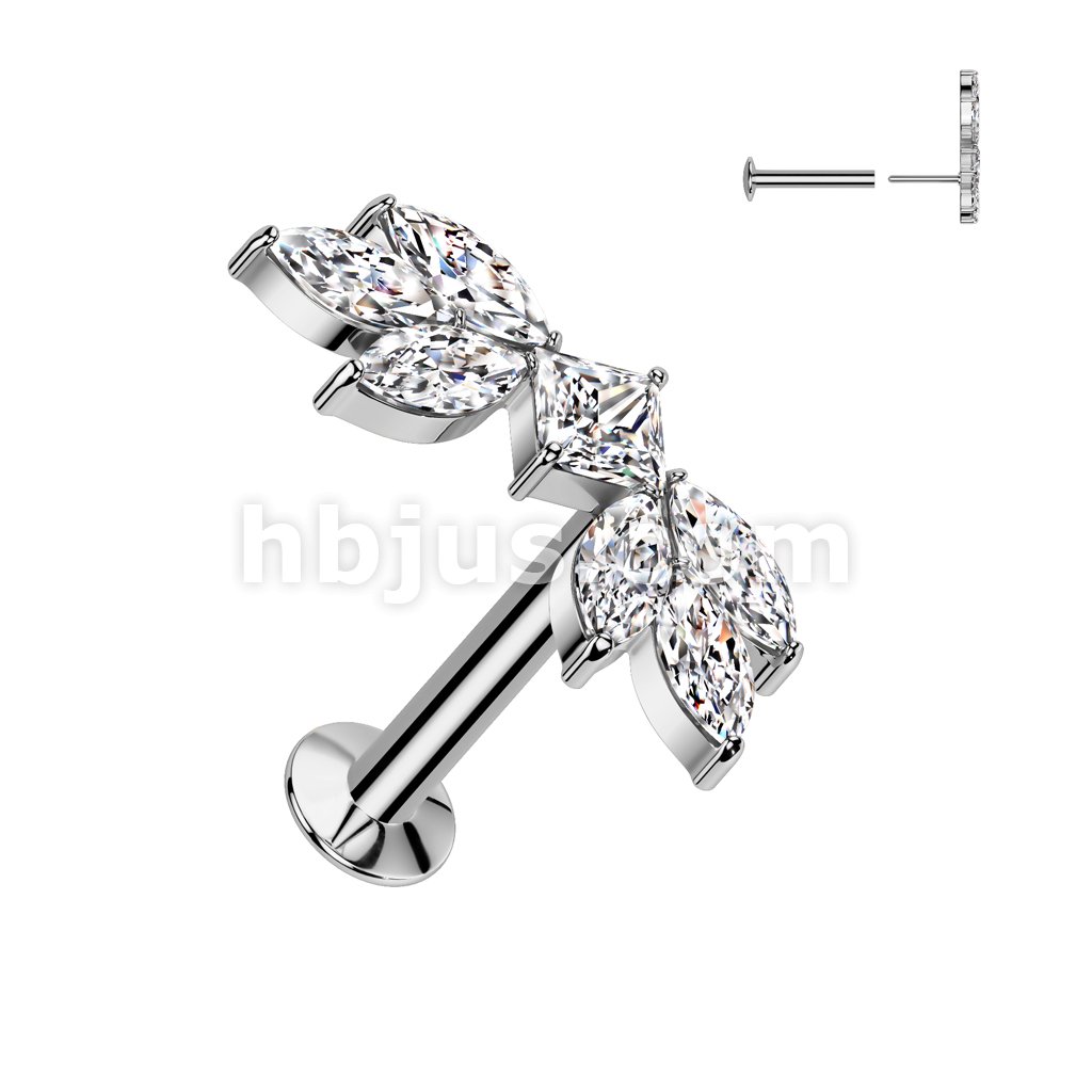 316L Surgical Steel Threadless Push In Flat Back Stud With Convex Back and CZ Baguette and CZ Marquise Center Fan Top