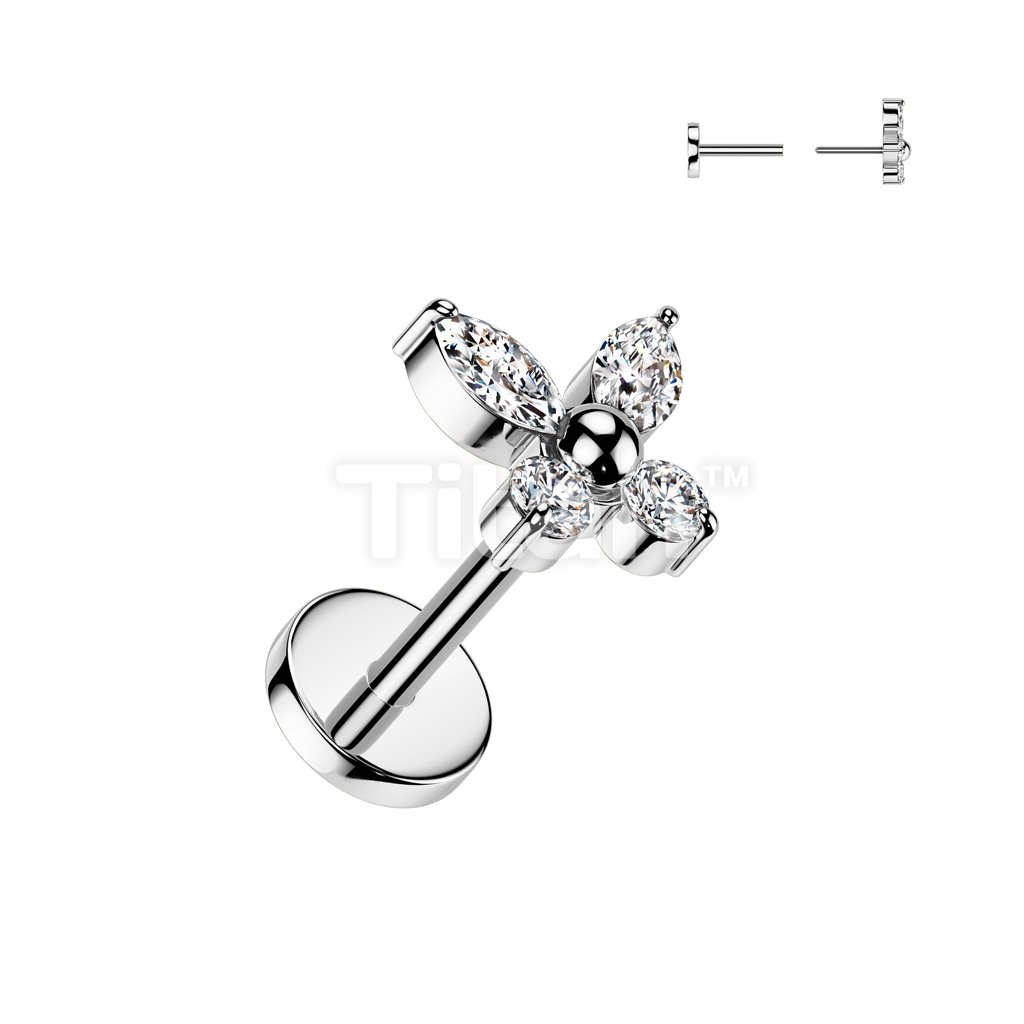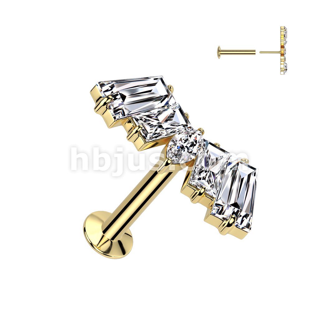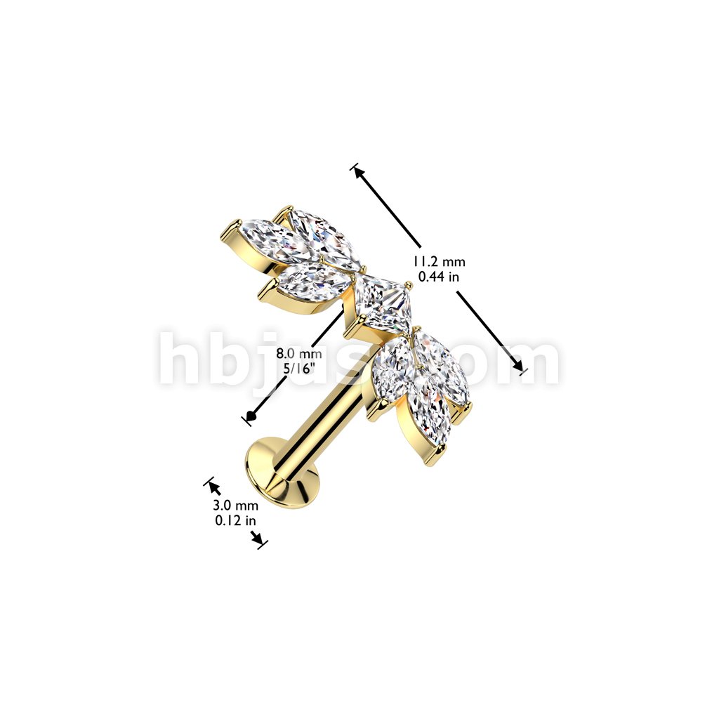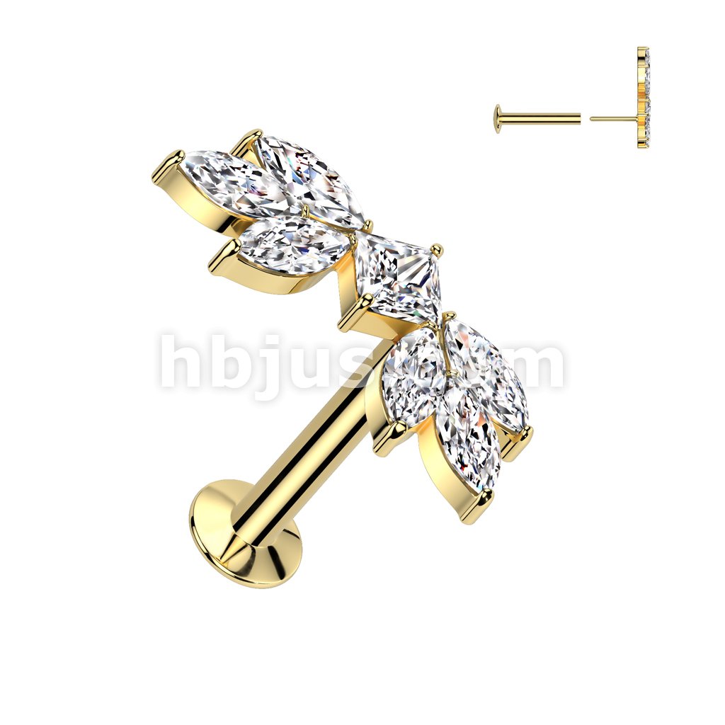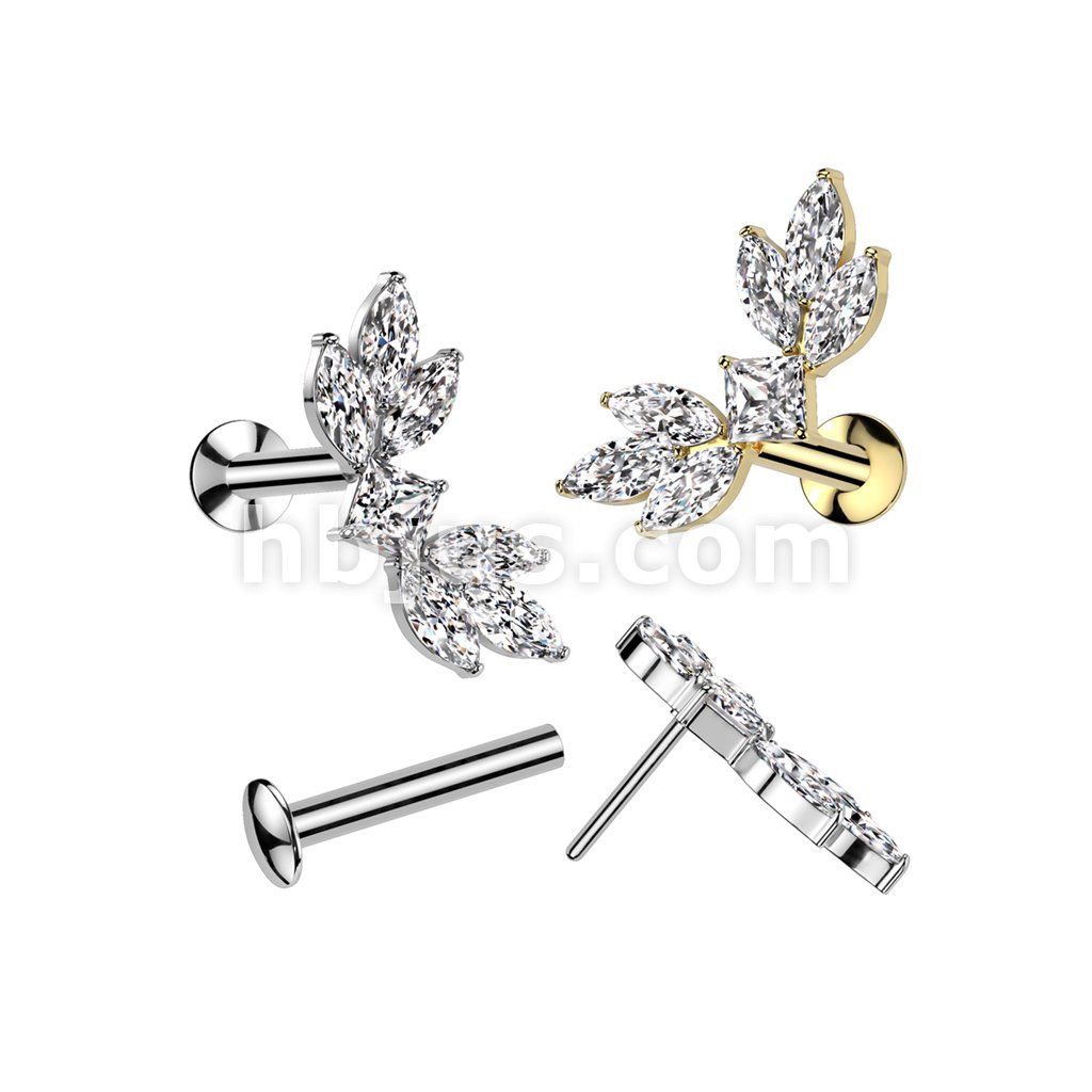 316L Surgical Steel Threadless Push In Flat Back Stud With Convex Back and CZ Baguette and CZ Marquise Center Fan Top