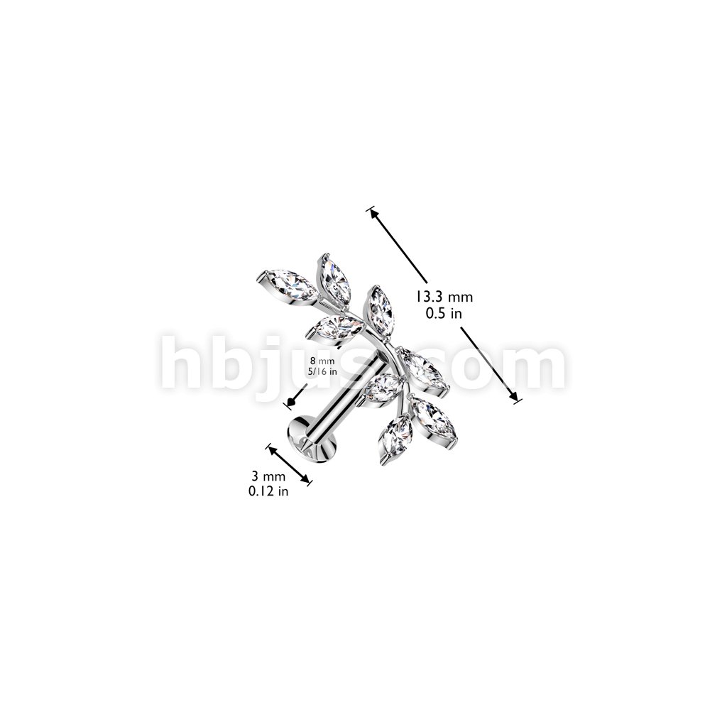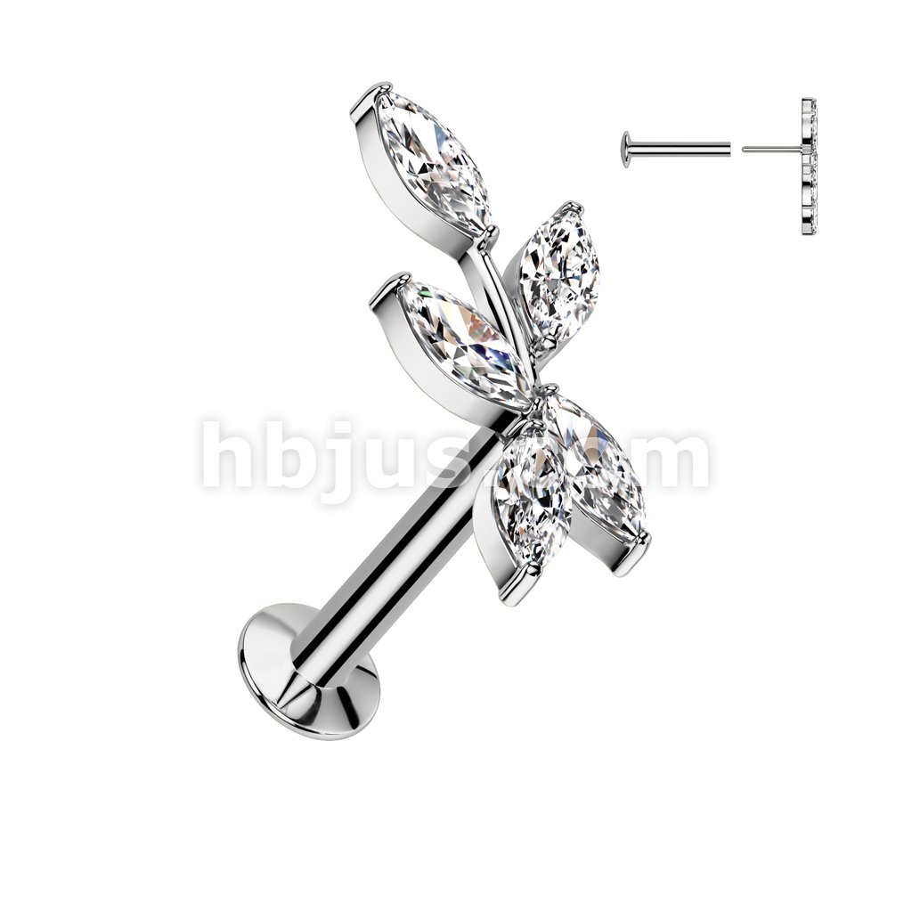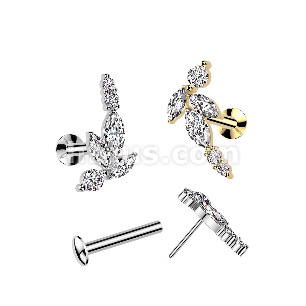 316L Surgical Steel Threadless Push In Flat Back Stud With Convex Back and 5 Marquise CZ Vine Top