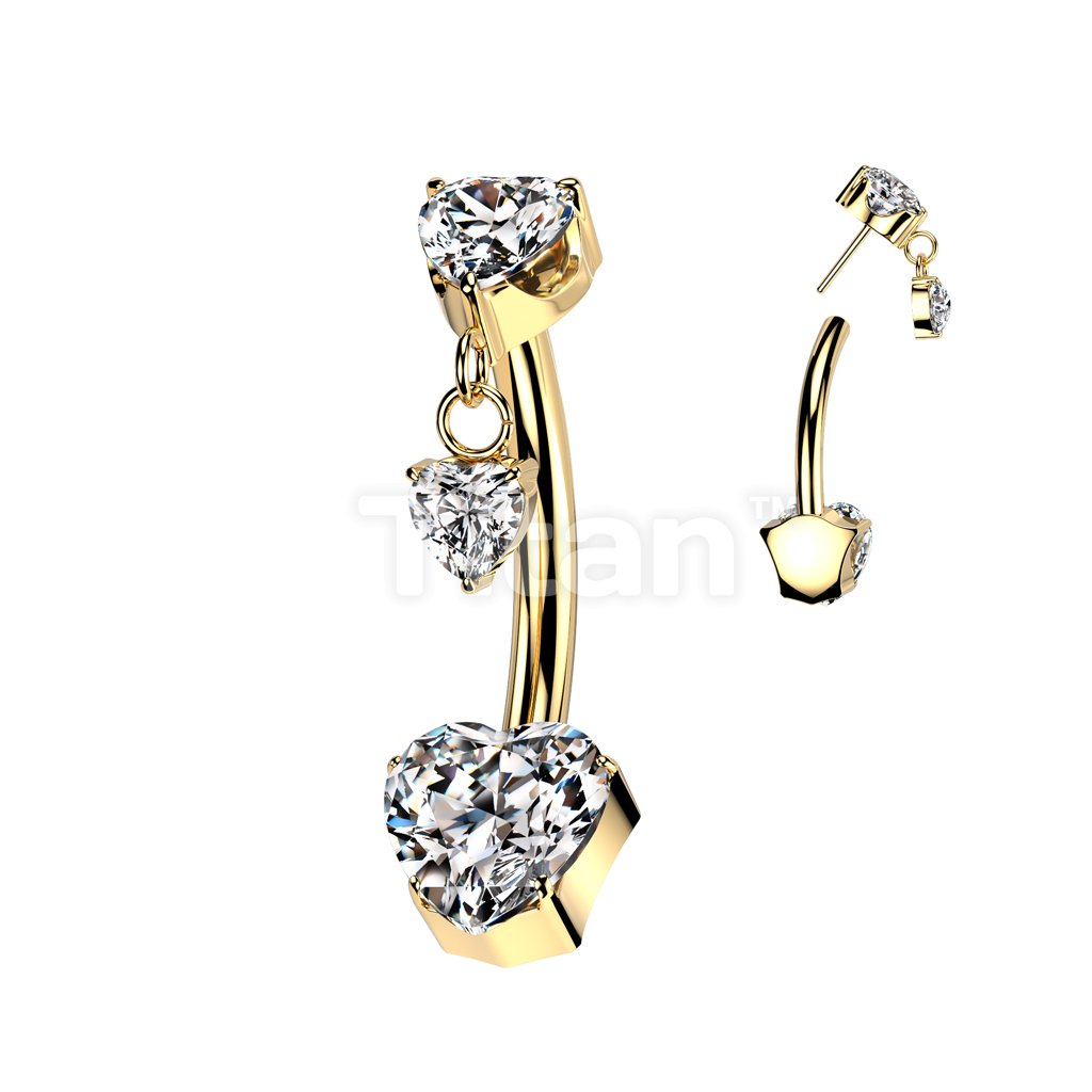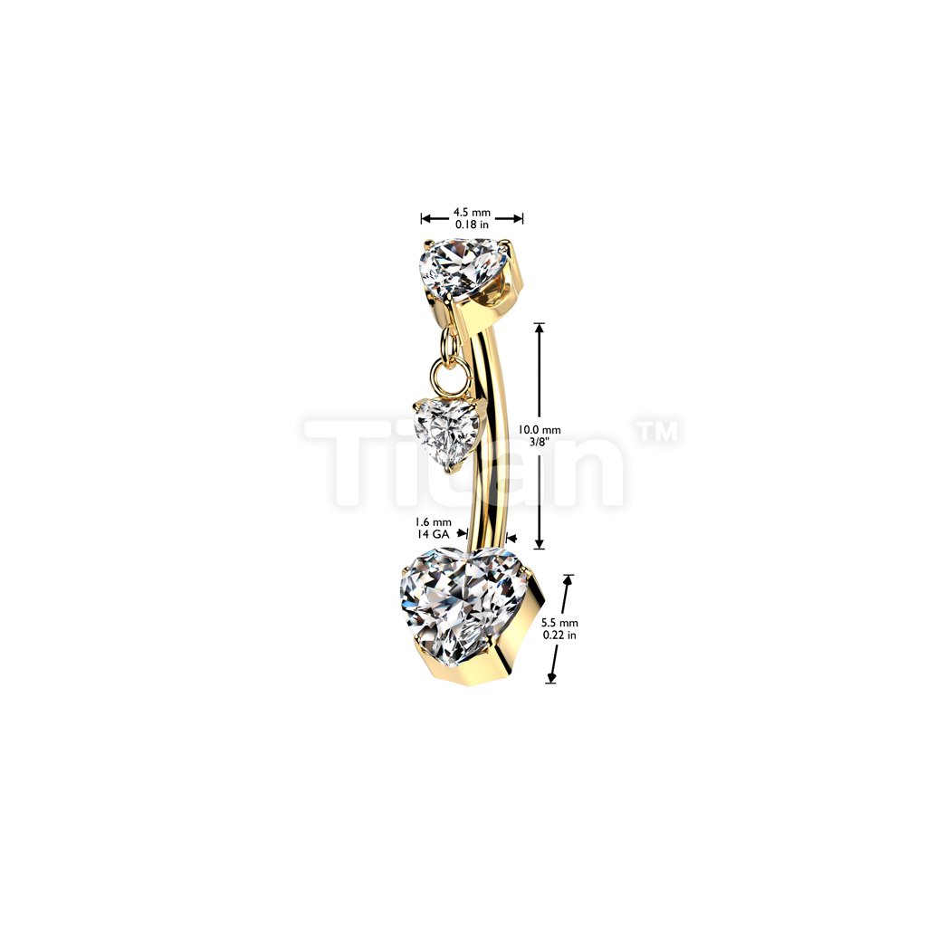 Implant Grade Titanium Threadless Push In Heart CZ Prong Set Belly Button Ring With Prong Set Heart CZ Top And Heart CZ Dangle