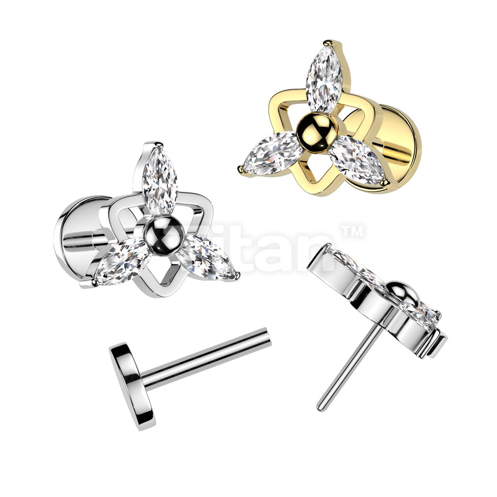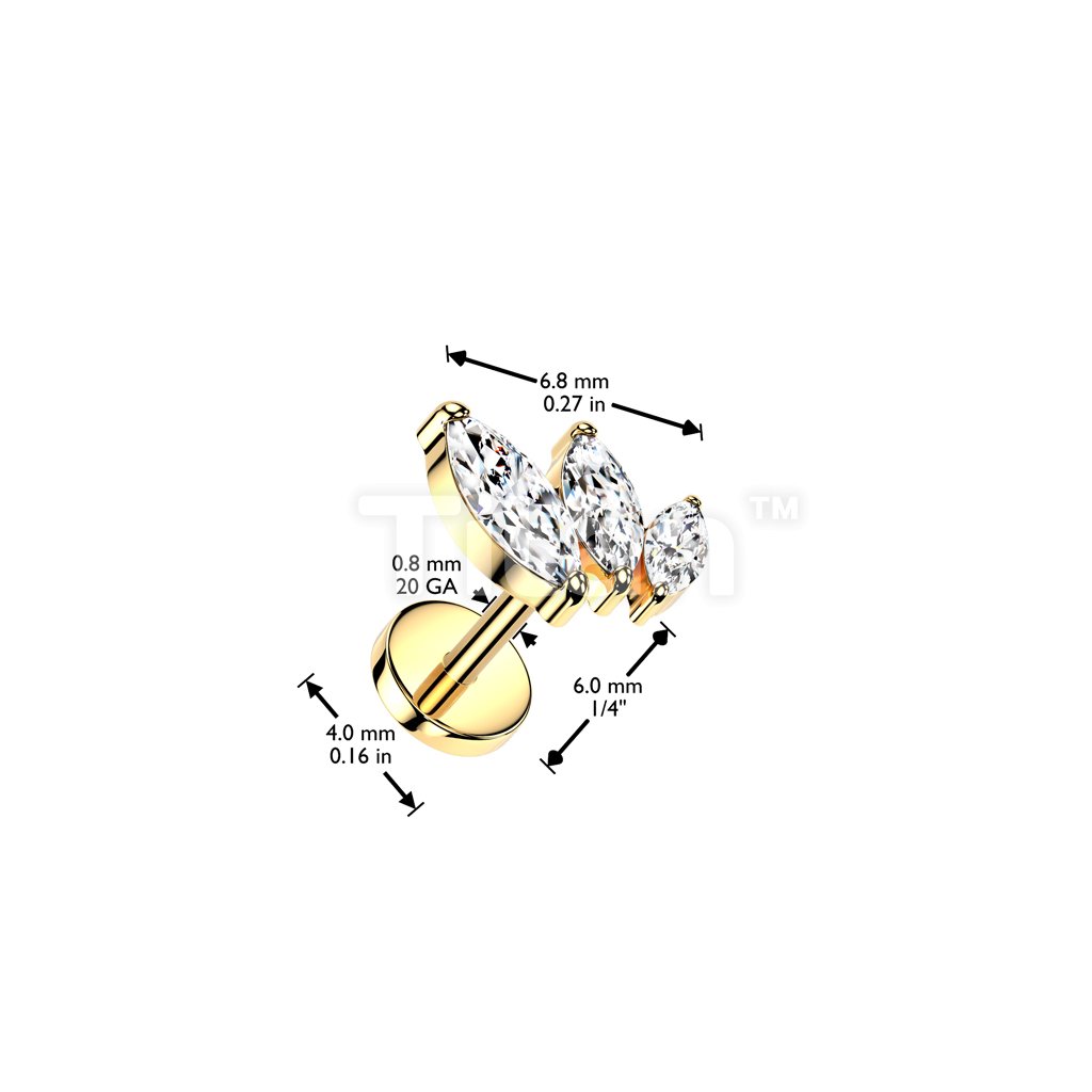 Implant Grade Titanium Threadless Push In 20ga Flat Back Earring Stud With Triple Marquise CZ Top