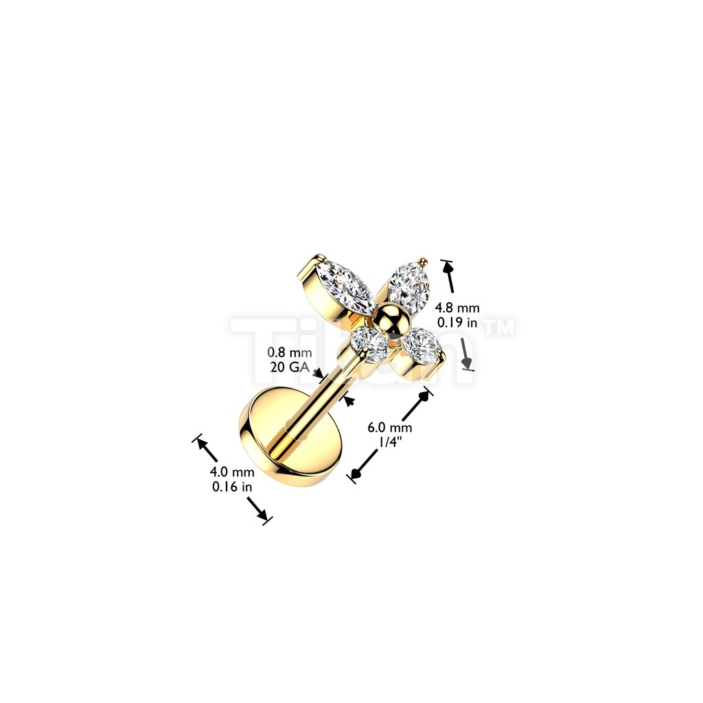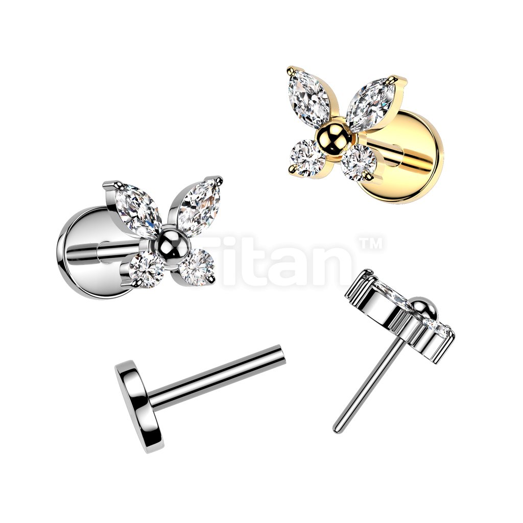 Implant Grade Titanium Threadless Push In 20ga Flat Back Earring Stud With CZ Butterfly Top