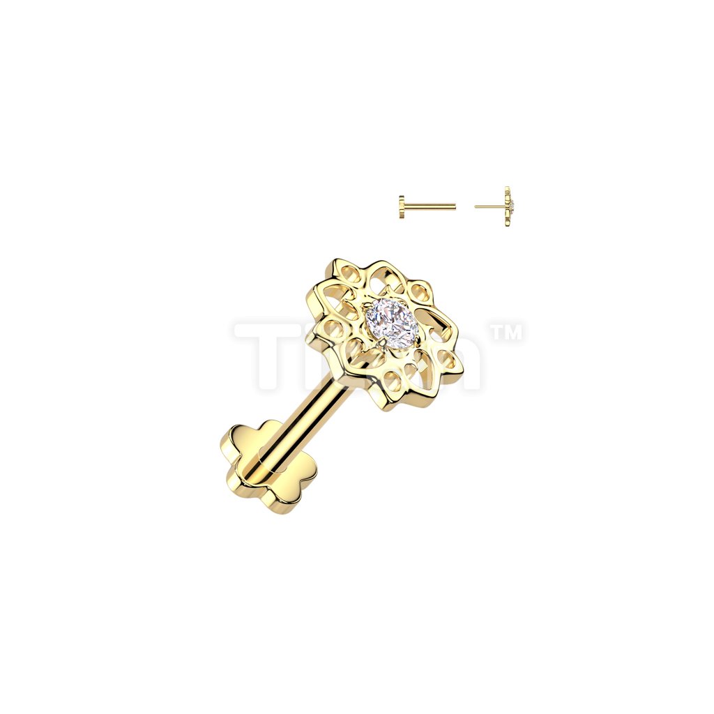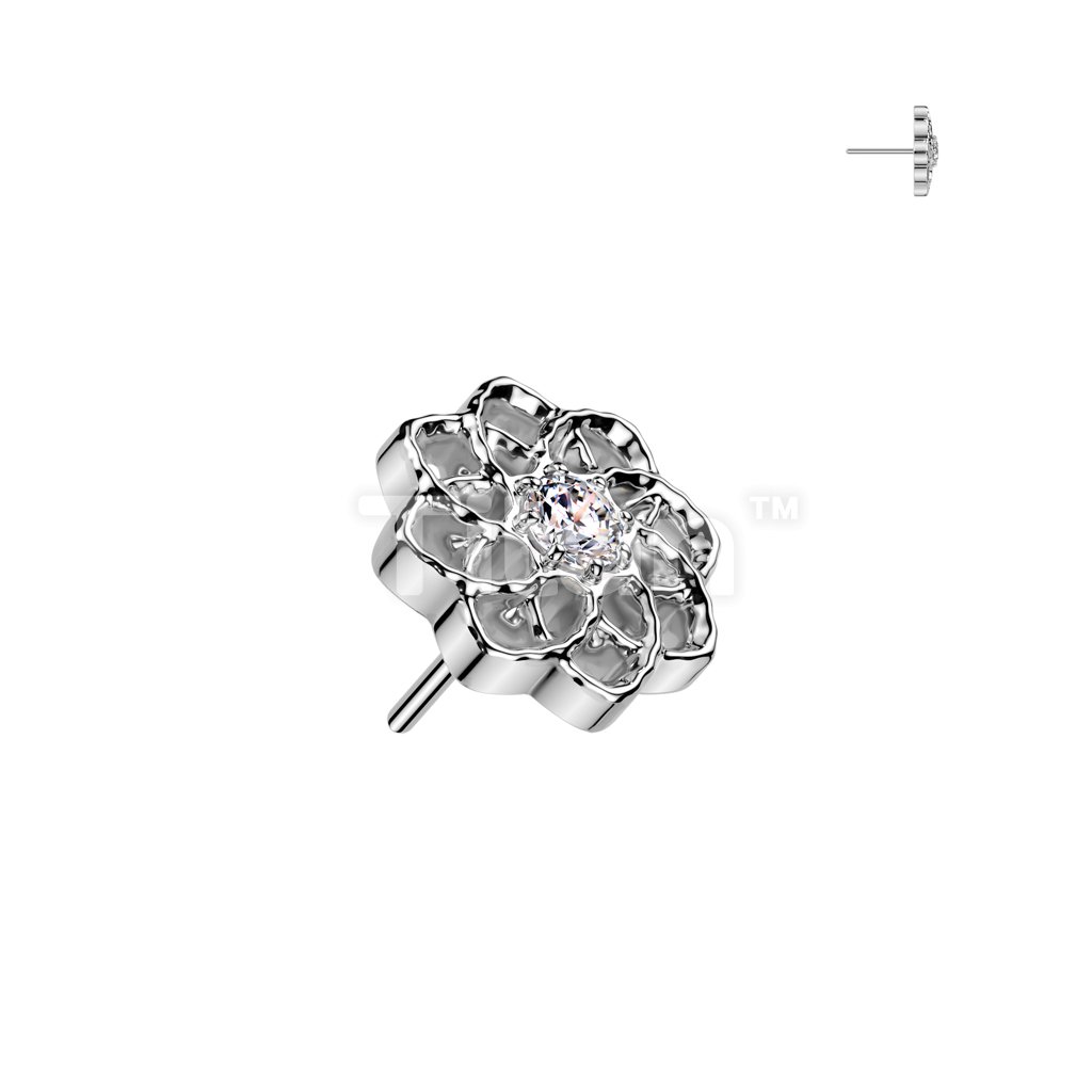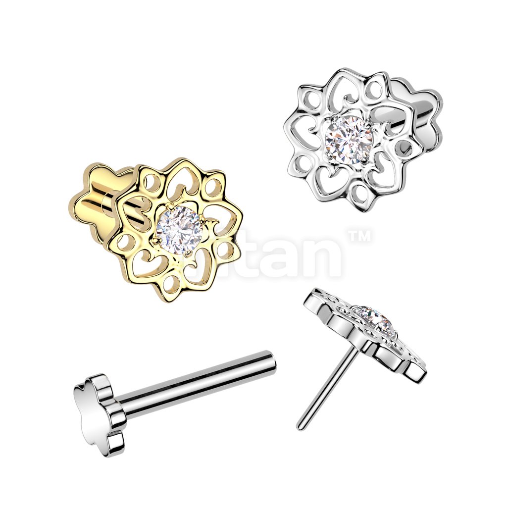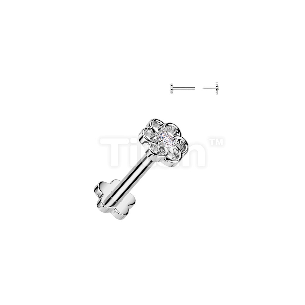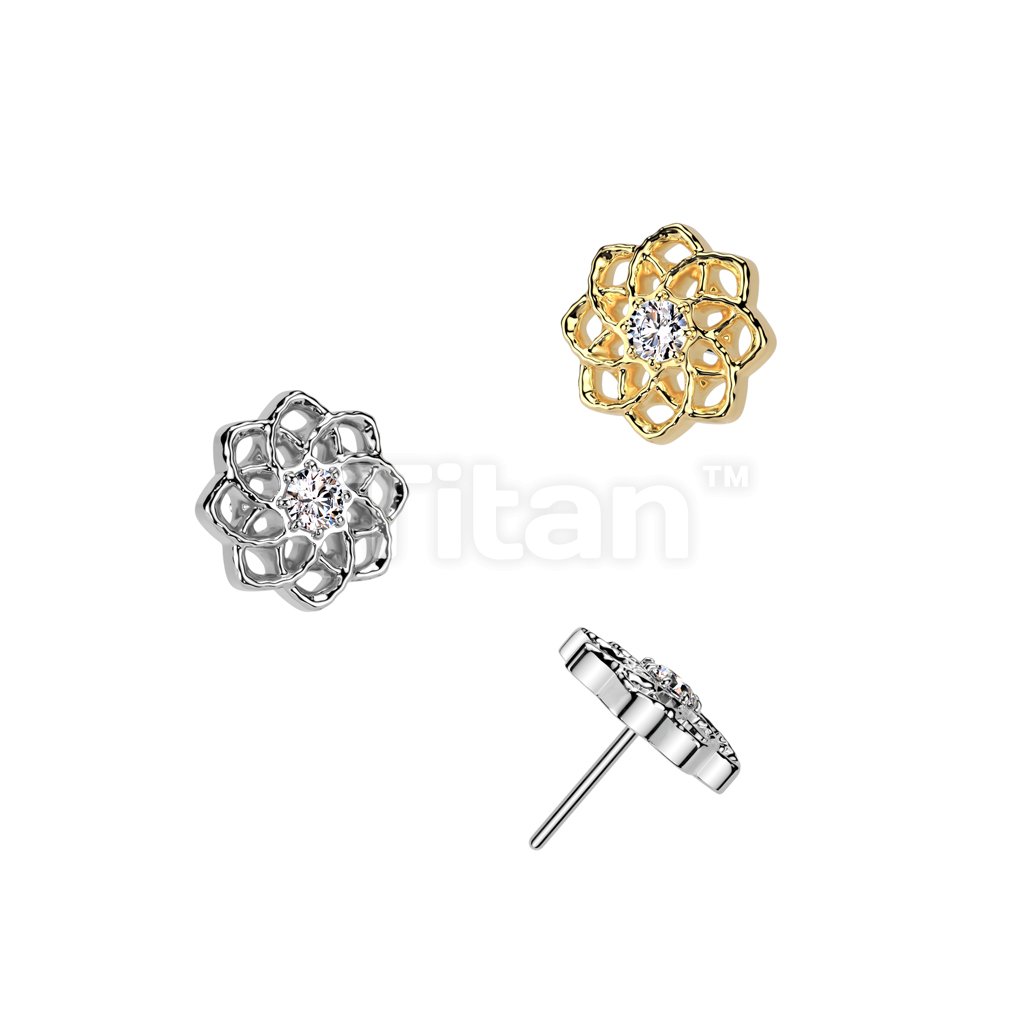Implant Grade Titanium Threadless Push In Flower Base Flat Back Stud With Small Hollow Swirl Flower CZ Center Top