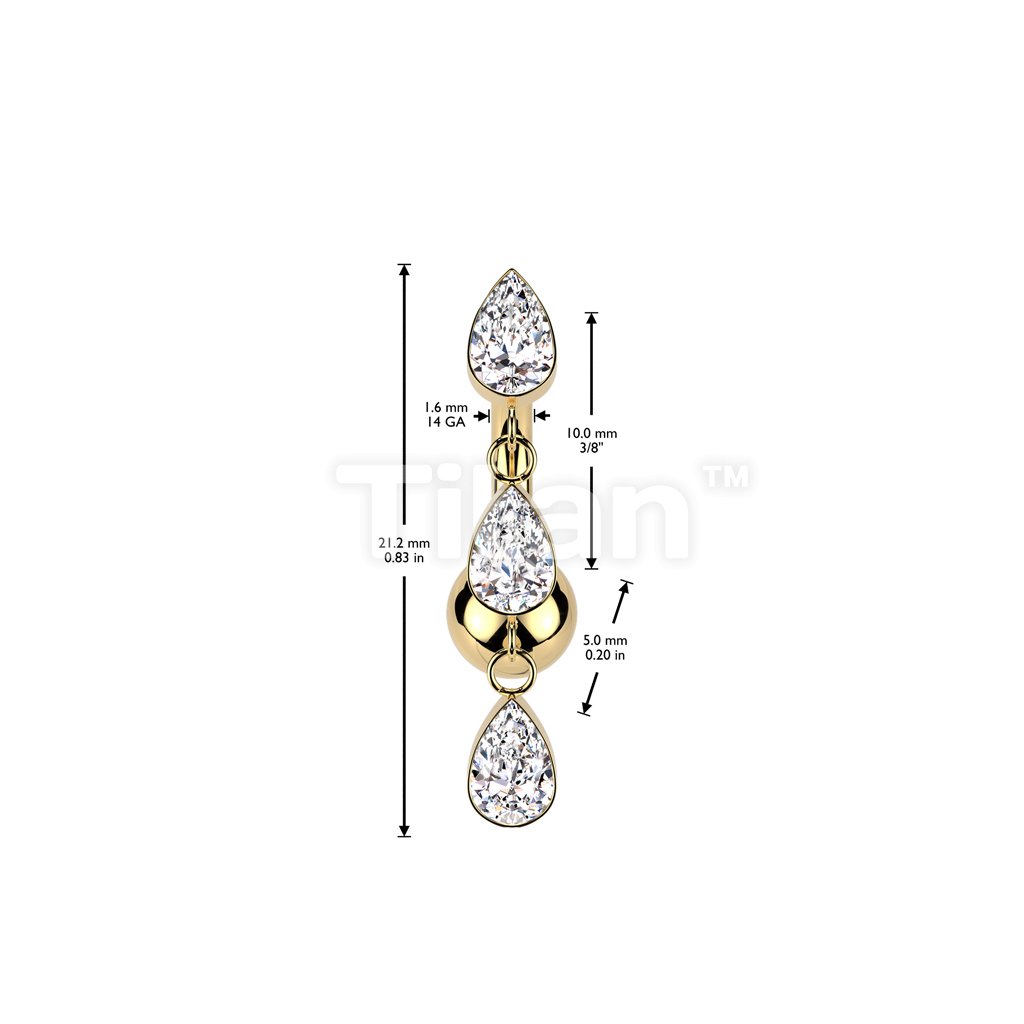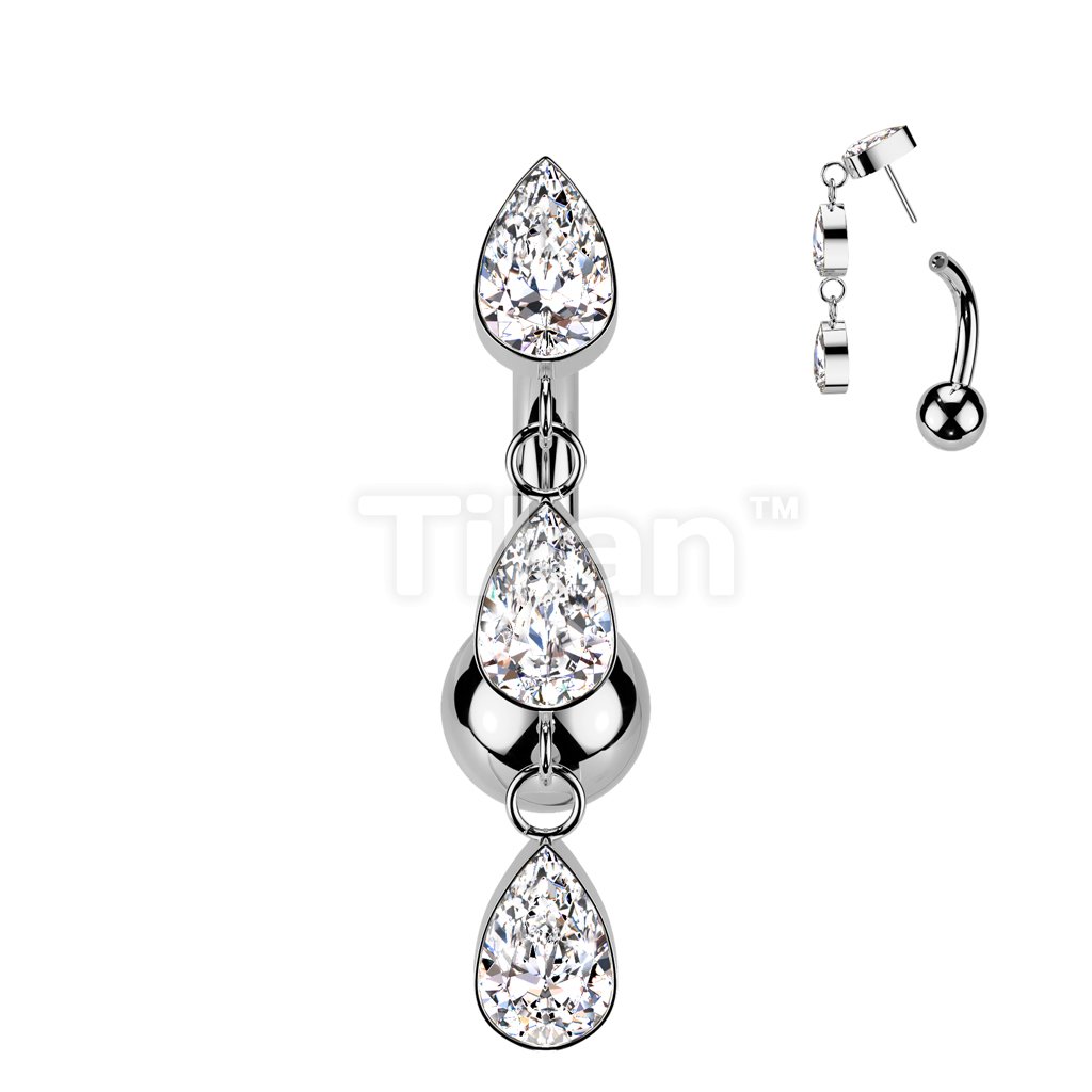 Implant Grade Titanium Threadless Push In Belly Button Ring With 3 Teardrop CZ Bezel Set Dangle Top