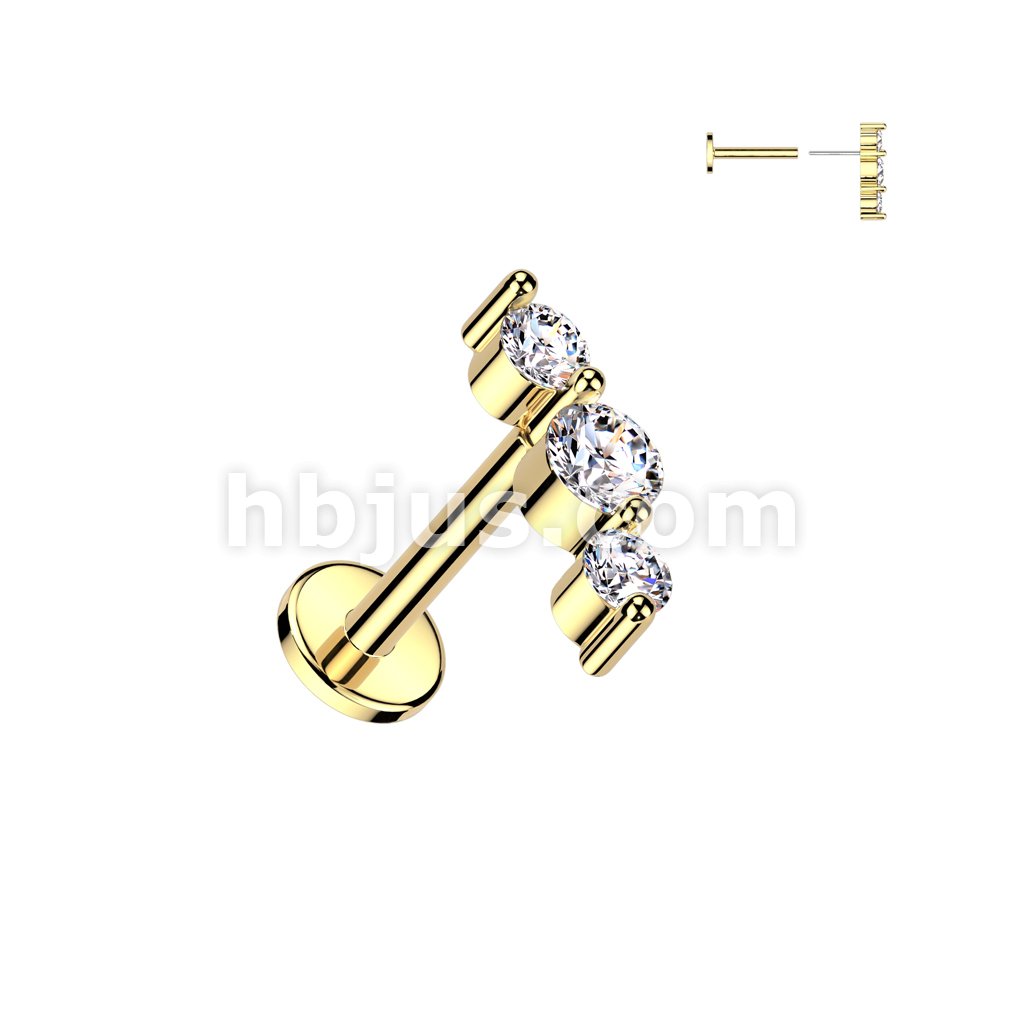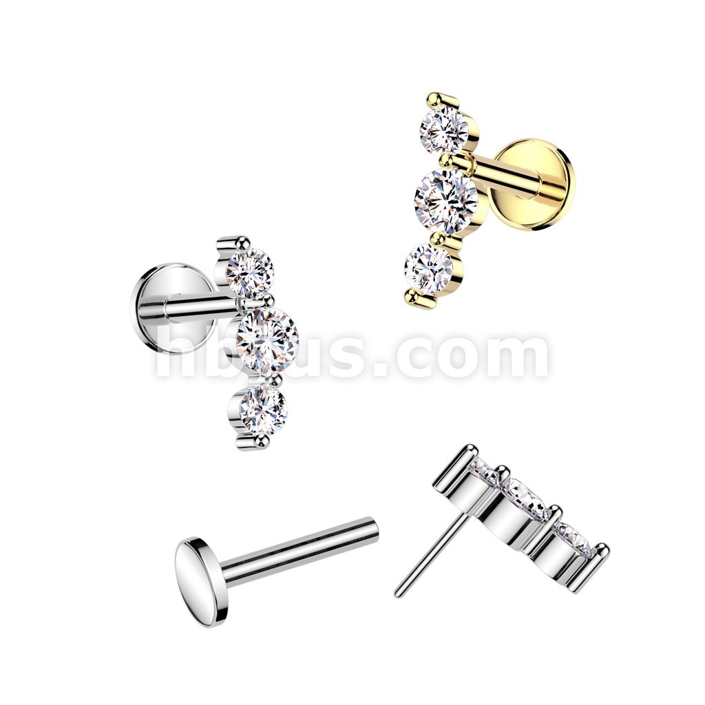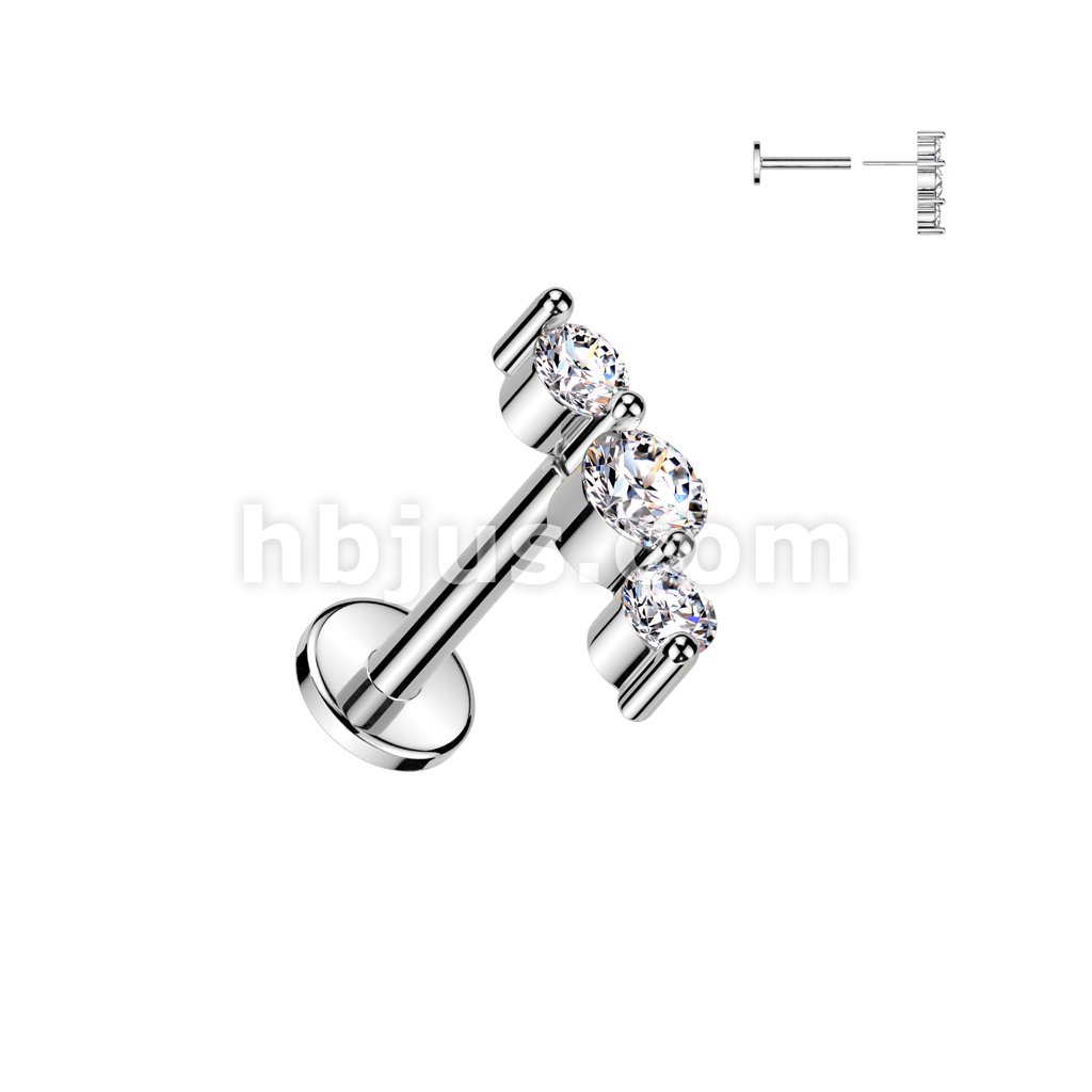 316L Surgical Steel Threadless Push In Flat Back Stud With Triple CZ Top