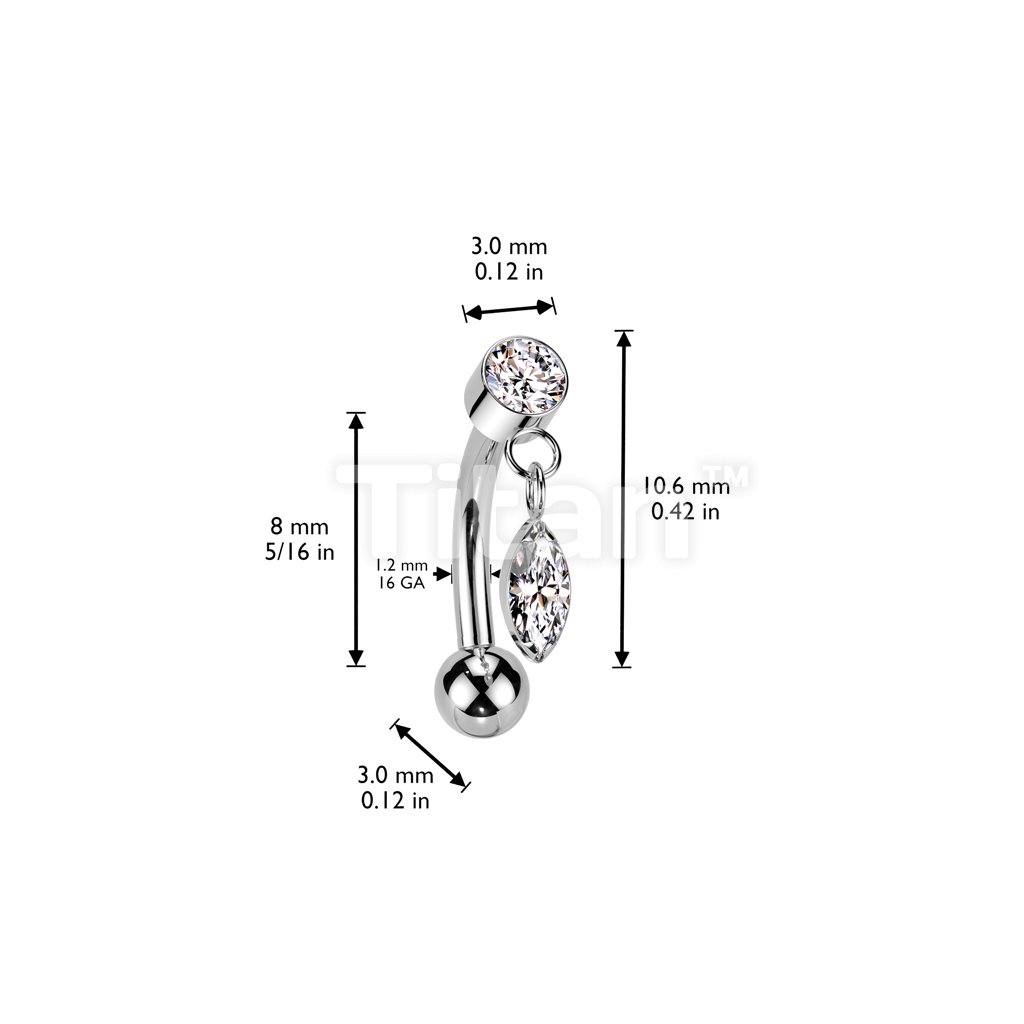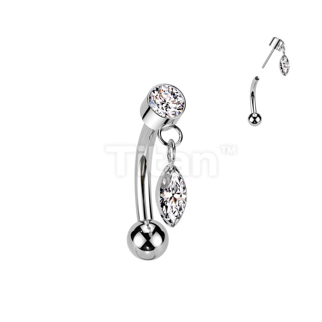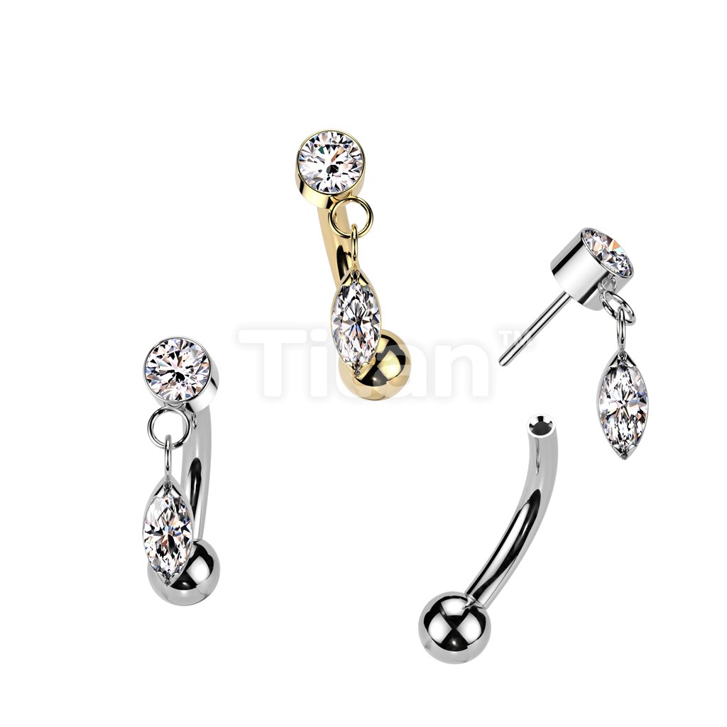 Implant Grade Titanium Threadless Push In Eyebrow Curved Barbell With Round Bezel Set CZ And Marquise CZ Dangle Top
