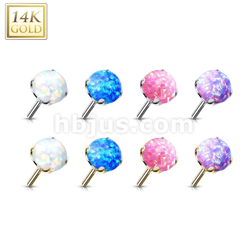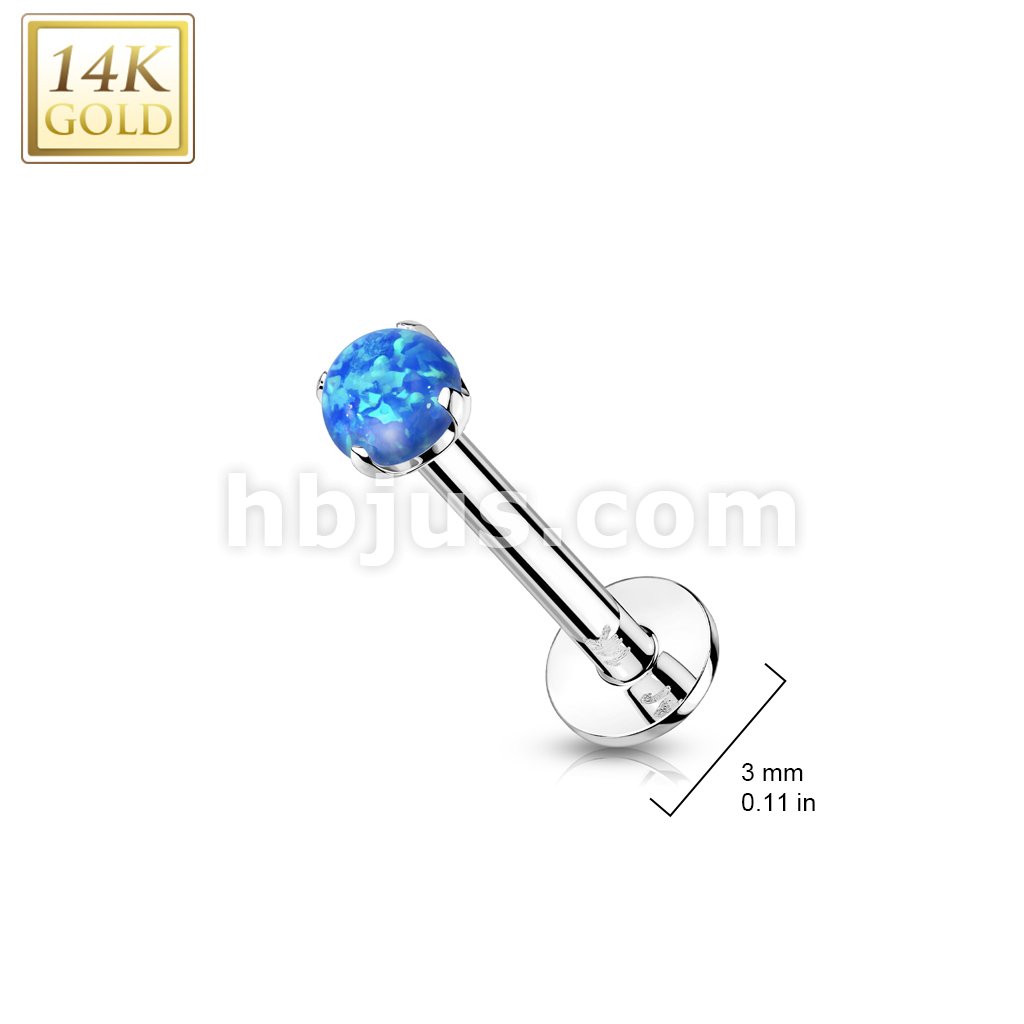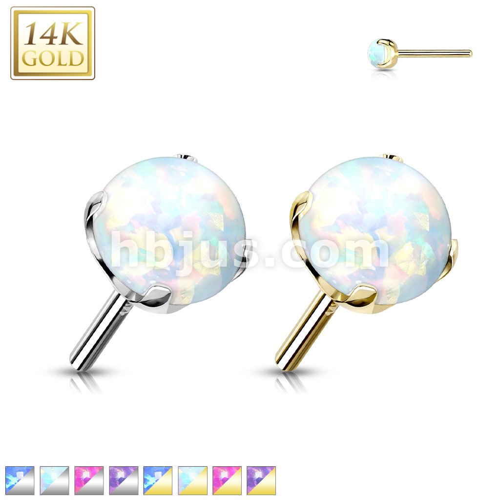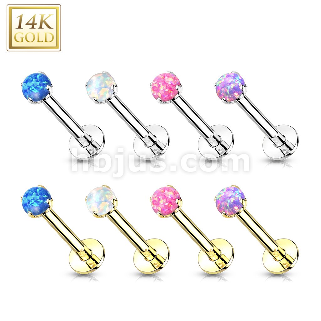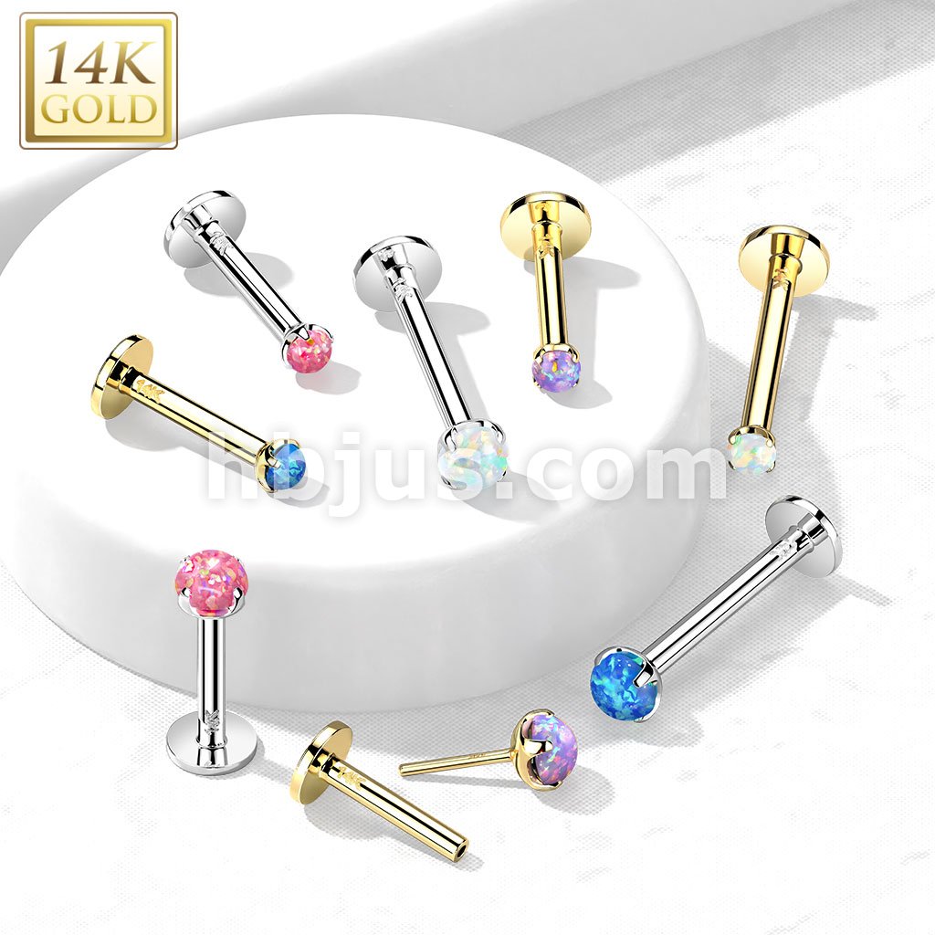 14K Gold Threadless Push-in Labret, Flat Back Studs With Prong Set Opal Top for Cartilage, Monroe and More