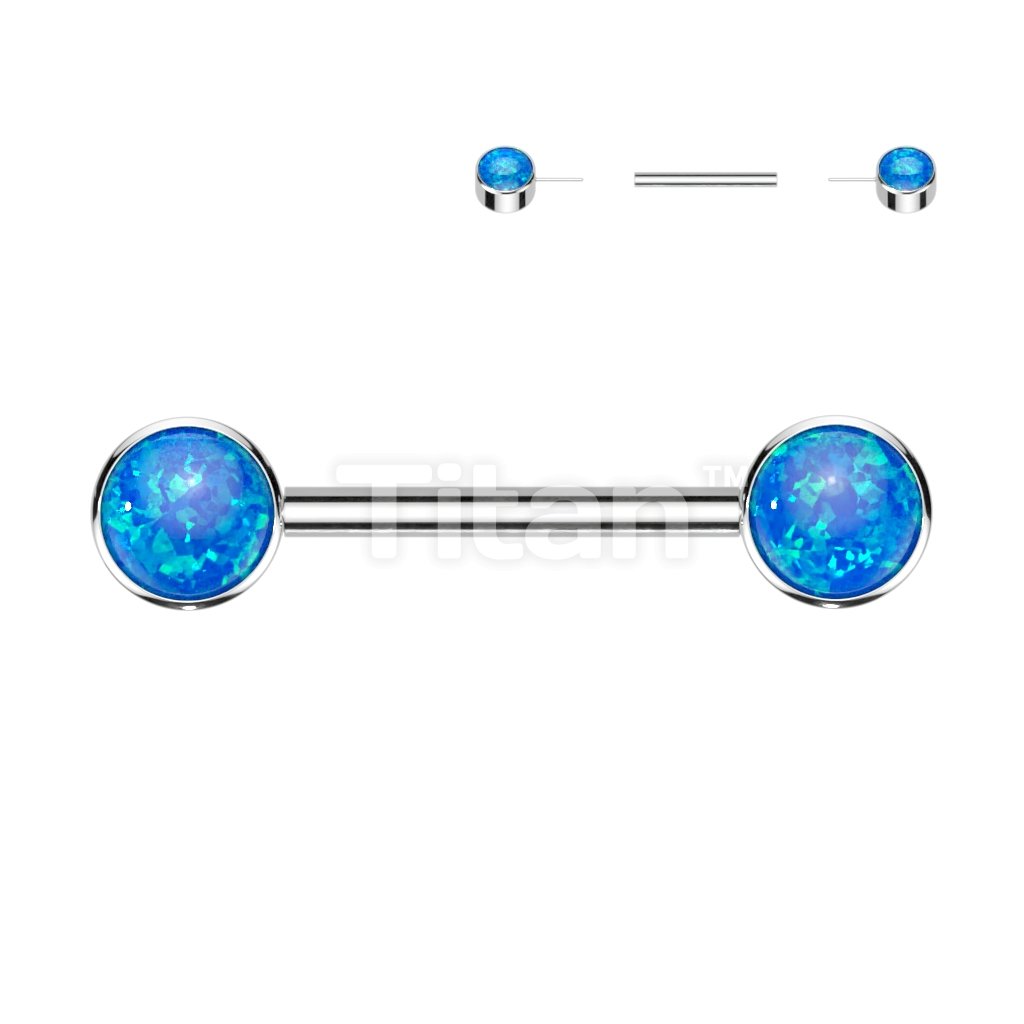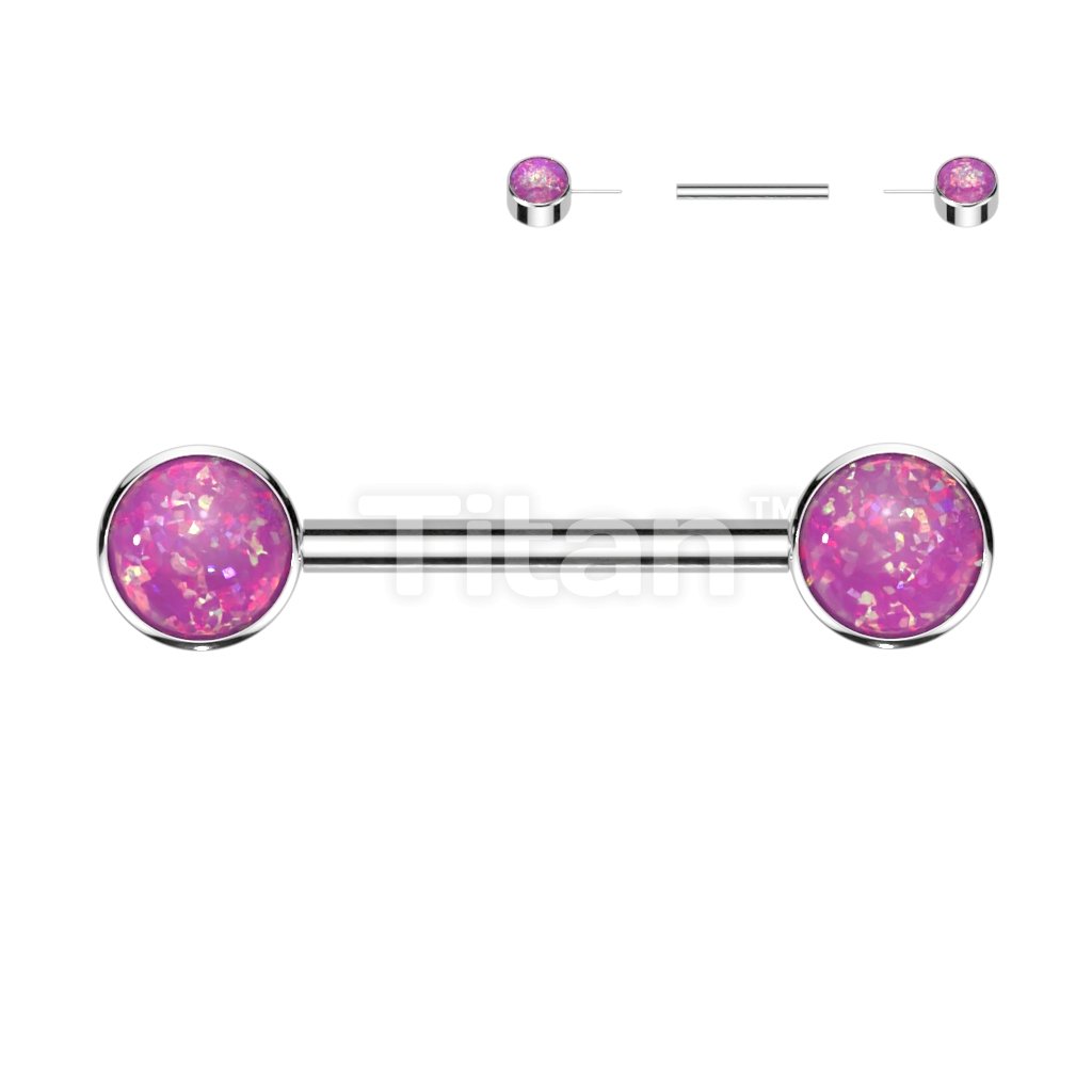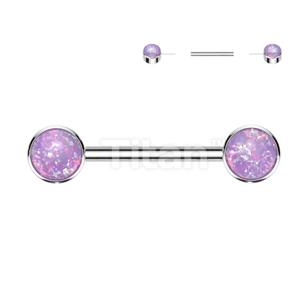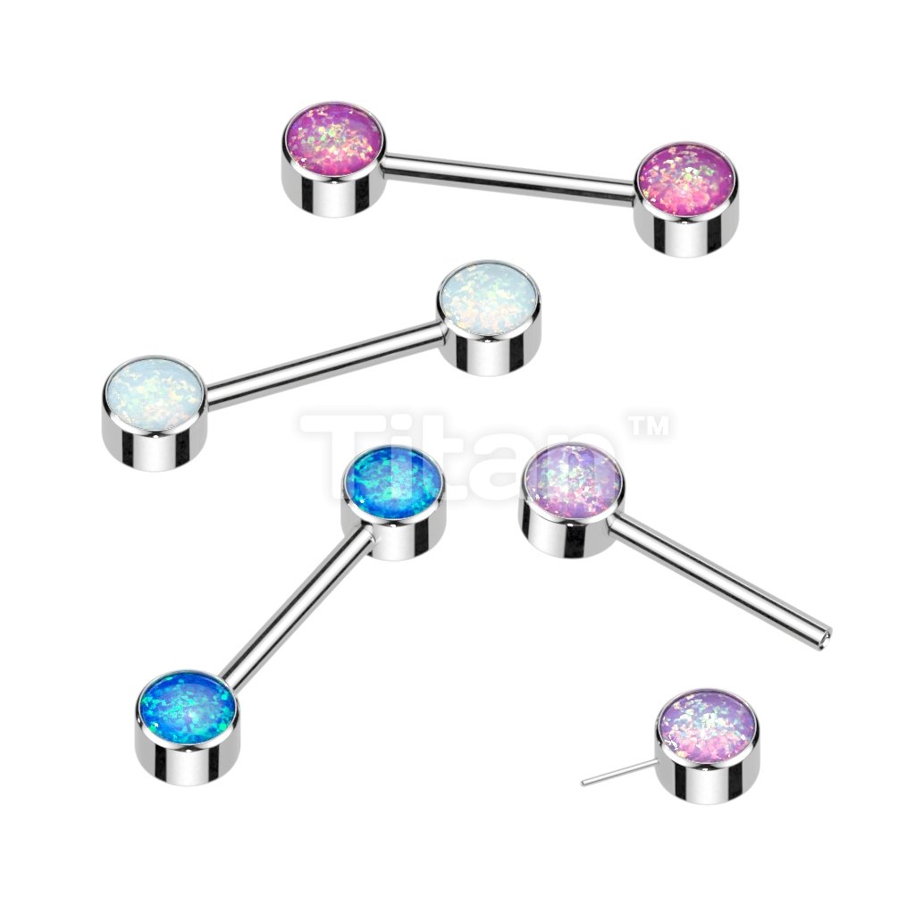 Implant Grade Titanium Threadless Push in Nipple Barbell With Forward Facing Bezel Set Opal Flat Ends