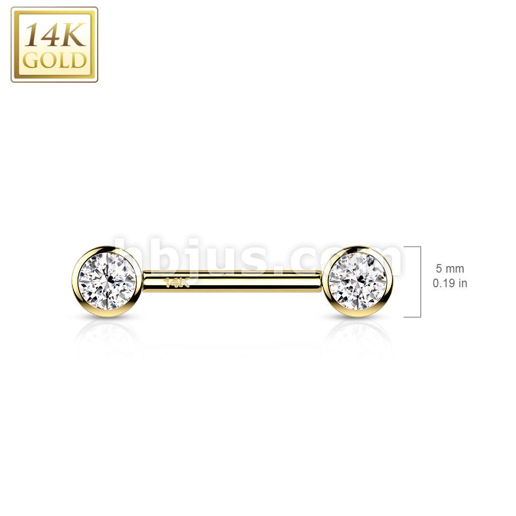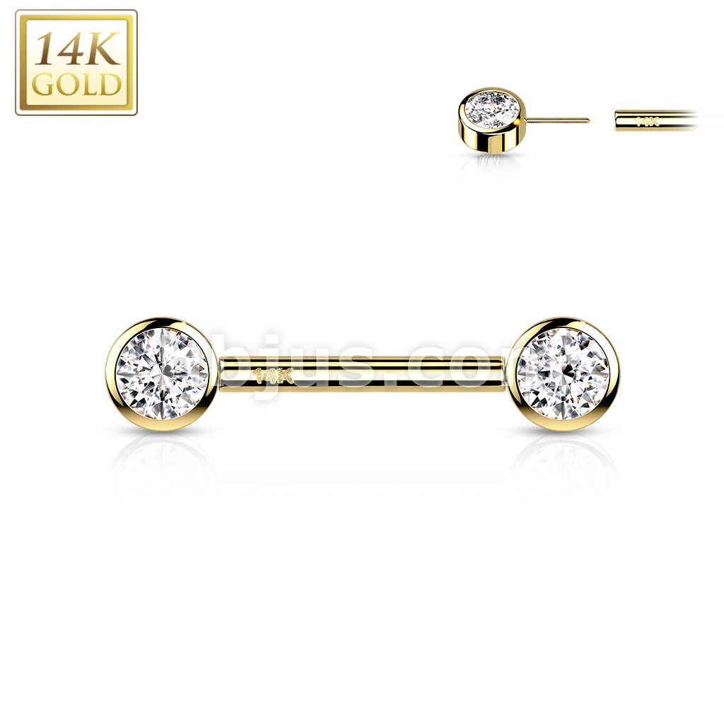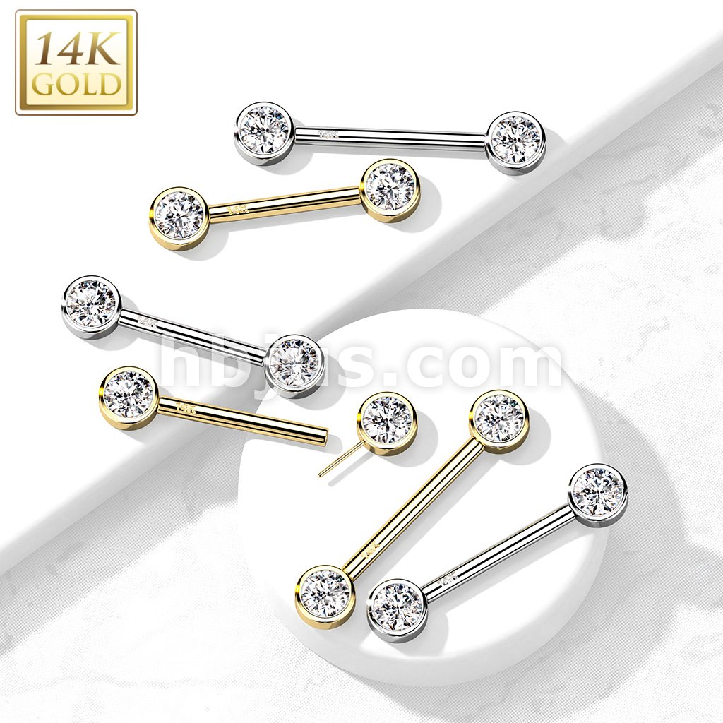 14K Gold Threadless Nipple Barbells with Round Bezel Set CZ Ends