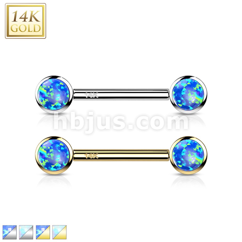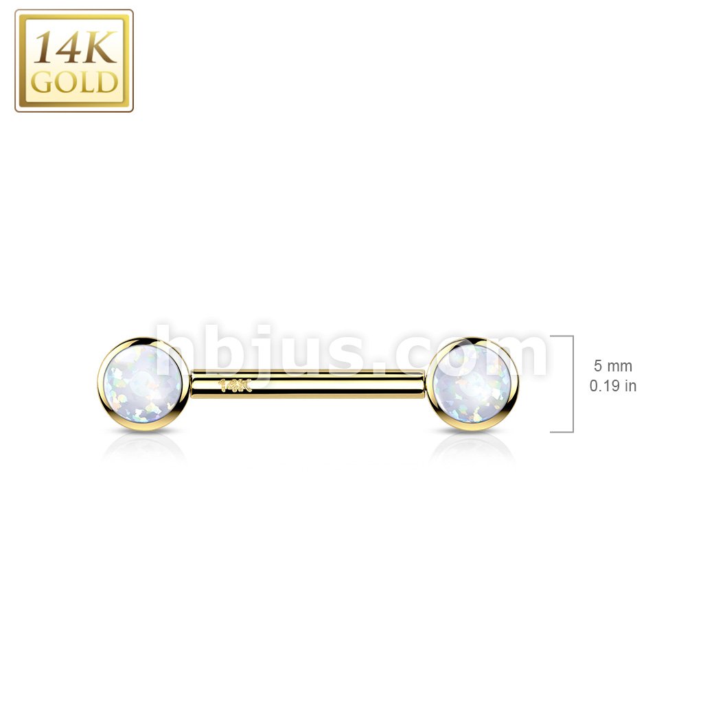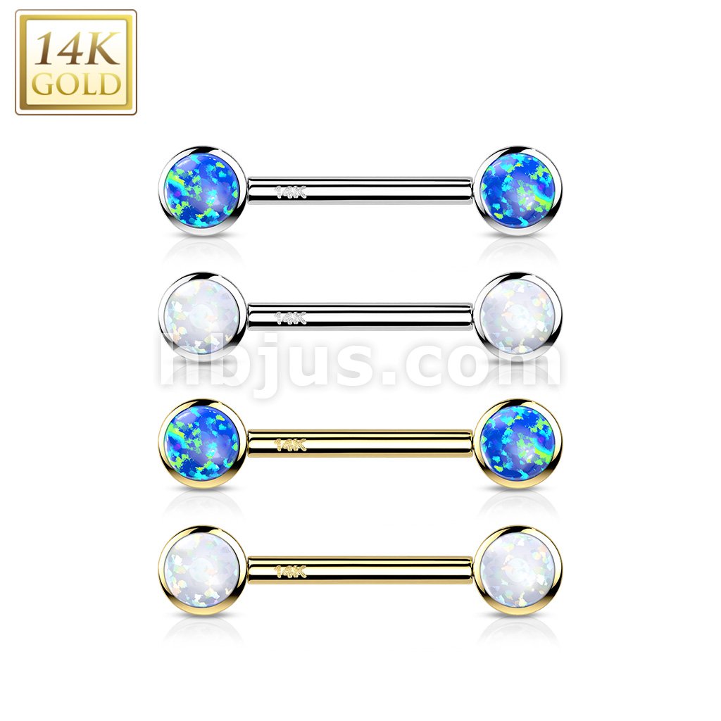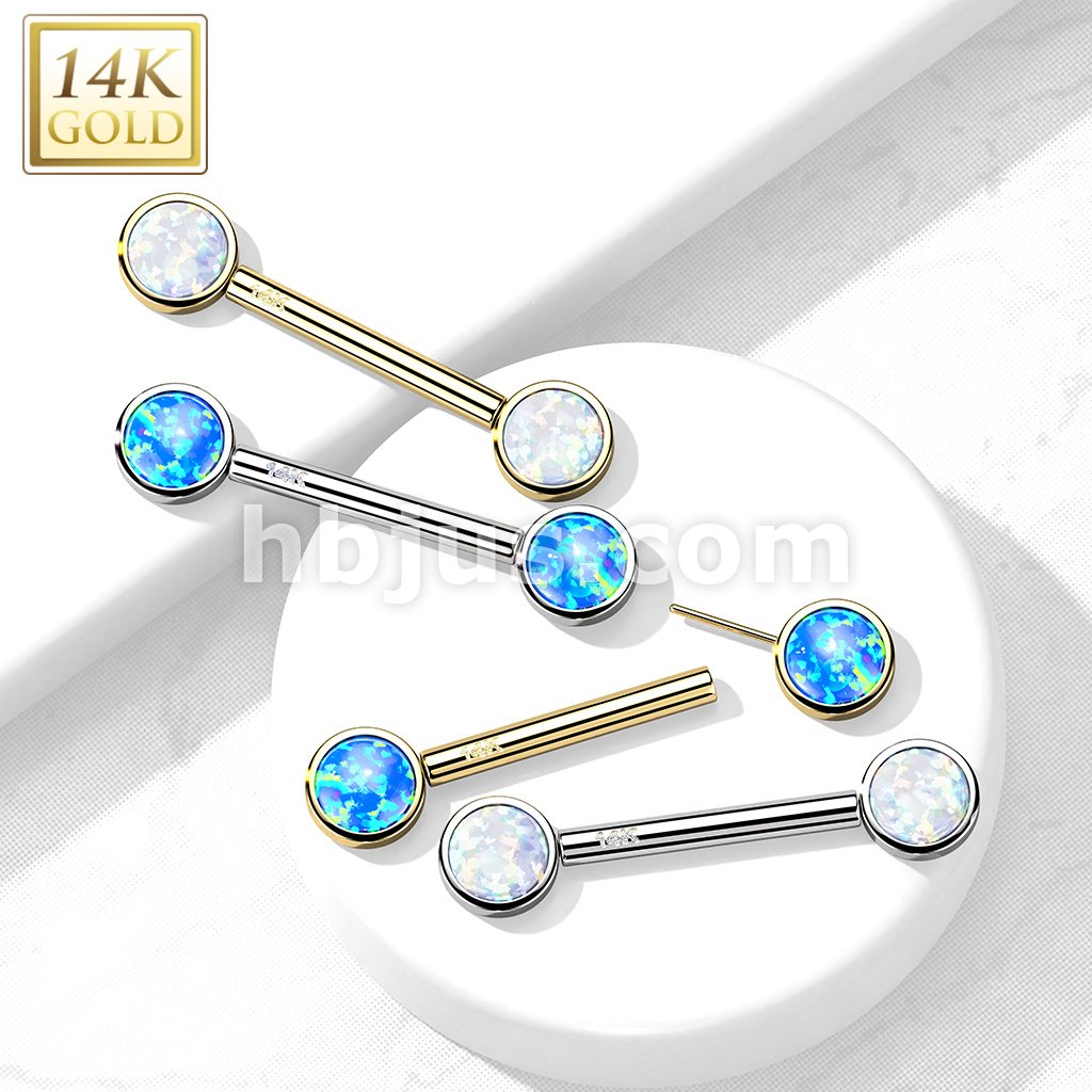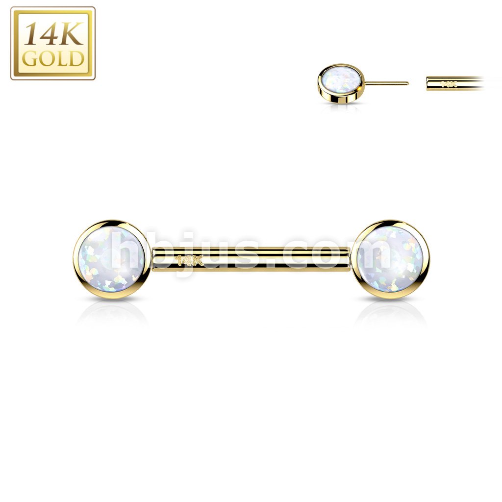 14K Gold Threadless Nipple Barbells with Round Bezel Set Opa Ends
