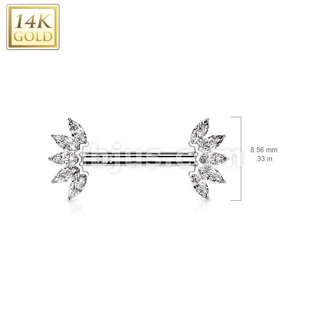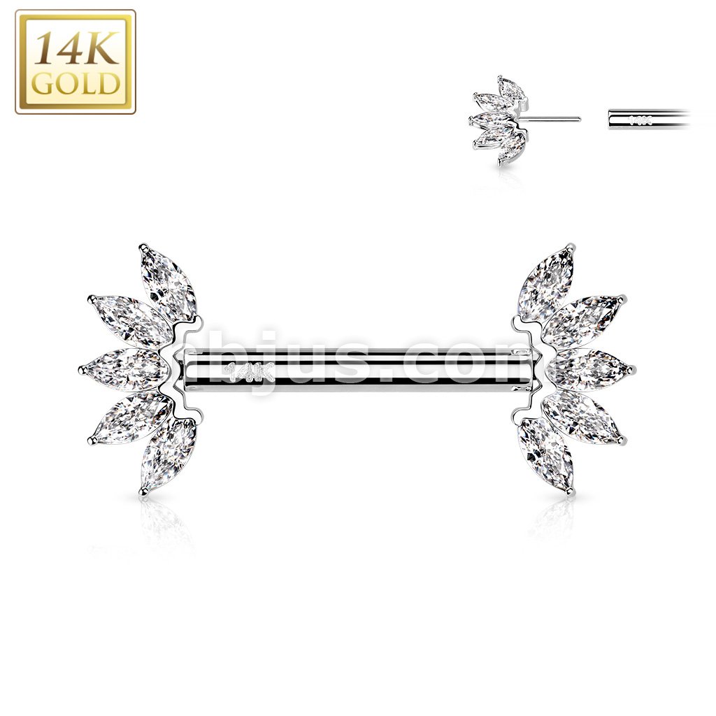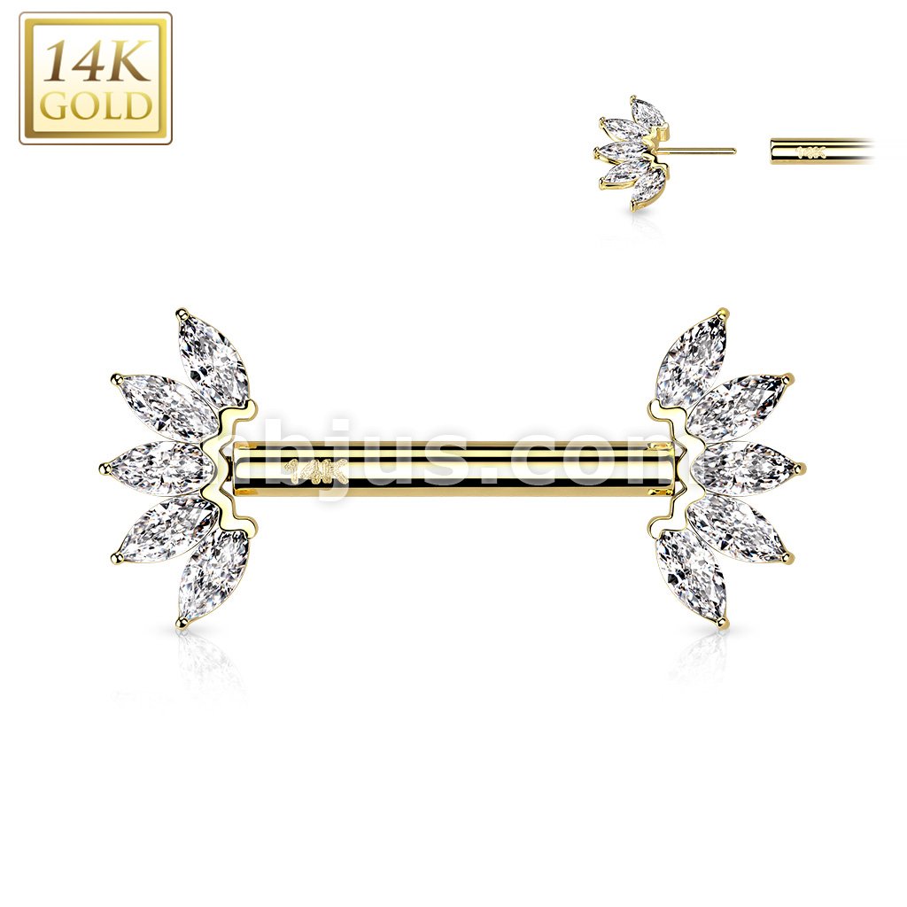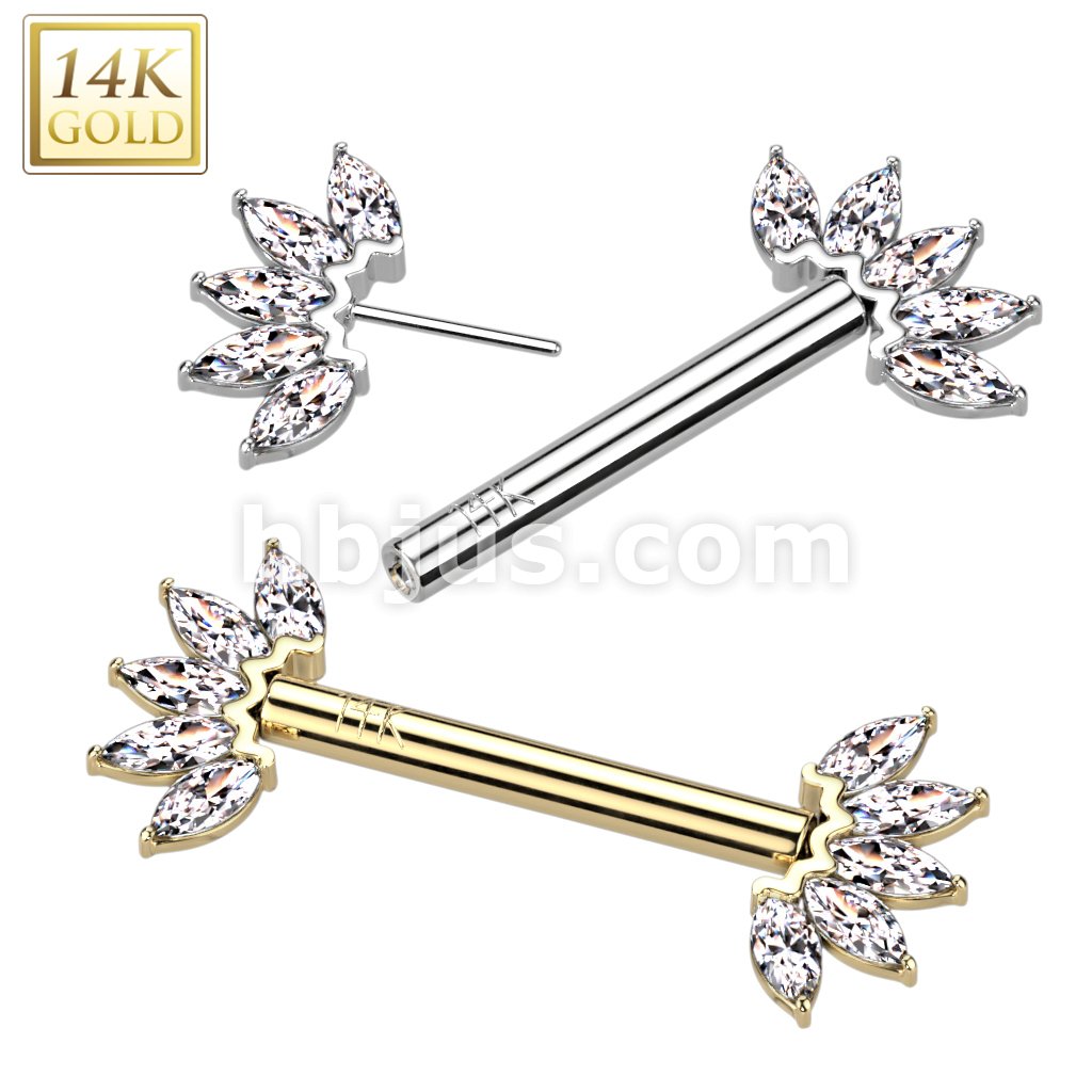 14K Gold Threadless Nipple Barbells with 5-Marquise CZ Set FanEnds
