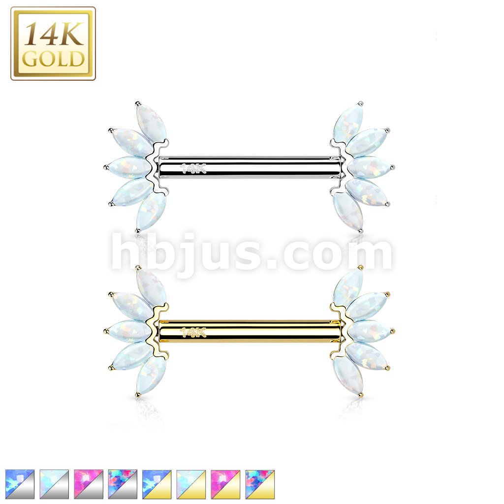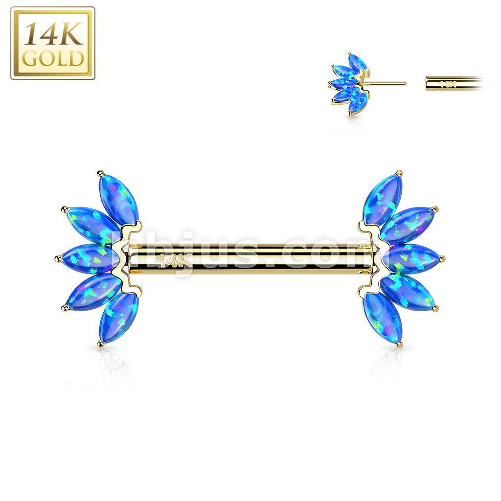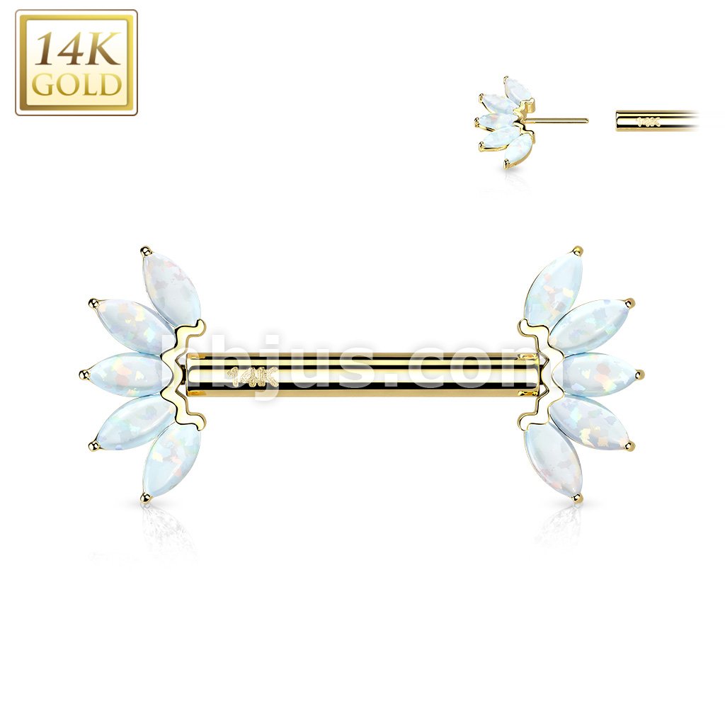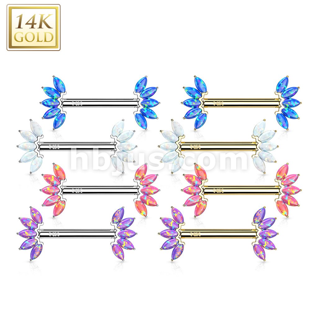 14K Gold Threadless Nipple Barbells with 5-Marquise Opa Set Fan Ends