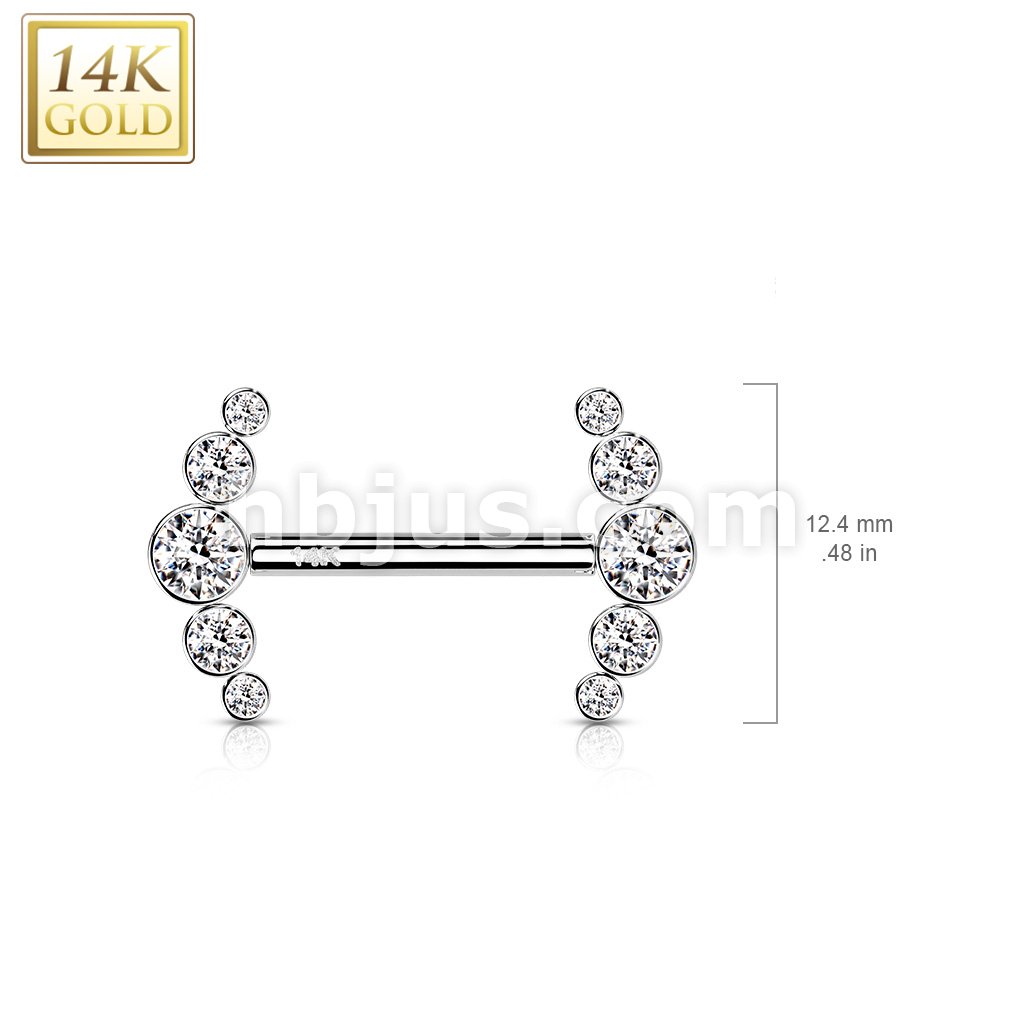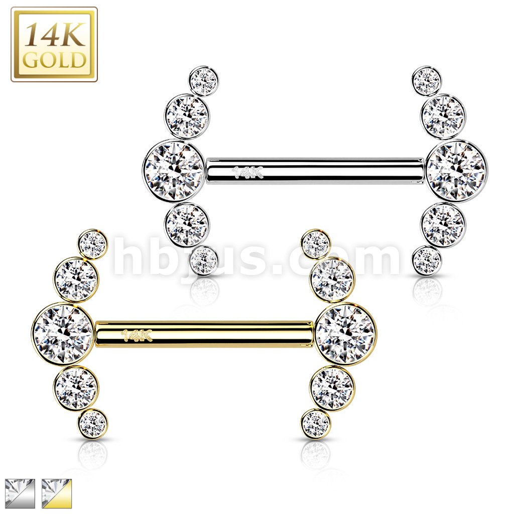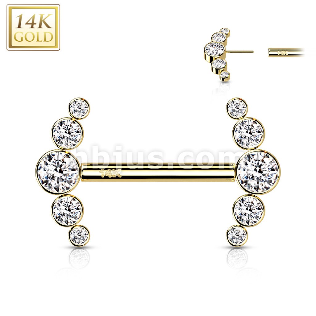 14K Gold Threadless Nipple Barbells with 5-Round CZ Bezel Set Curv Ends