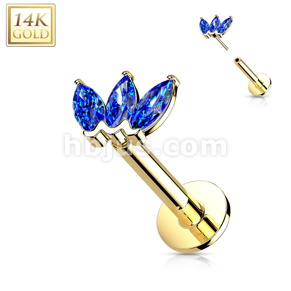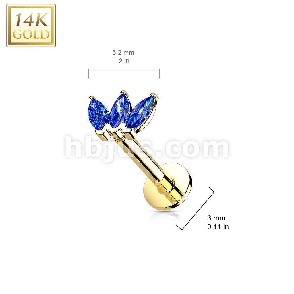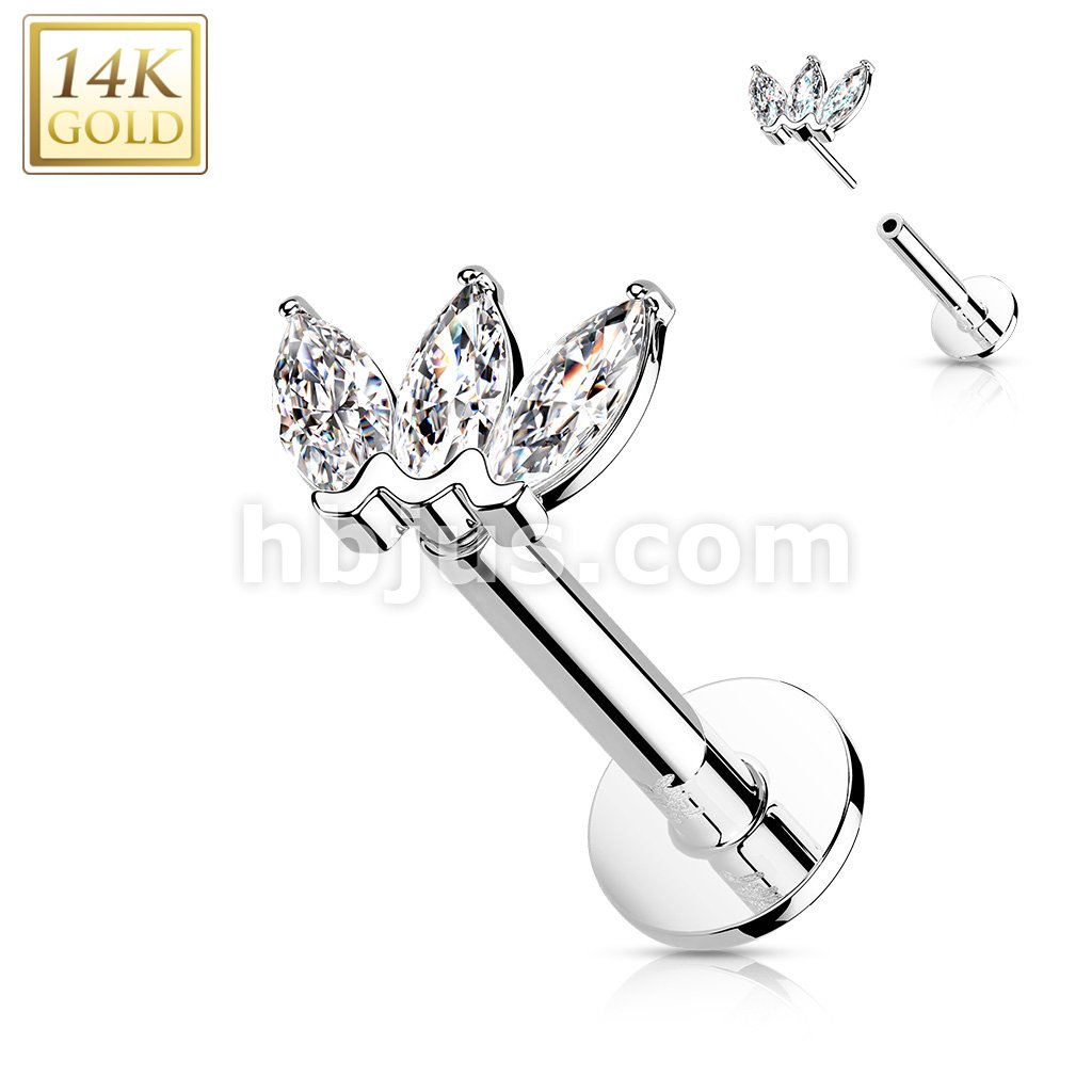 14K Gold Threadless Labret/Flat Back Stud with 3-Marquise CZ Top