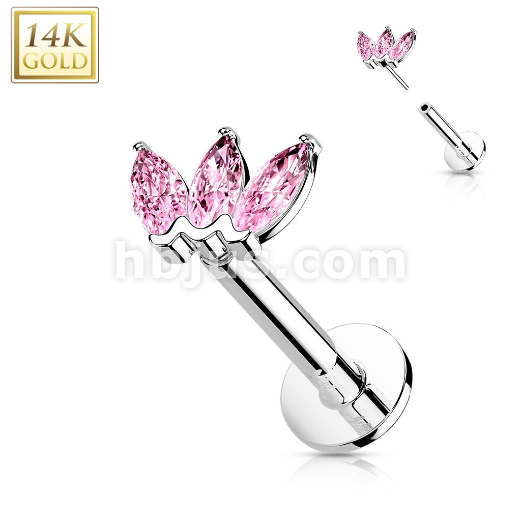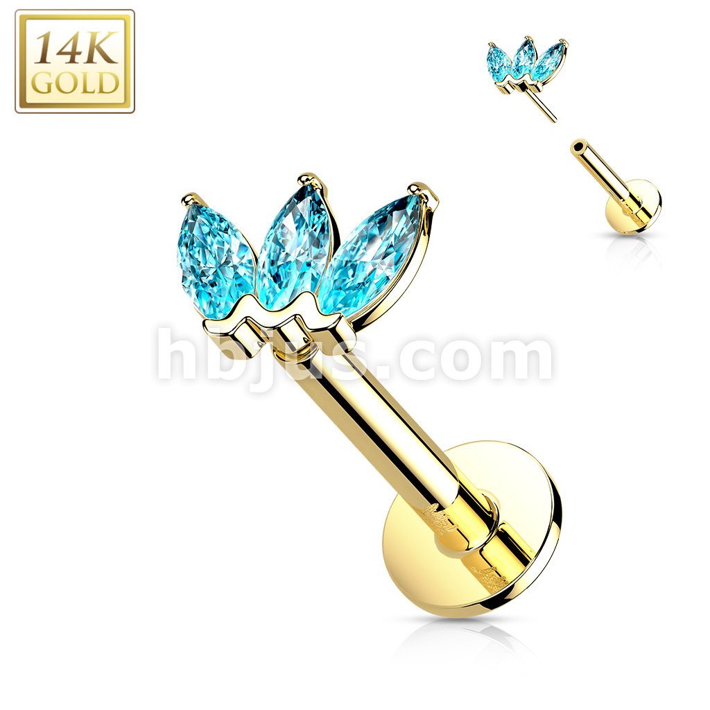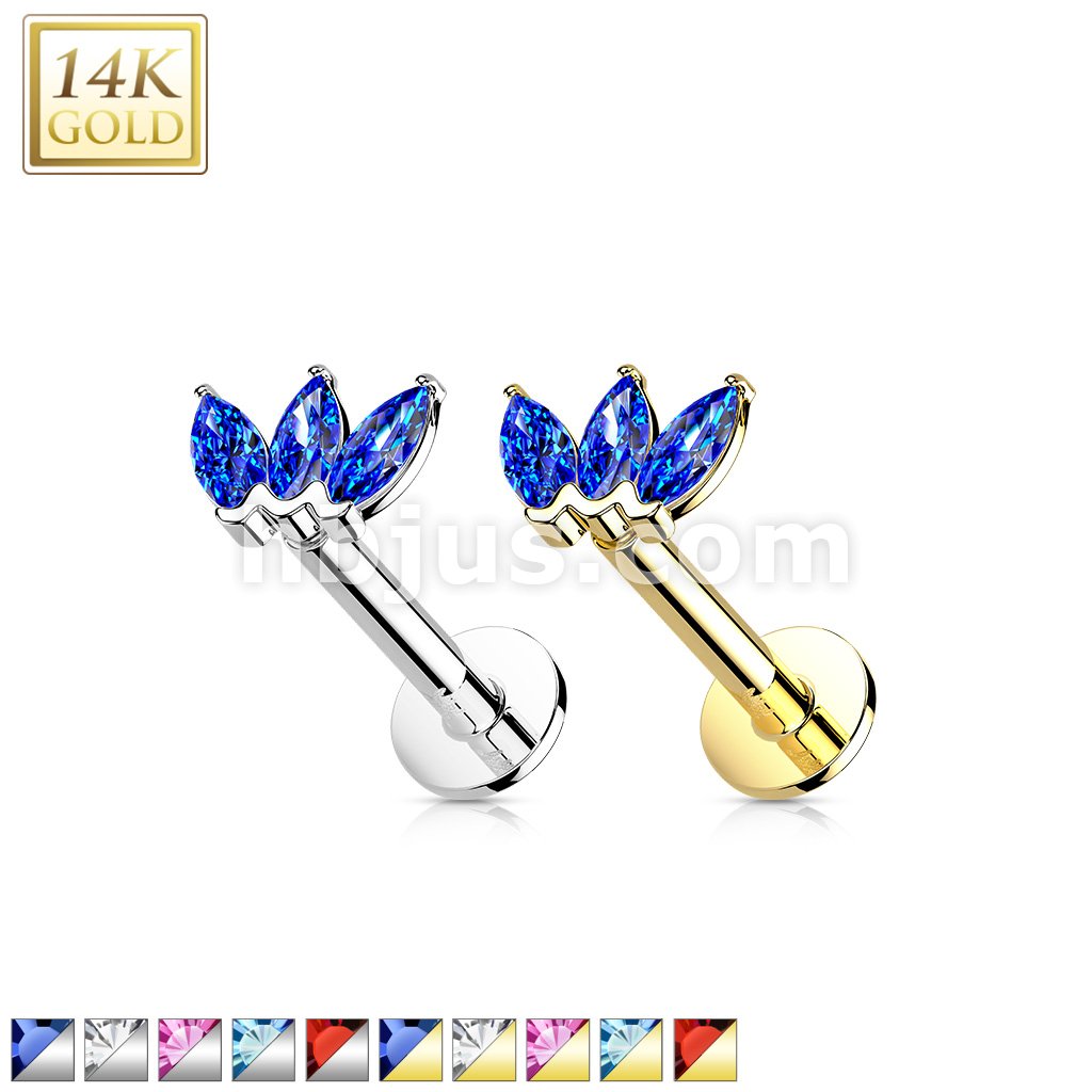 14K Gold Threadless Labret/Flat Back Stud with 3-Marquise CZ Top