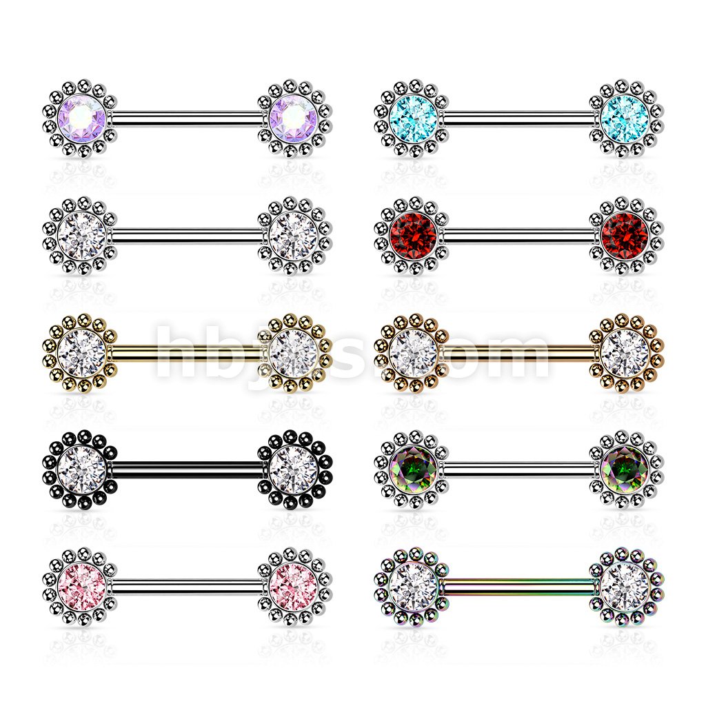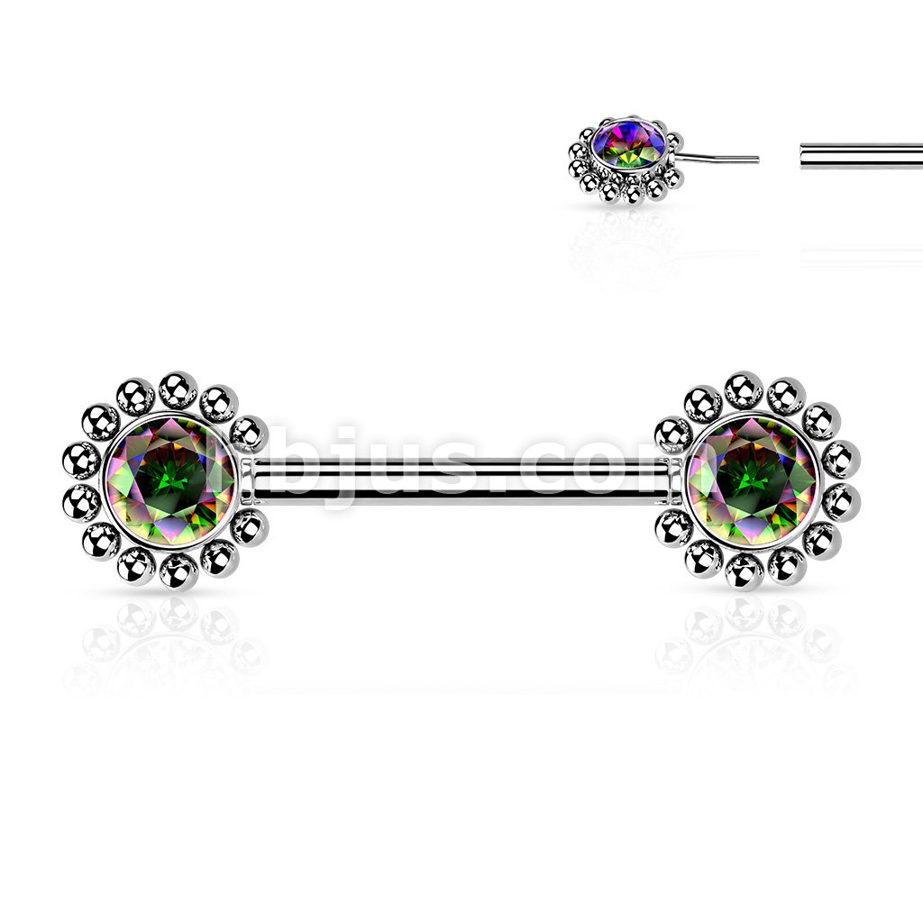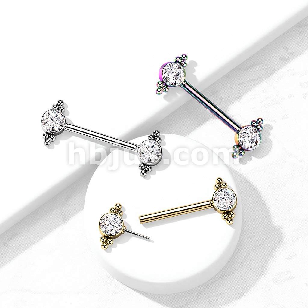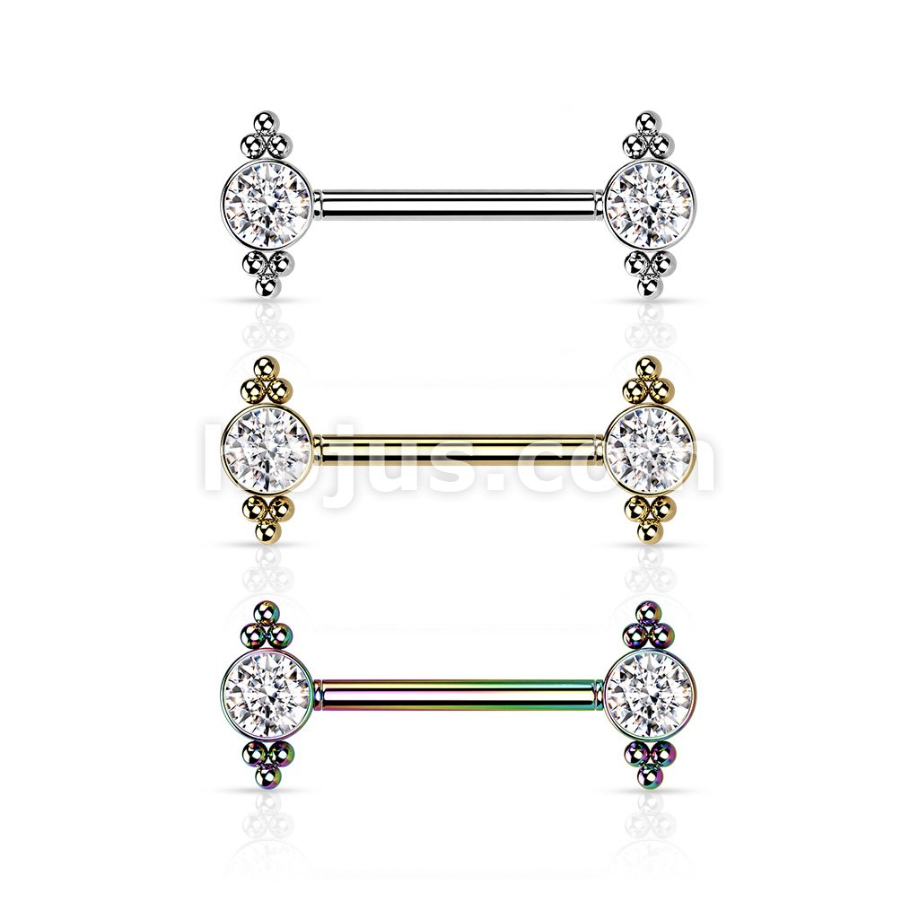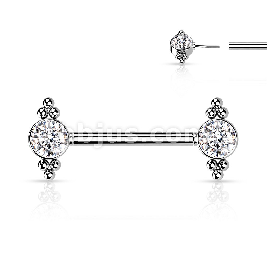 316L Surgical Steel Threadless Push In Nipple Barbell with Beaded Ball Edge and CZ Center On Each Side