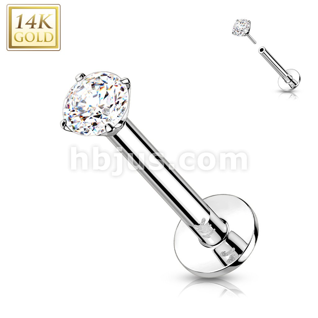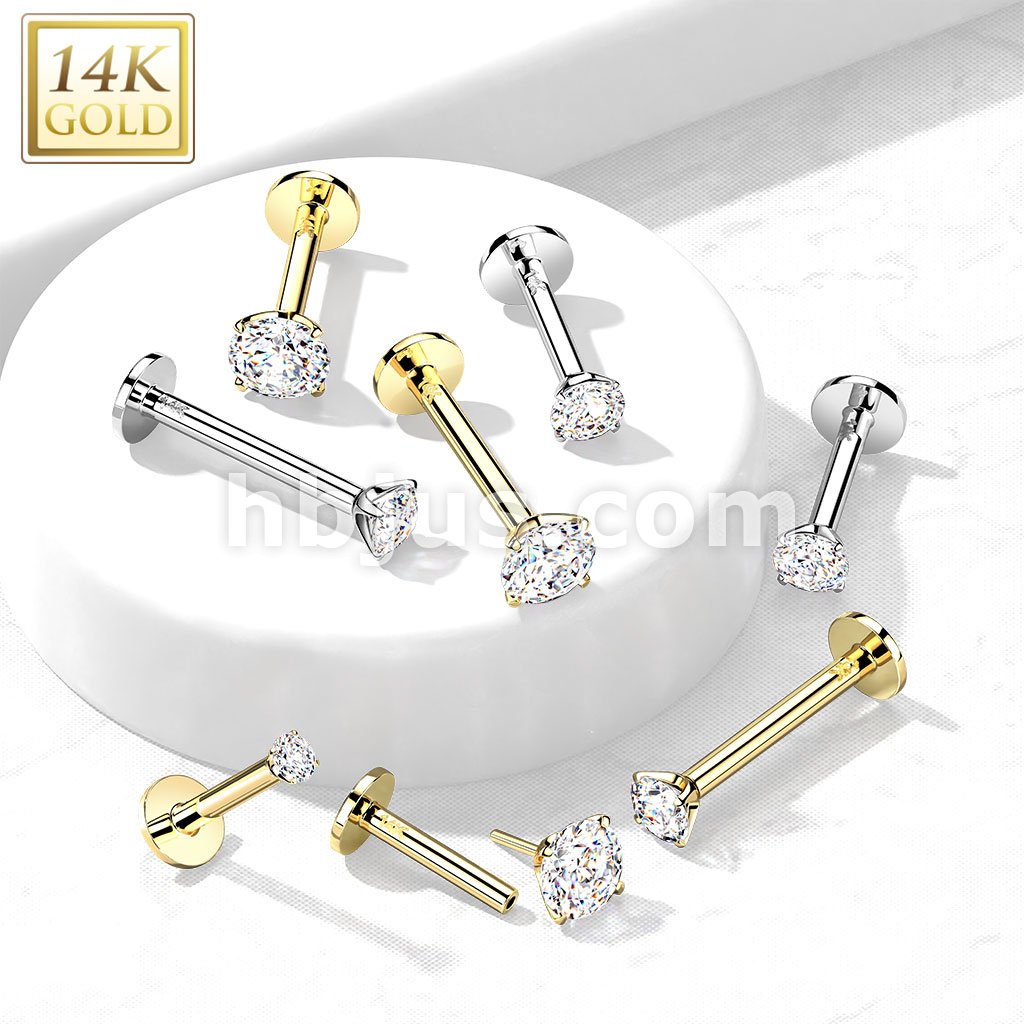 14K Gold Threadless Push-in Labret, Flat Back Studs With Prong Set CZ Top for Cartilage, Monroe and More