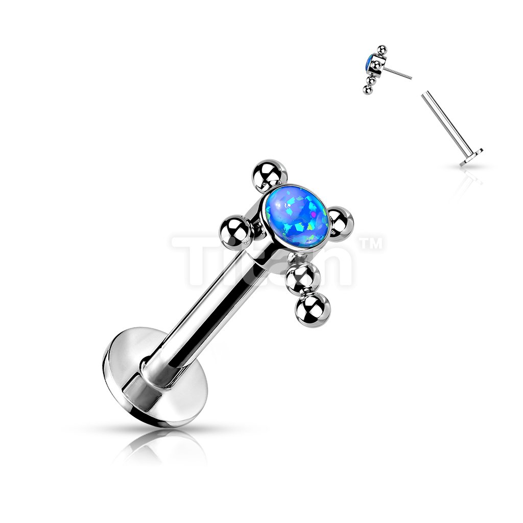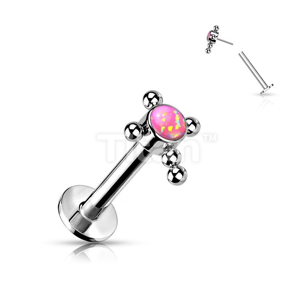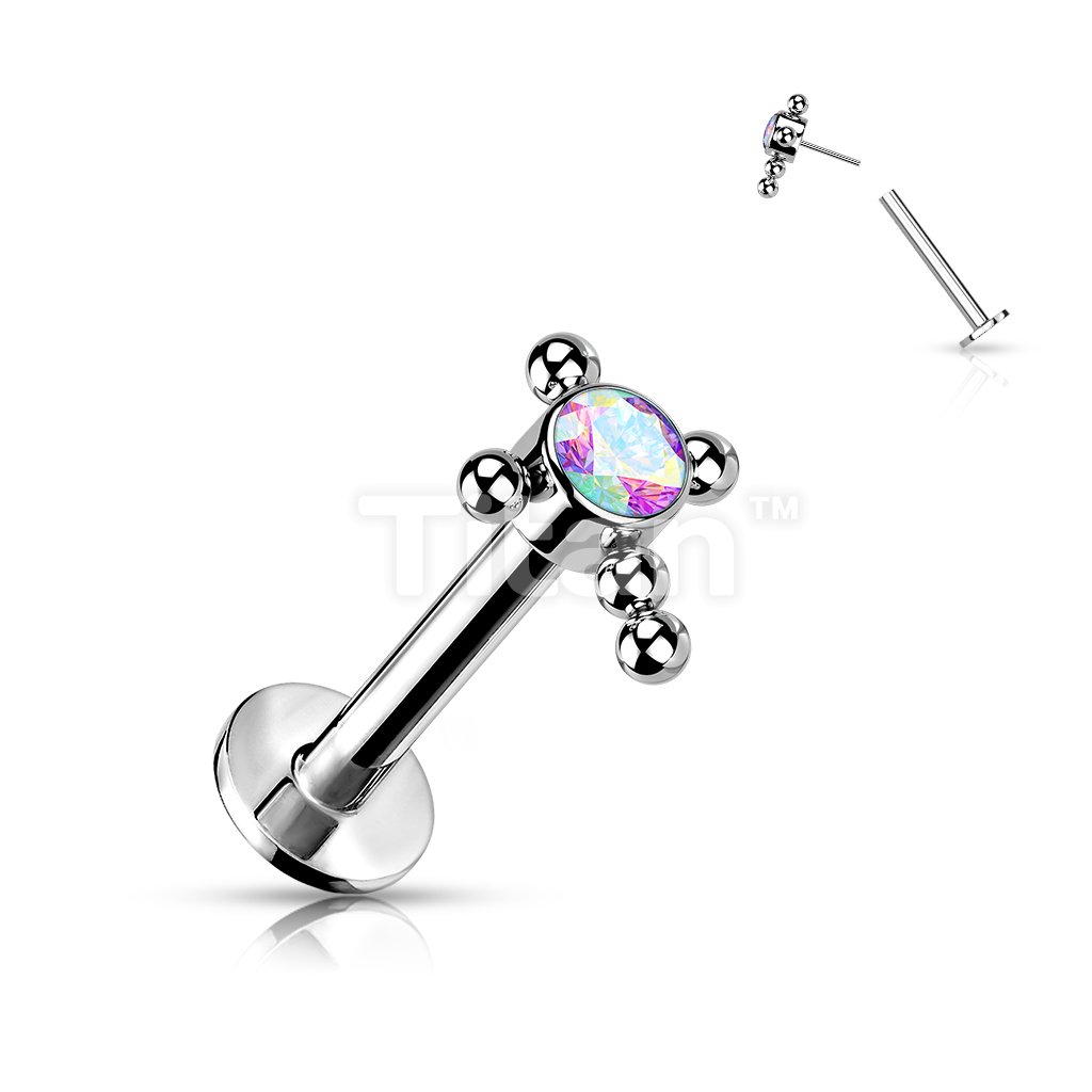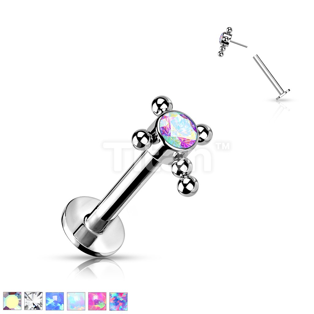 Implant Grade Titanium Threadless Push In Labret With Bezel Set CZ or Opal Center Beaded Ball Cross Top