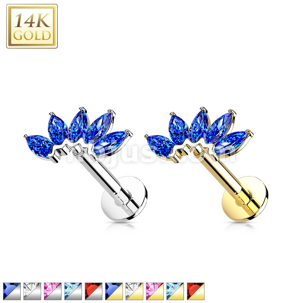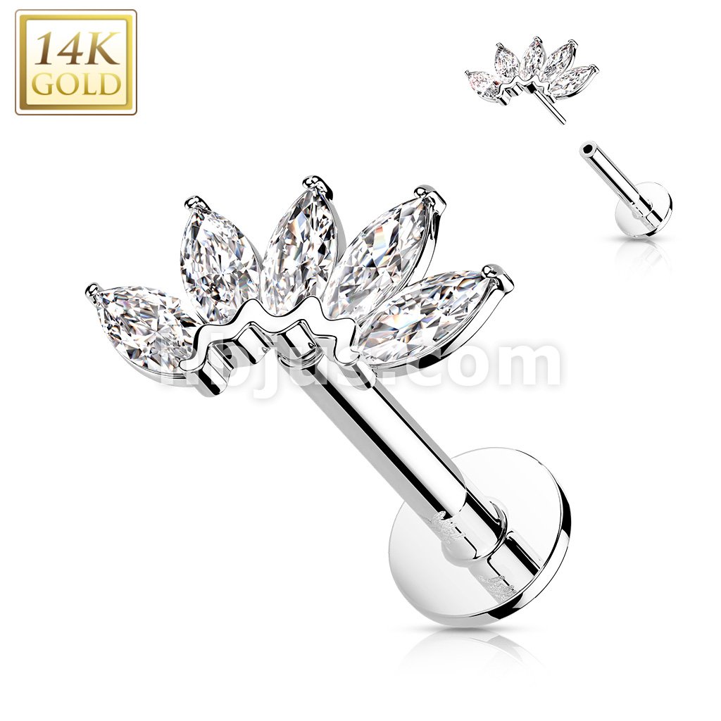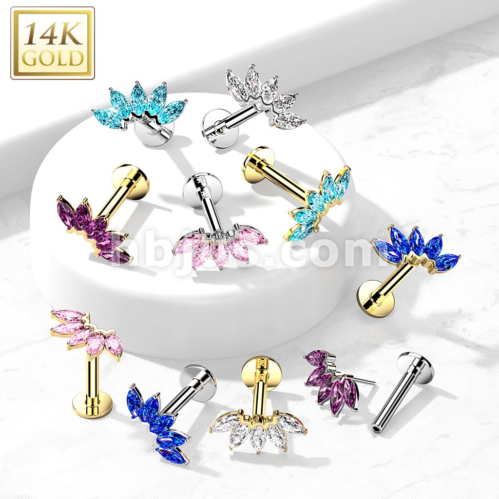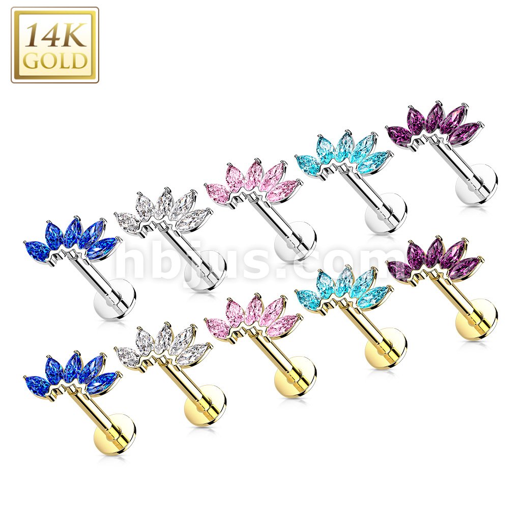 14K Gold Threadless Labret/Flat Back Stud with 5-Marquise CZ Fa Top