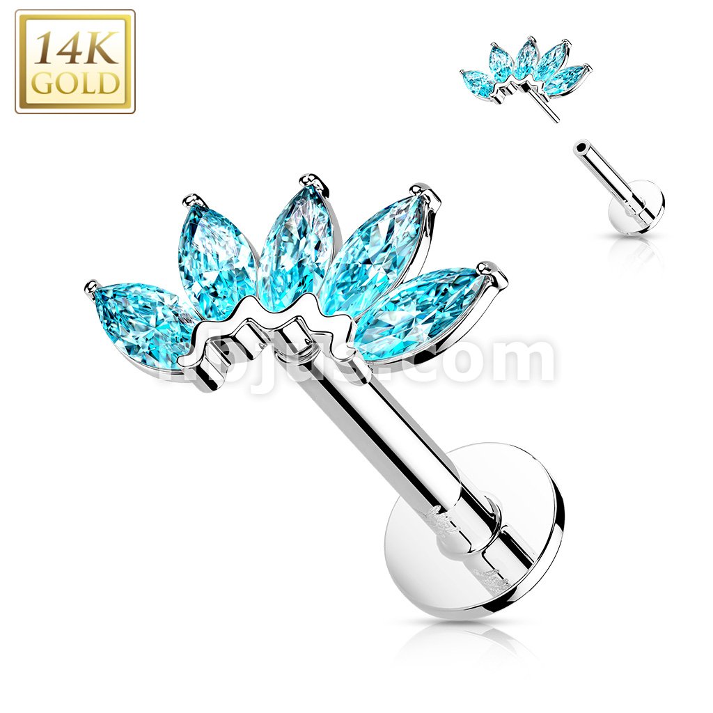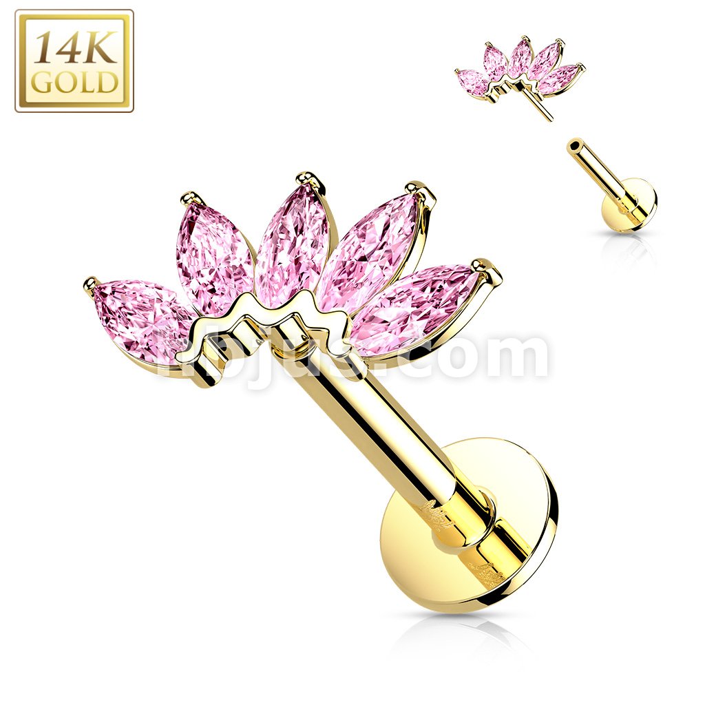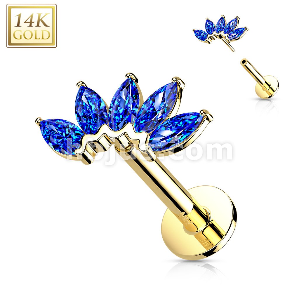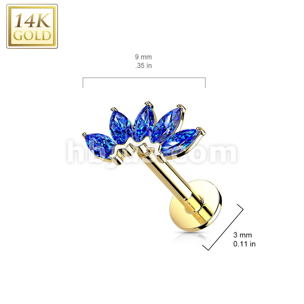 14K Gold Threadless Labret/Flat Back Stud with 5-Marquise CZ Fa Top