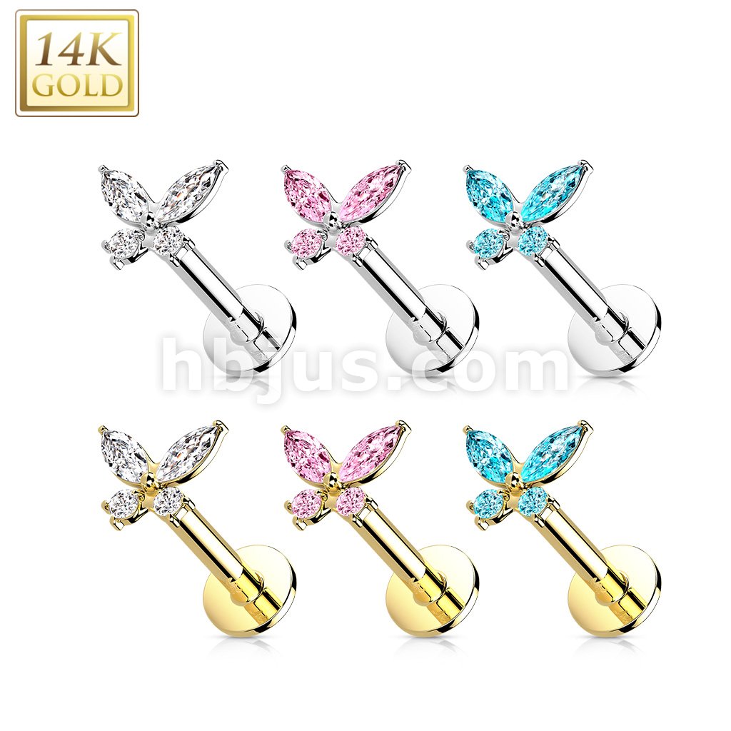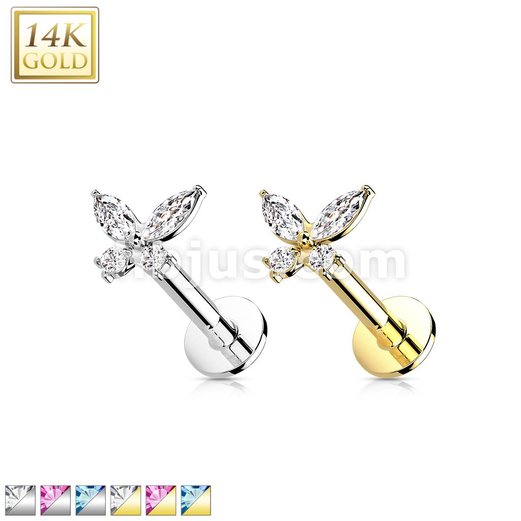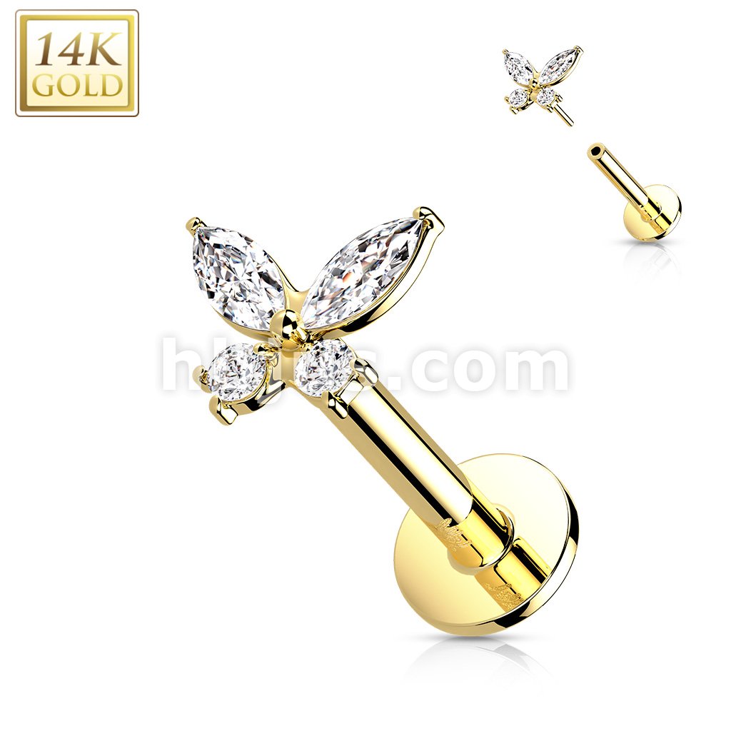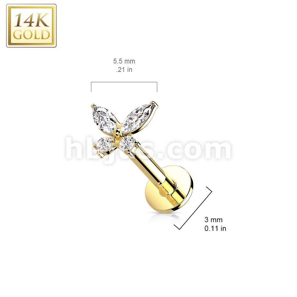 14K Gold Threadless Labret/Flat Back Stud with CZ ButterflTop