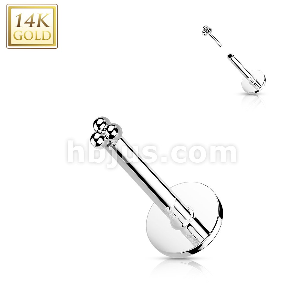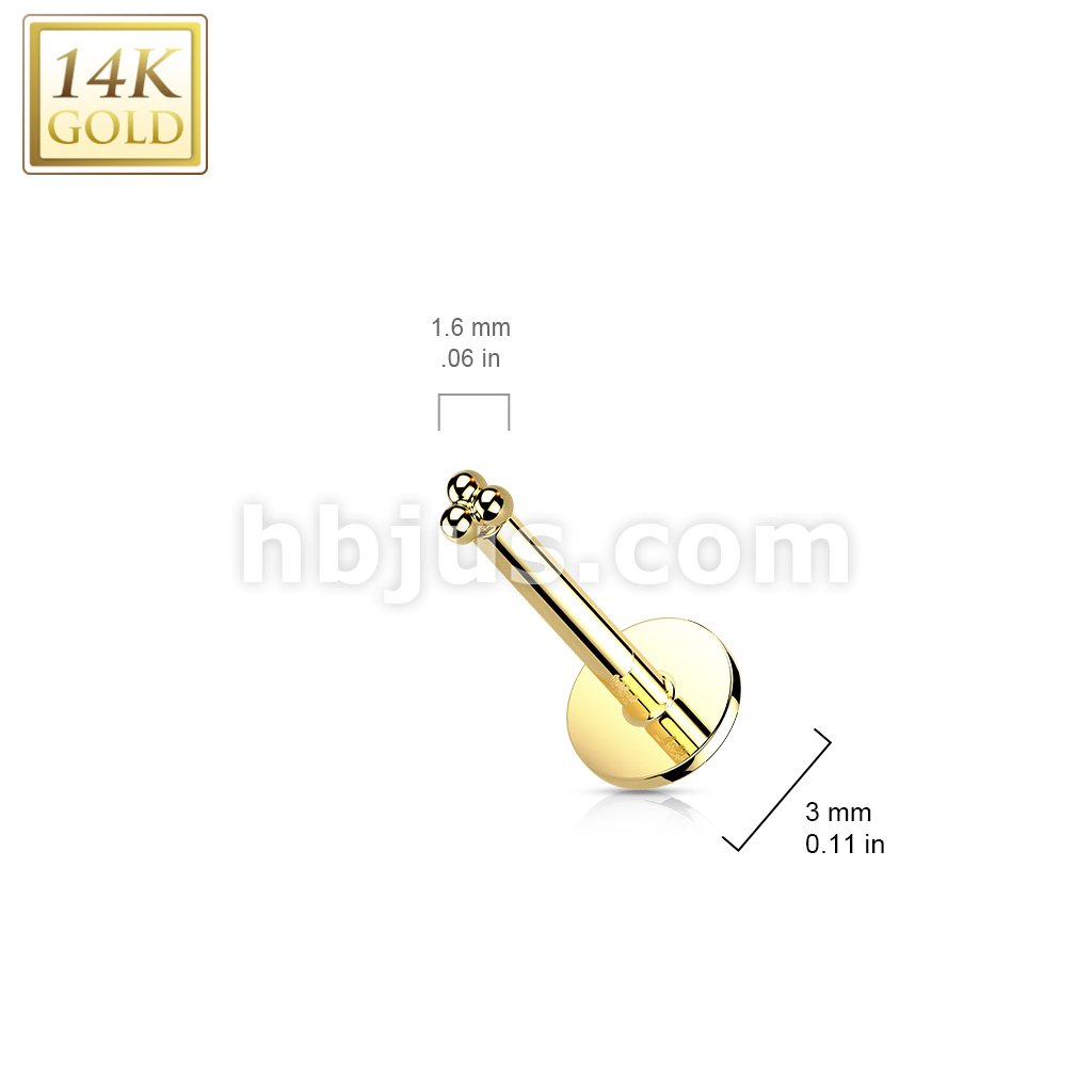 14K Gold Threadless Labret/Flat Back Stud with 3-Ball Triangle To