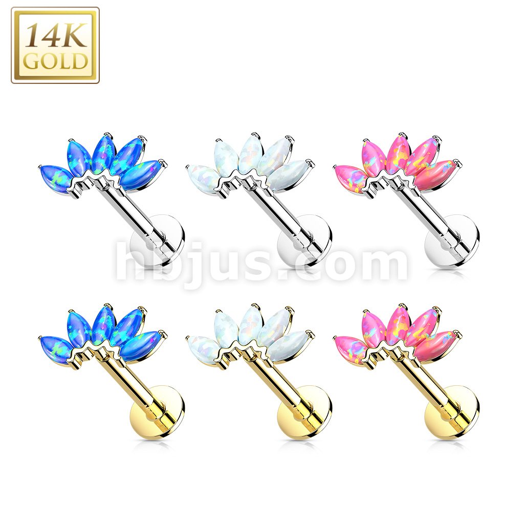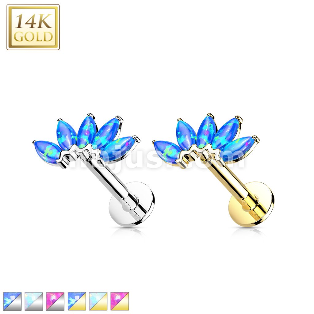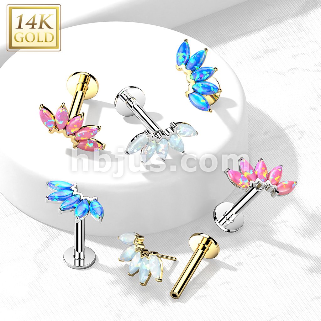 14K Gold Threadless Labret/Flat Back Stud with 5-Marquise Opal FanTop