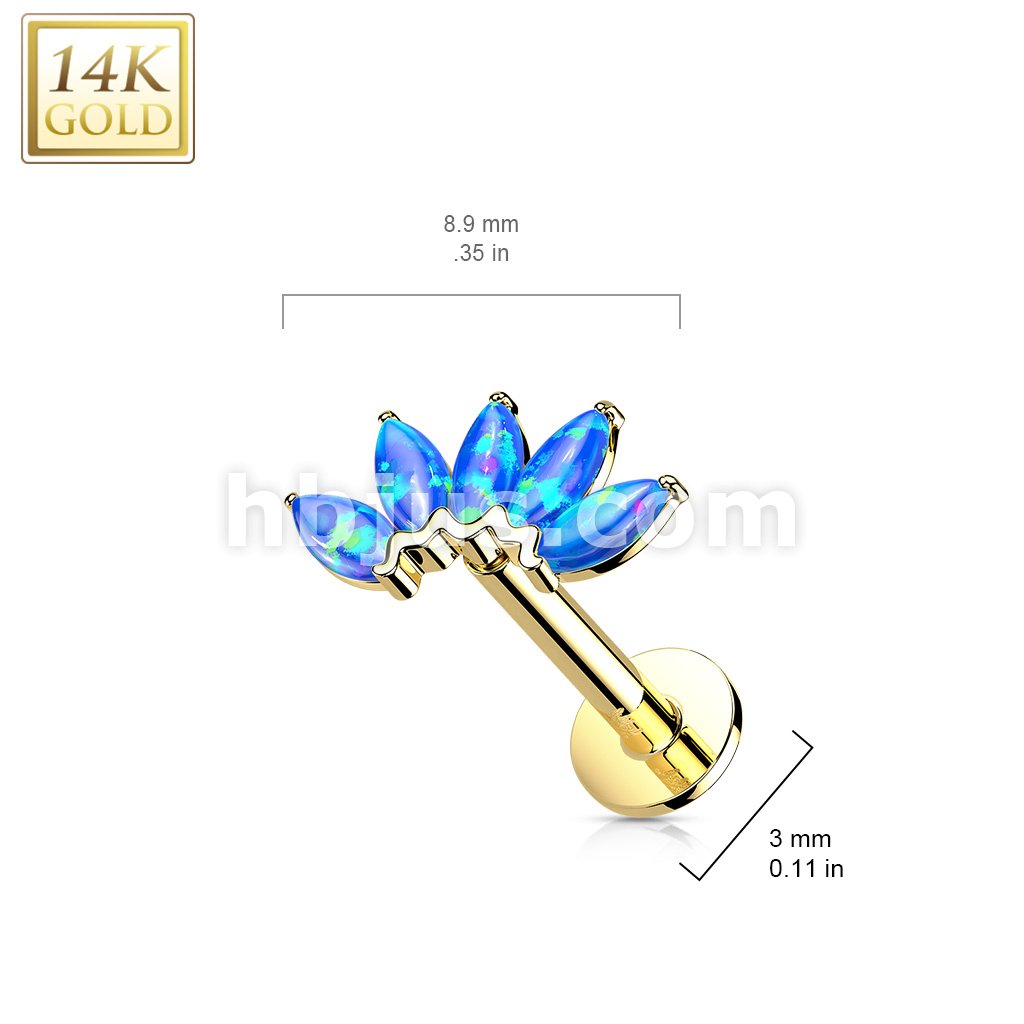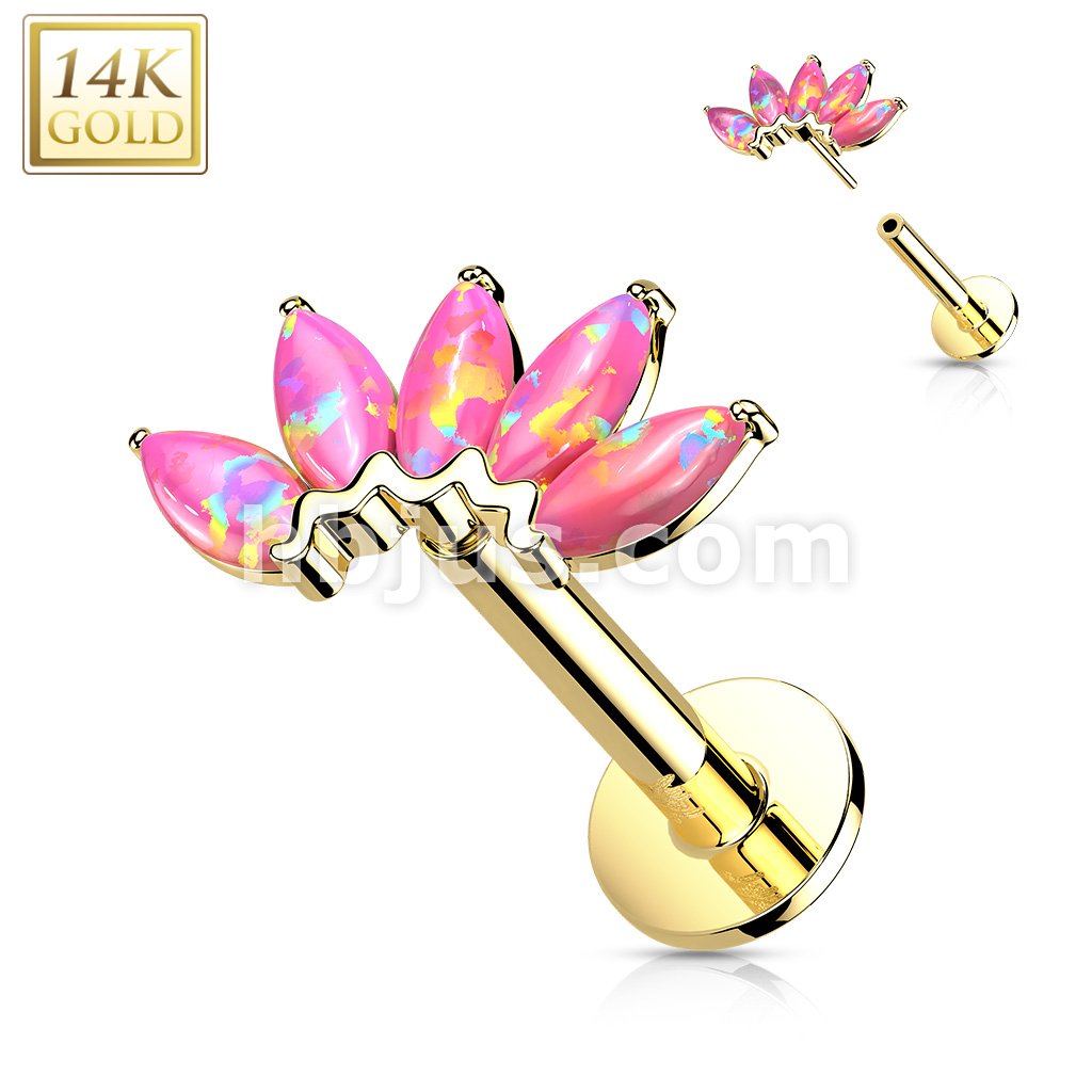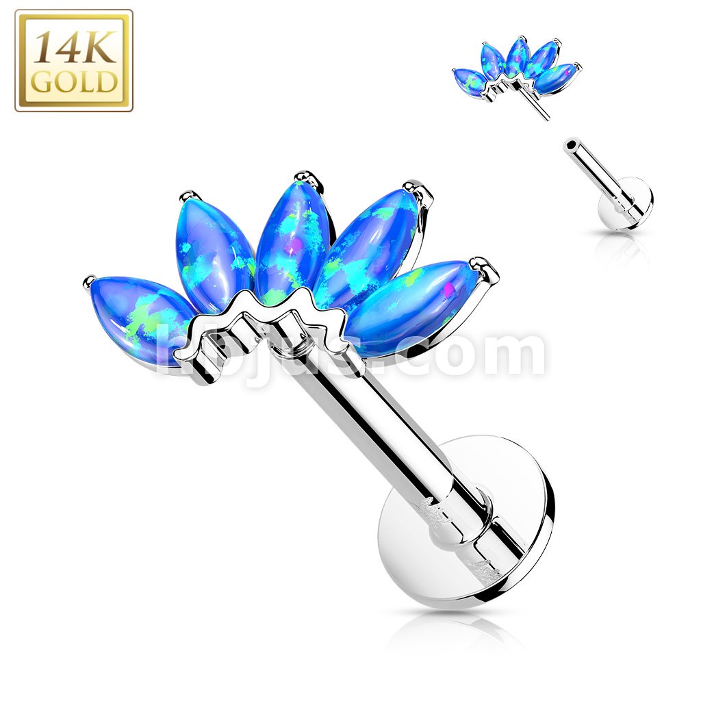 14K Gold Threadless Labret/Flat Back Stud with 5-Marquise Opal FanTop