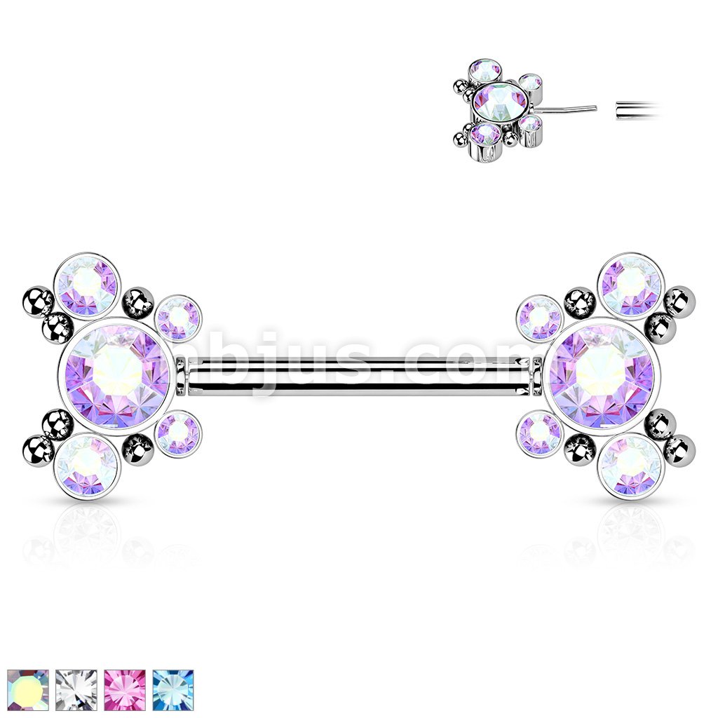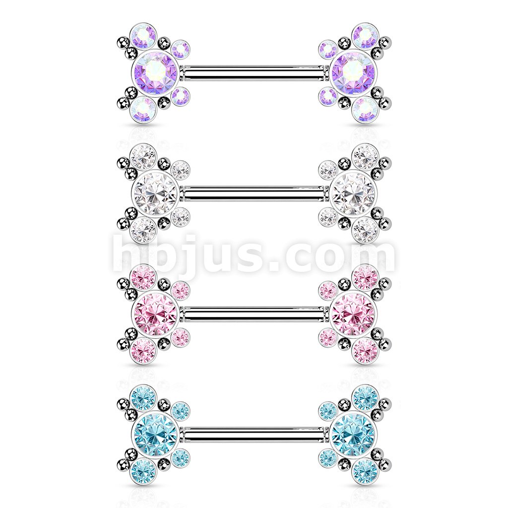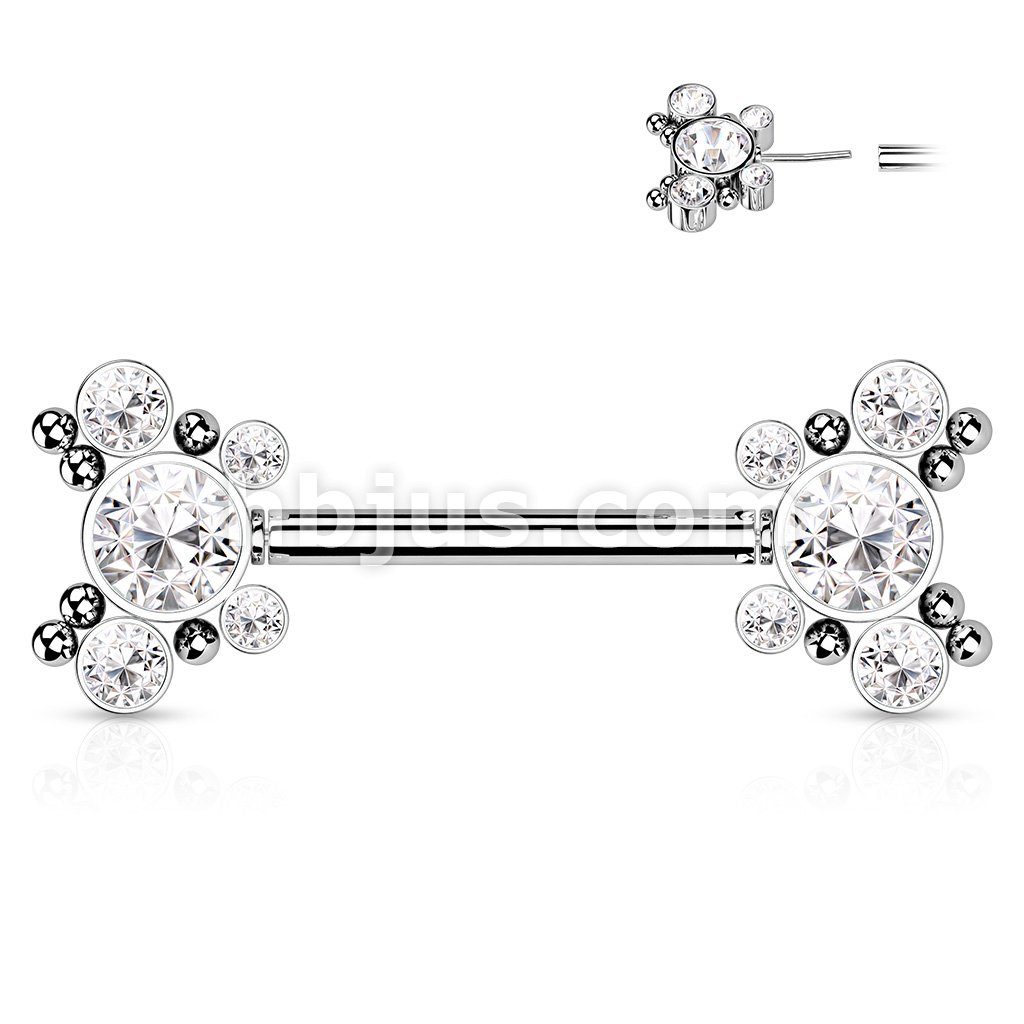 316L Surgical Steel Threadless Push In Nipple Barbell with 4 CZ and Ball Cluster On Each Side
